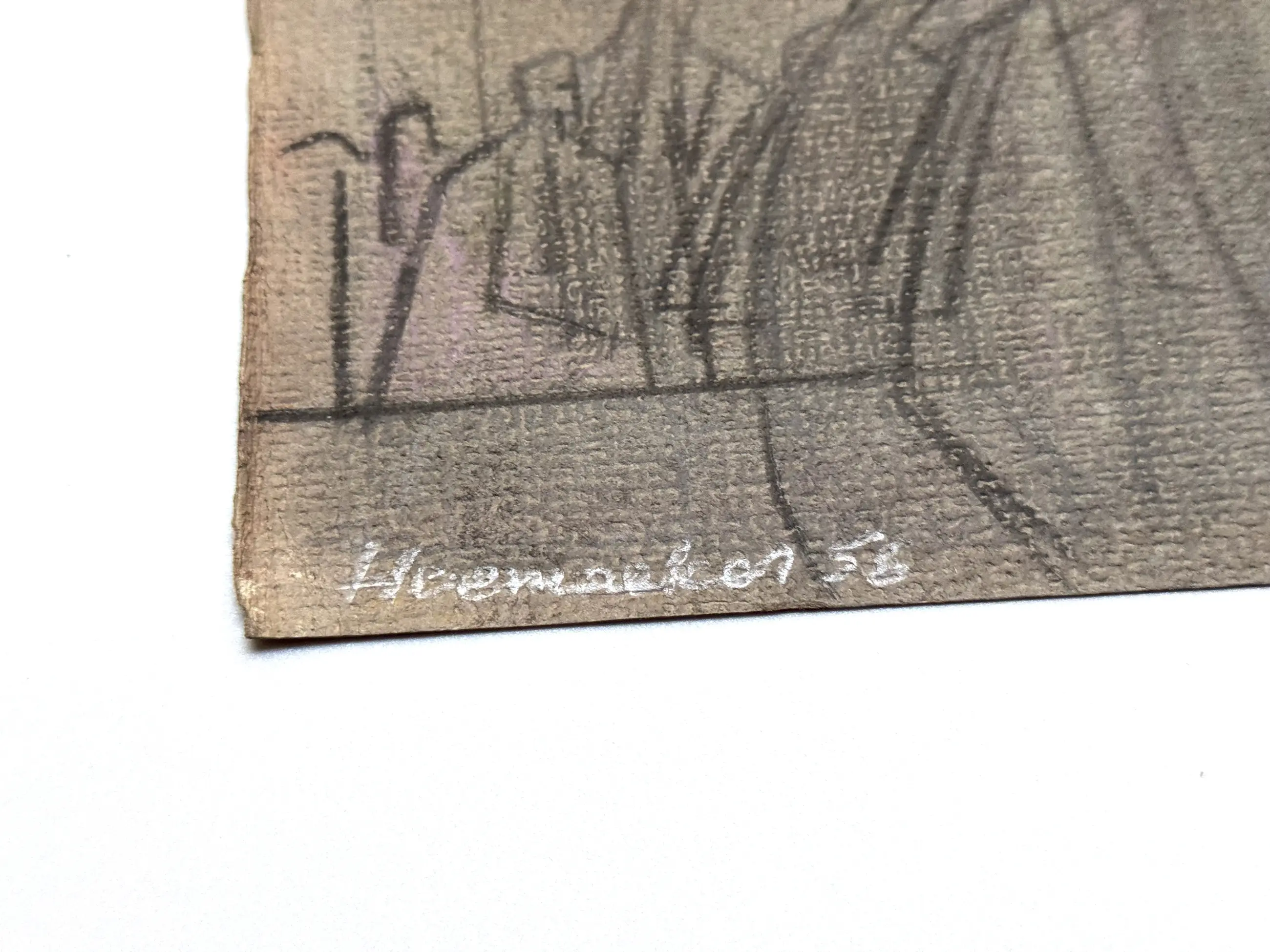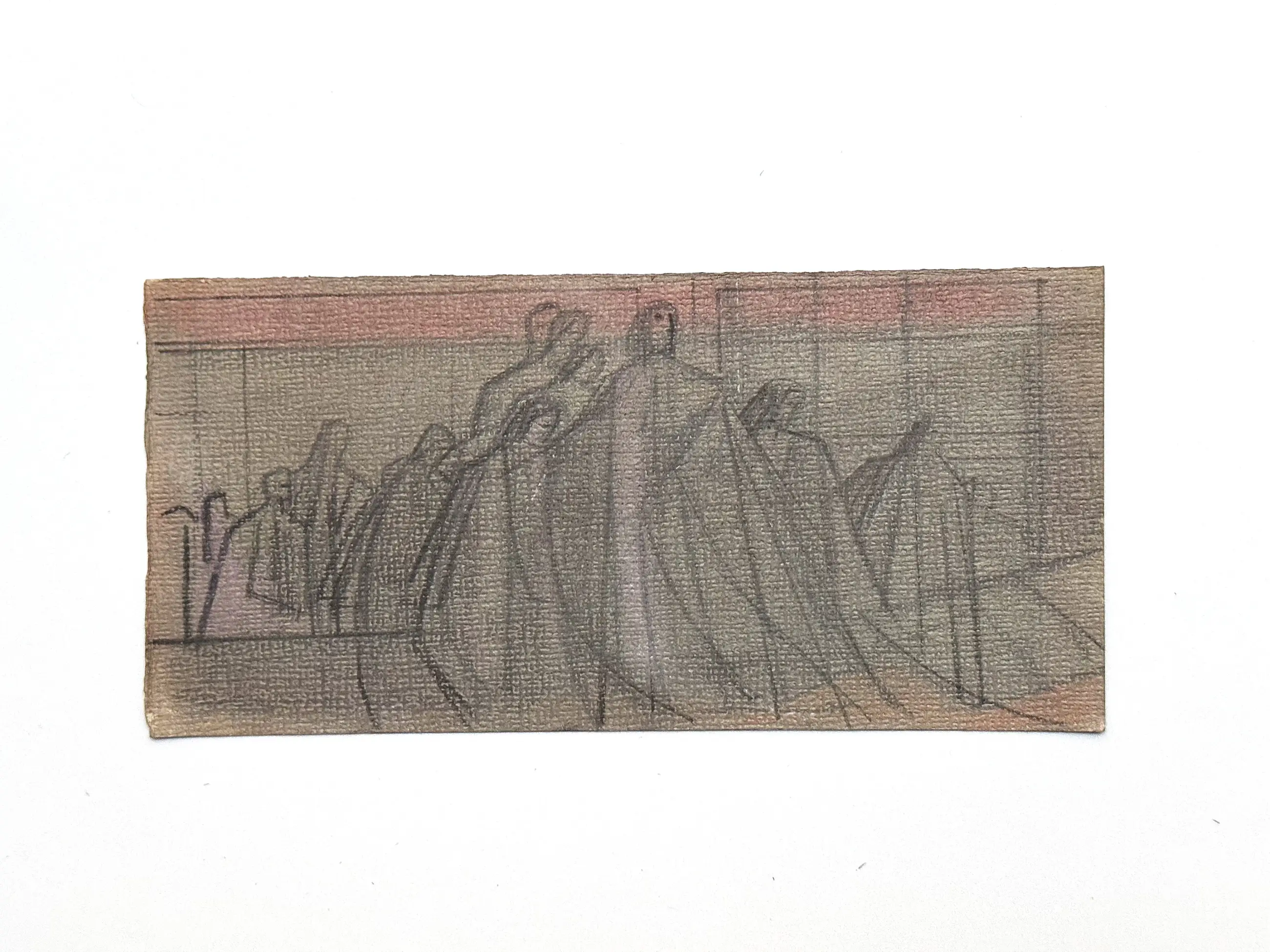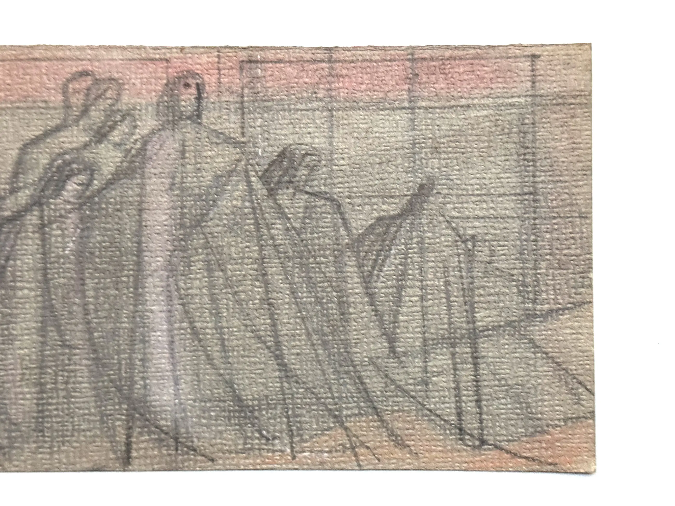 In dit compacte maar resonante werk distilleert Jozef Hoemaeker de menselijke vorm tot spectrale contouren, gerangschikt in een stille, ritmische processie. Zijn kenmerkende stijl – gekenmerkt door subtiele gradiënten, verzachte contouren en architectonische kalmte – geeft de scène een gevoel van stille ernst. De figuren lijken zowel geaard als vluchtig, alsof ze gevangen zitten tussen gebaar en ontbinding, een echo van thema's van vergankelijkheid die in zijn hele oeuvre terugkomen.