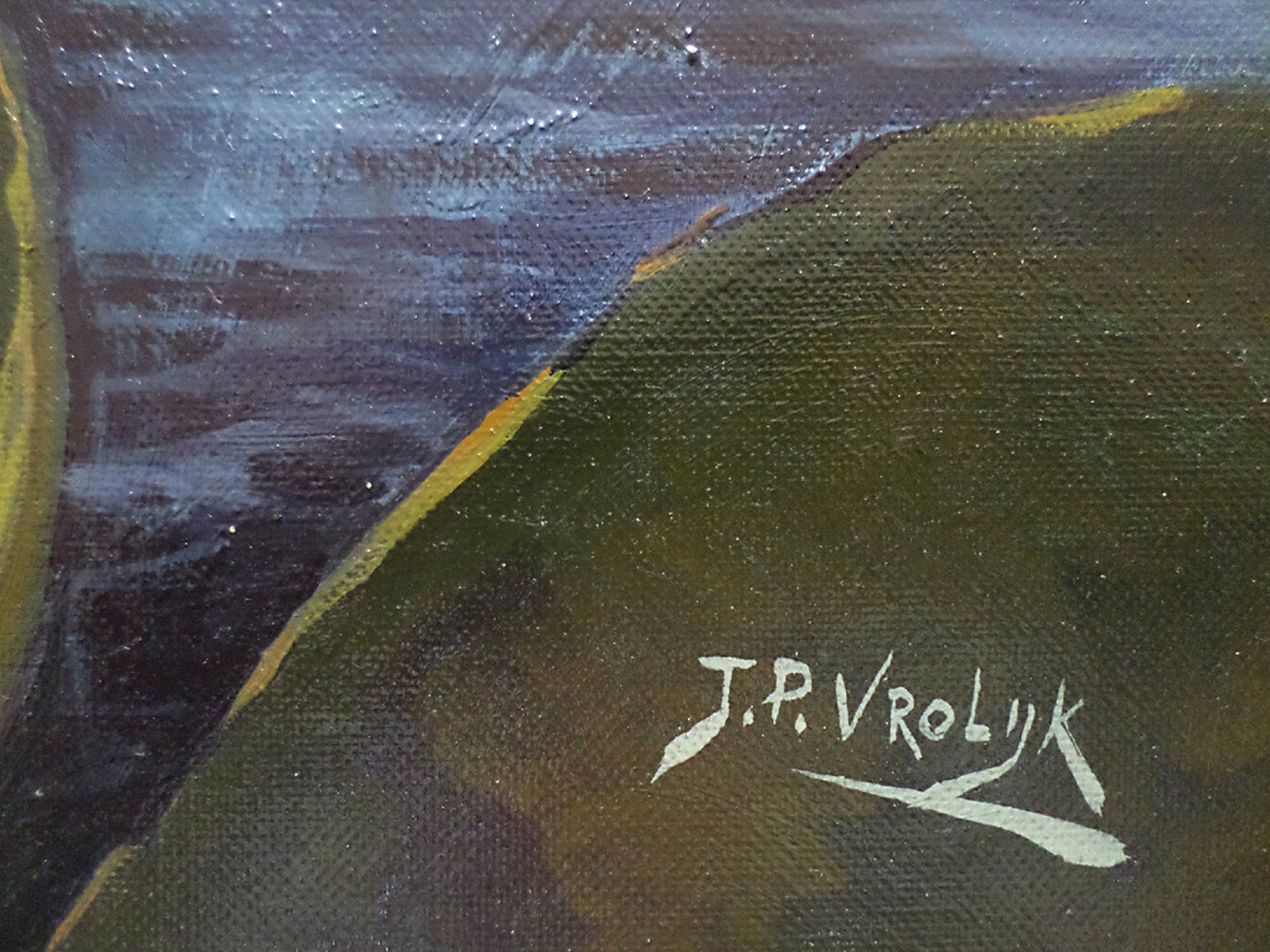 Schitterend fris geschilderd werk van J.P. Vrolijk. Olieverf op doek, gesigneerd rechtsonder, in nette lijst. Echt een werk waar je verliefd op kunt worden, maar eerst moet de eventuele koper een vijftal gaatjes in het doek aan de bovenkant van het schilderij, het “lucht” gedeelte, (laten) repareren. Zijn geen grote gaatjes, ongeveer de grootte van een spijkerkop. Zie foto.