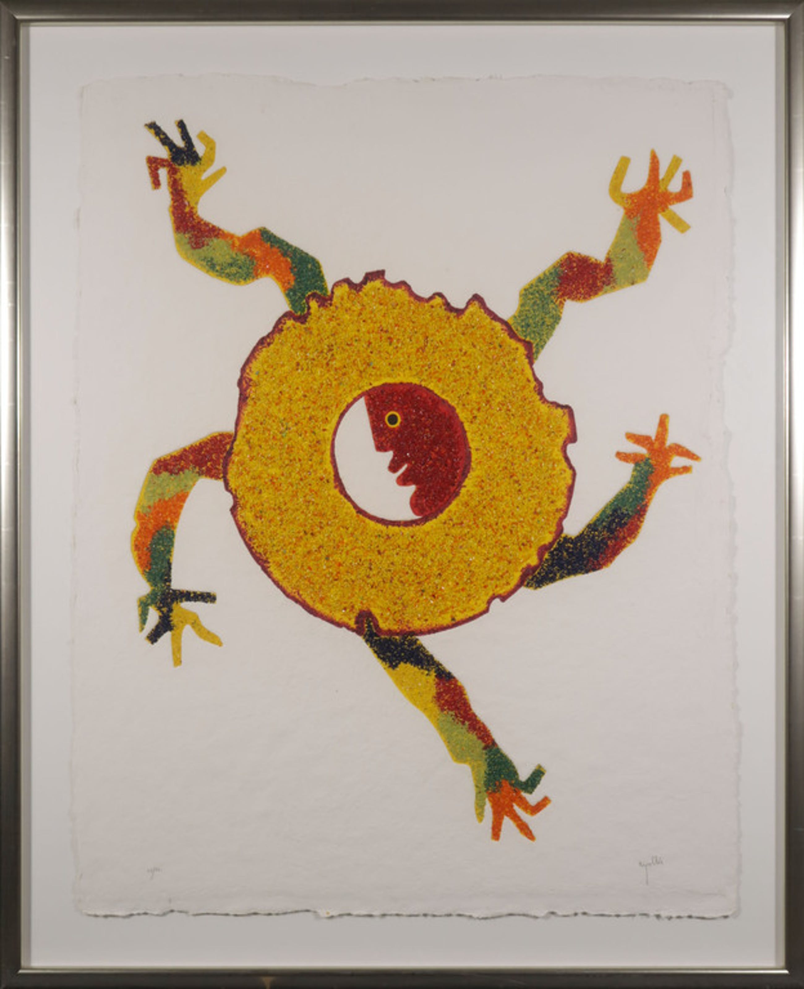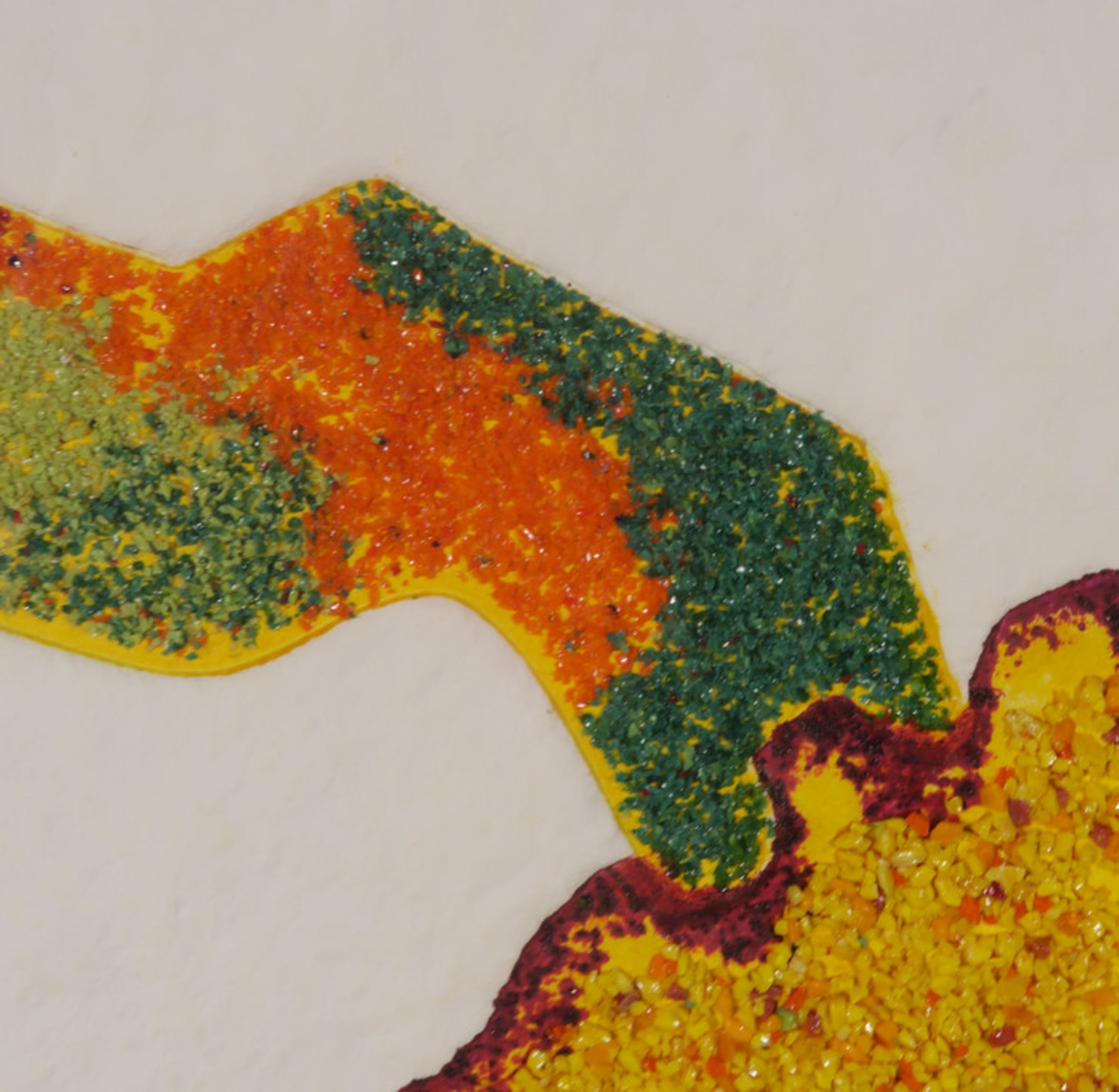 Materiaal: Carborundum en gekleurde steentjes op geschept papier