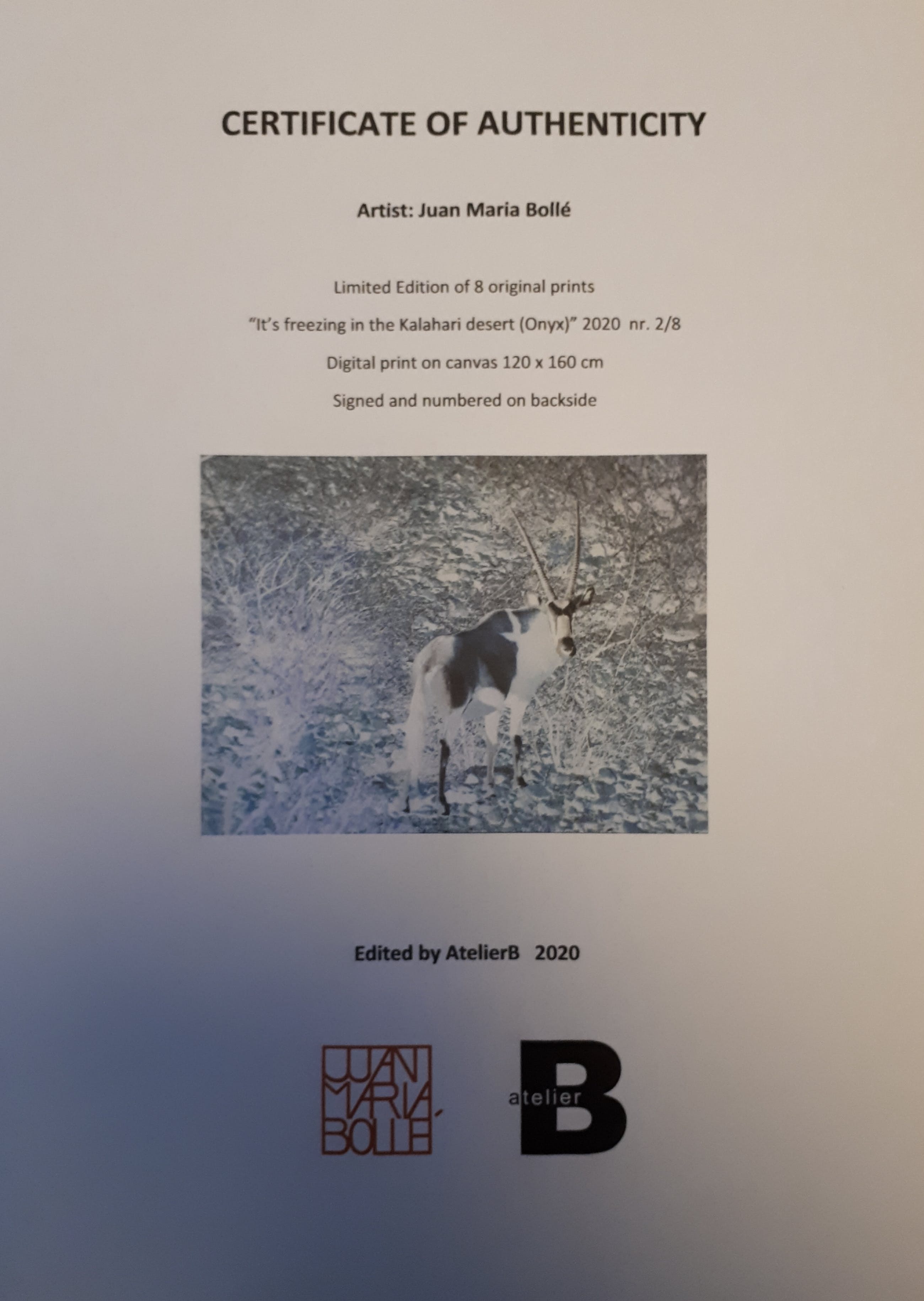 Juan Maria Bollé is een hedendaags Belgisch kunstenaar met Spaanse roots, die al meer dan 30 jaar als kunstenaar actief is. Hij stelde tentoon in binnen- en buitenland en zijn werk is opgenomen in verschillende openbare- en privé collecties. Juan Maria Bollé maakt zowel schilderkunst, grafiek als kunstfotografie. Dit werkt komt uit the serie "It's freezing in the Kalahari desert" en is een limited edition van 2/8. Het werk toont een Onyx in the Kalahari woestijn van Namibië. Juan Maria Bollé maakte dit kunstwerk na een reis door Namibië. Het is een monumentale foto (120 x 160 cm) geprint op doek, van een Onyx in zijn natuurlijke habitat met een bevreemdende uitstraling, in een mysterieus blauw wit grijs coloriet.