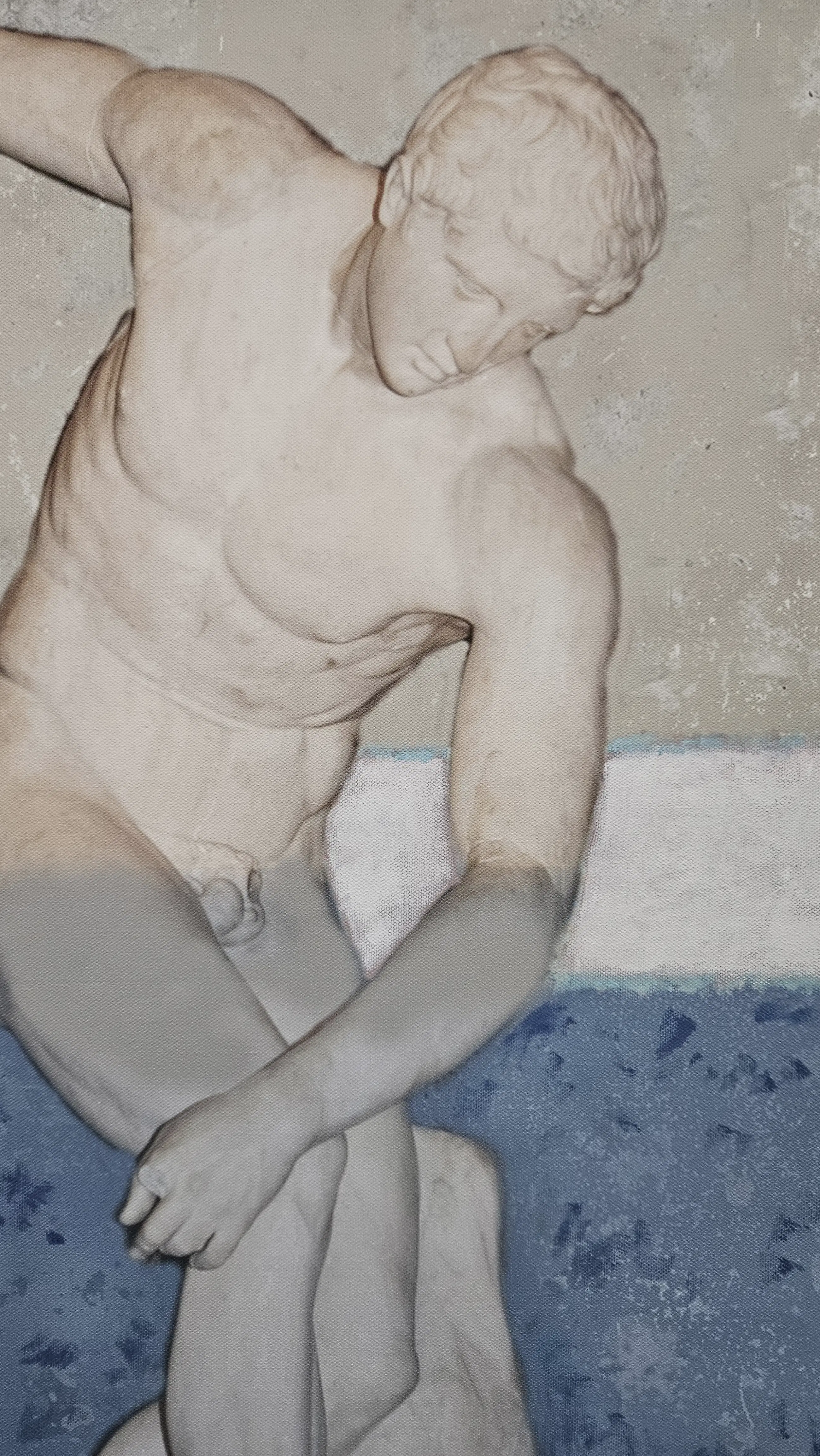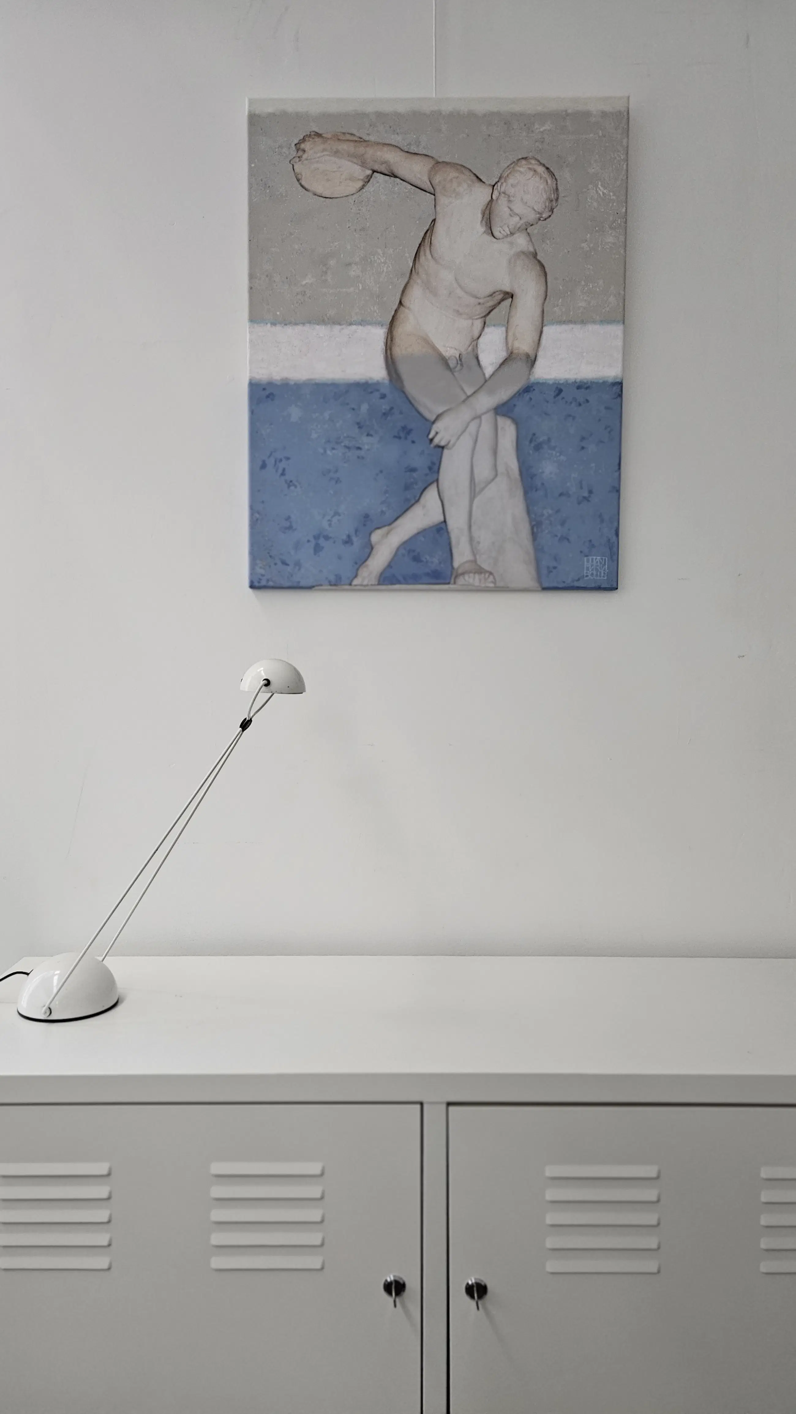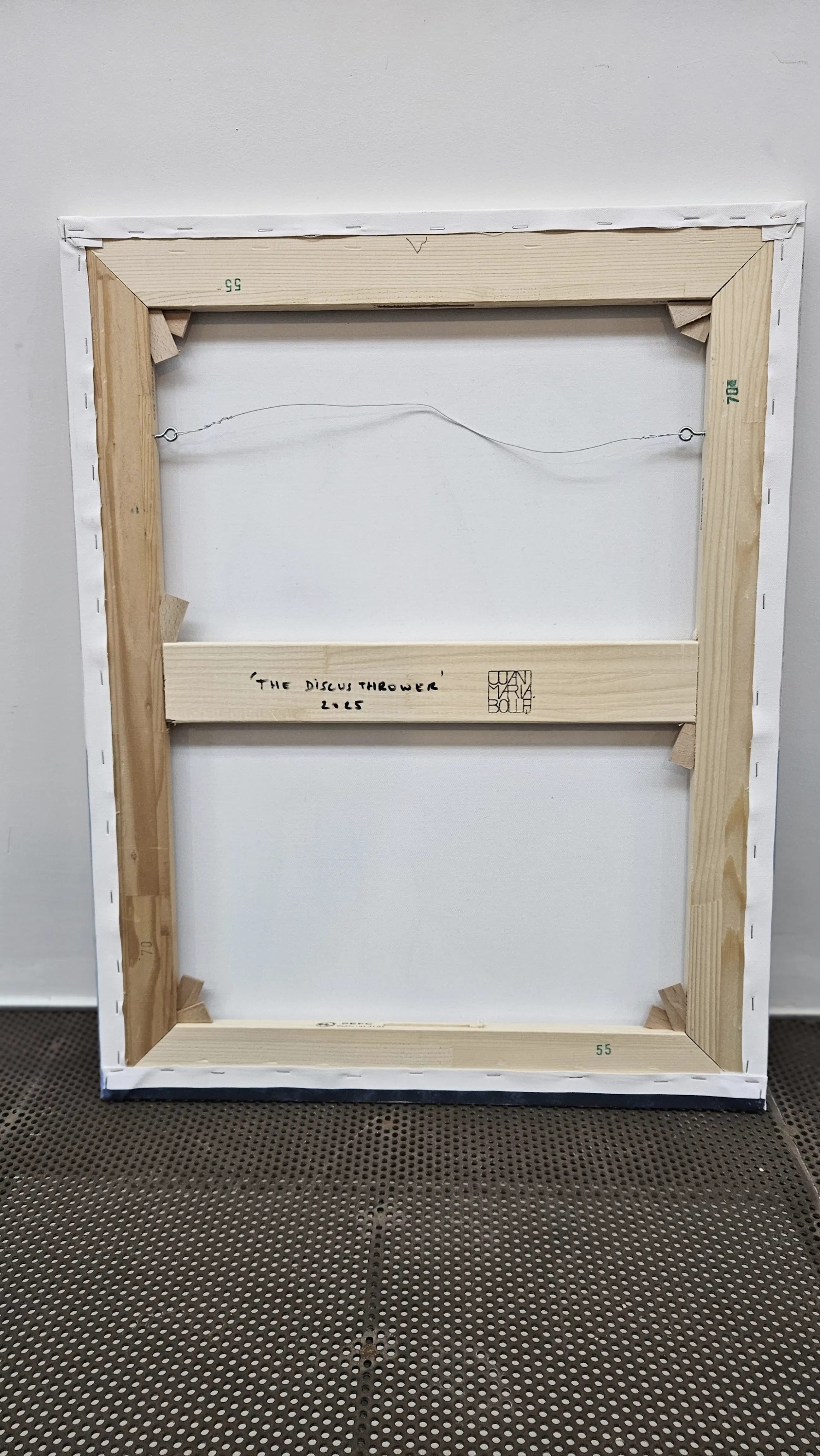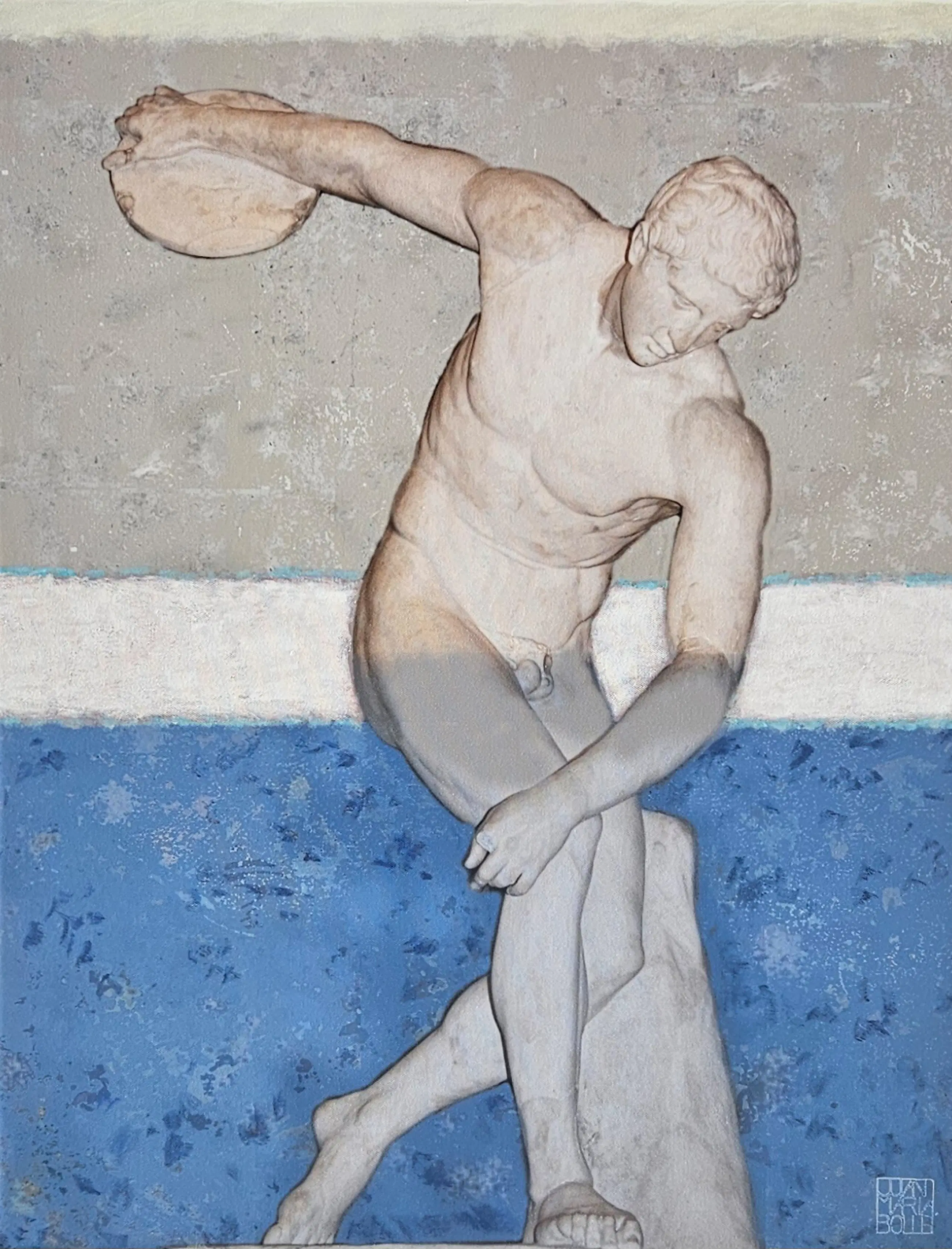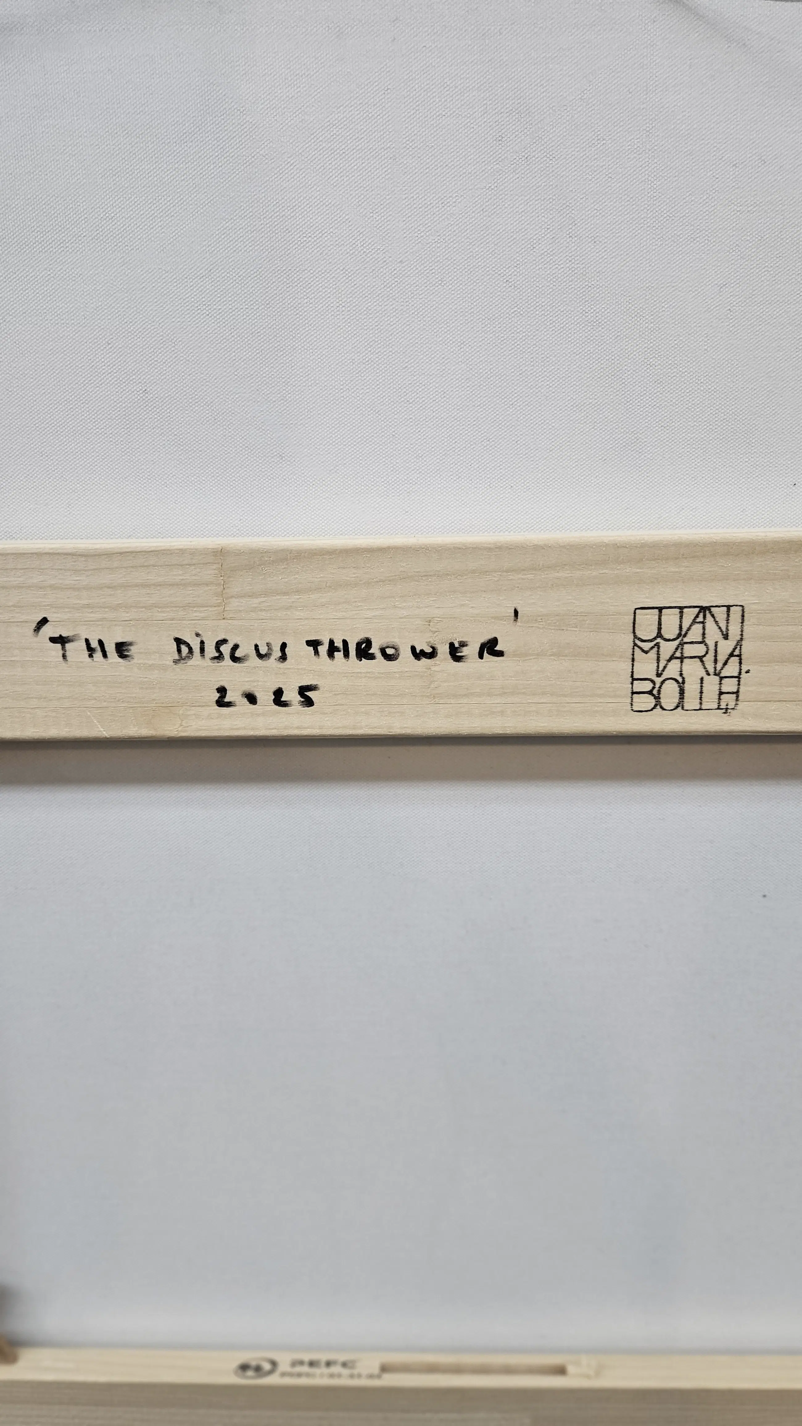 Het schilderij 'The discus thrower' is een recent kunstwerk (2025) uit de serie 'Classic moves' van Juan Maria Bollé. Daarbij worden klassieke beeldhouwwerken uit de Griekse- en Romeinse cultuur gecombineerd met abstracte schildersstructuren (acryl op doek) en ontstaat een kunstwerk met een nieuwe betekenis in een hedendaagse context .