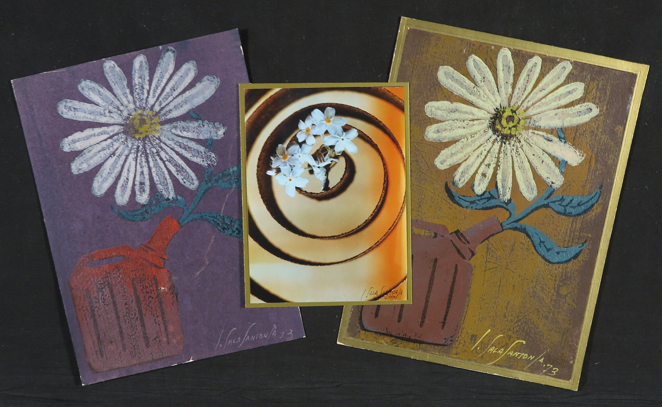 Over het algemeen in goede conditie. Wel enkele beschadigingen/plekjes langs de randen.Het paarse werk heeft ook een beschadiging in het beeld. De foto heeft enkele lichte krasjes zichtbaar met strijklicht. | |||||||||||