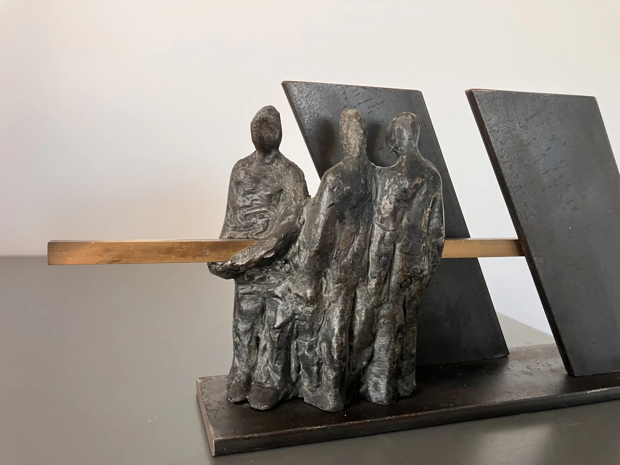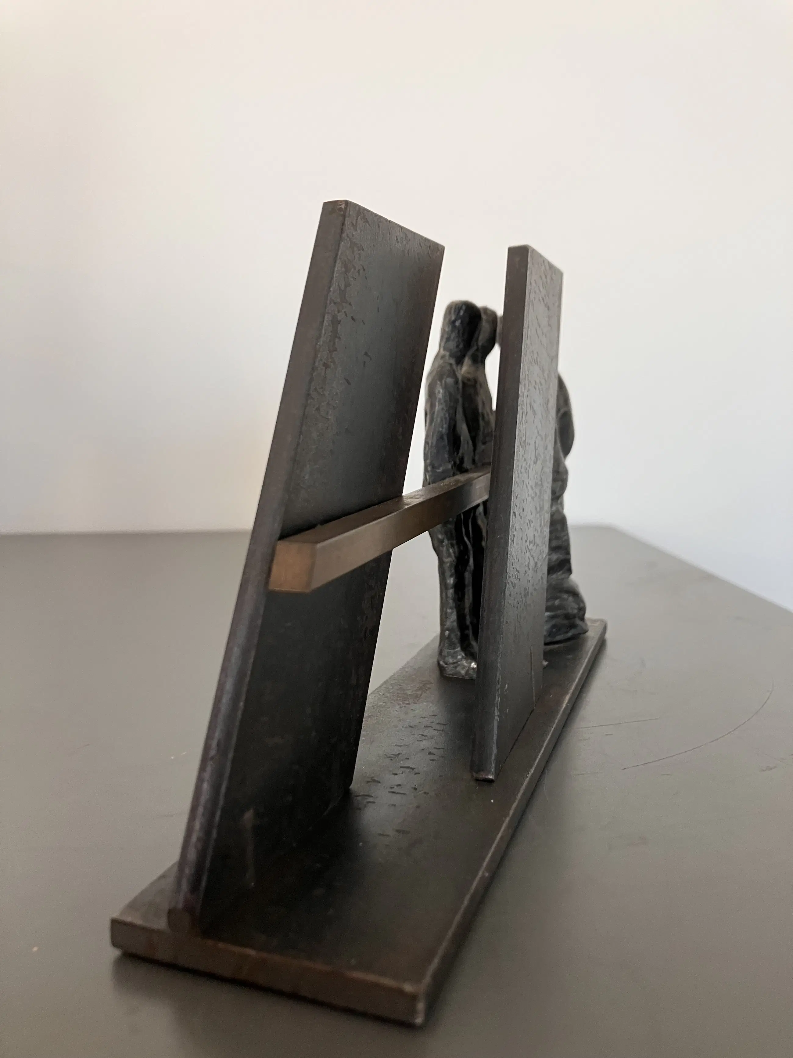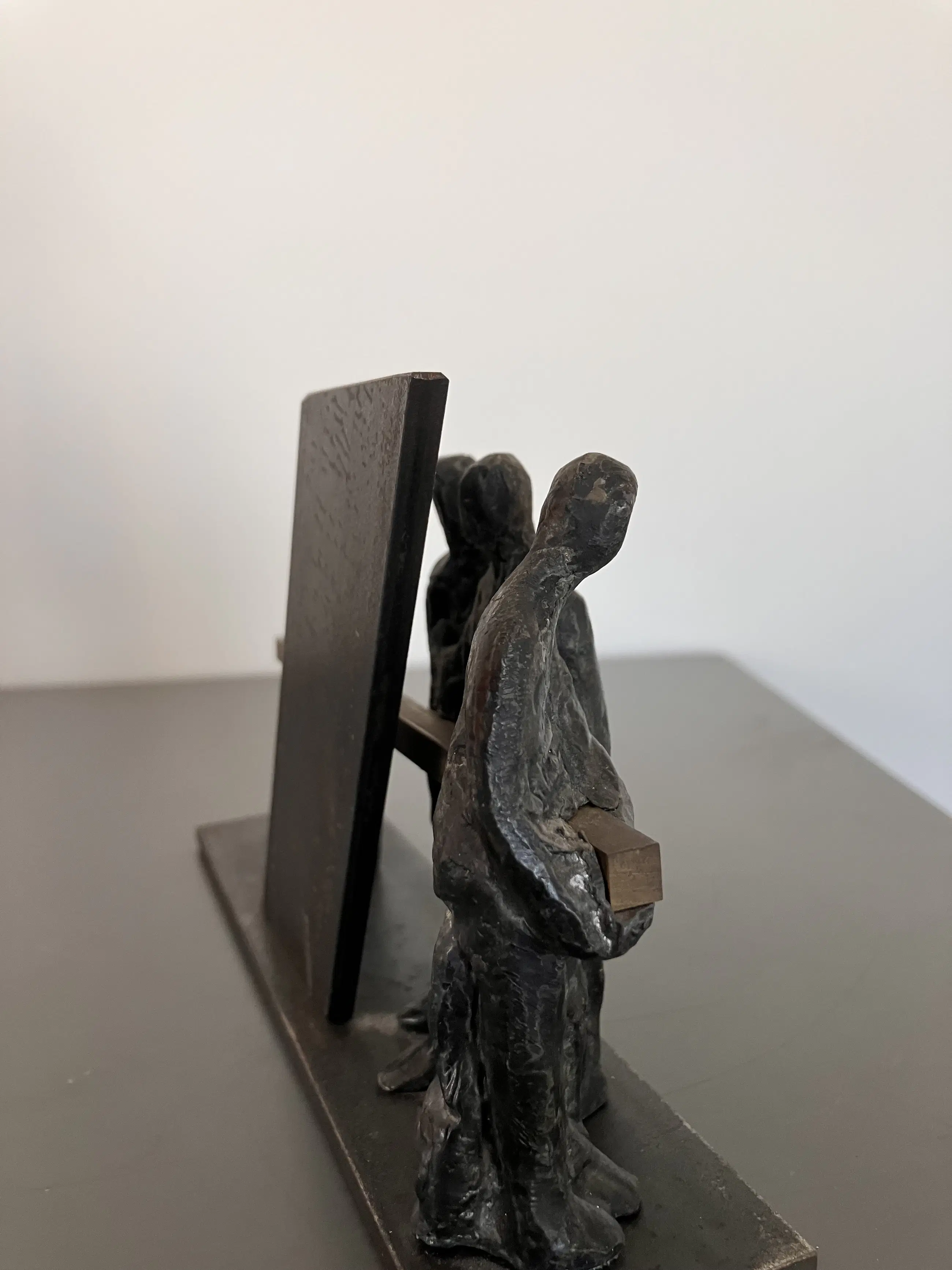 Beeld gemaakt voor de metaalkundige Stalen platen bronzen beeld van drie mannen die een zware balk verplaatsen De balk kan worden verschoven