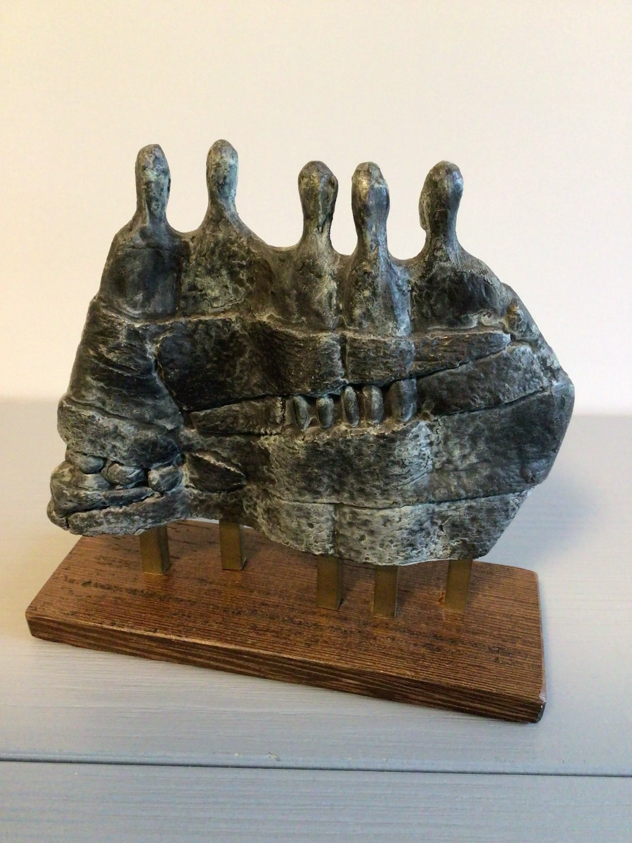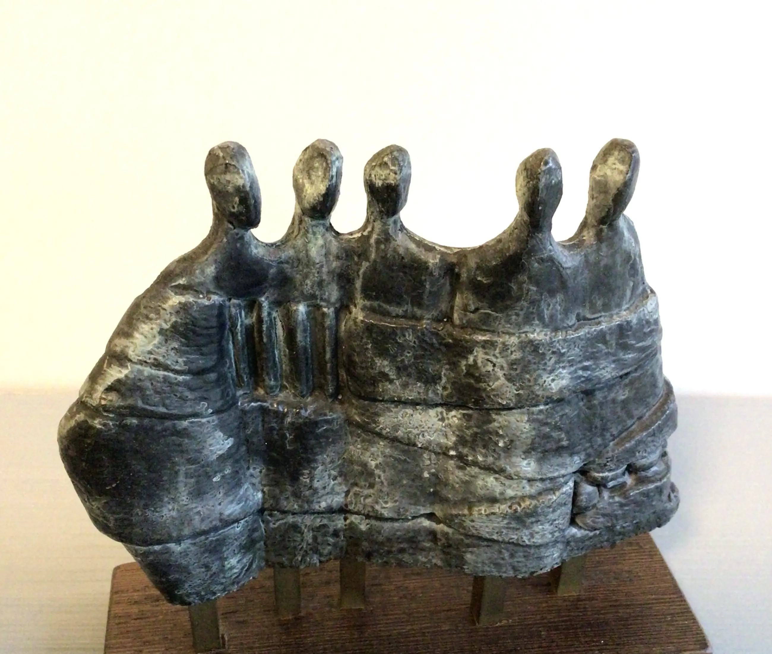 Zeer fraai vormgegeven sculptuur van vijf mensfiguren die samen een muur vormen , door deze eenheid vormen ze een krachtig team die op elkaar kunnen rekenen waar nodig ! Het betreft een vrij zeldzaam exemplaar en heeft een prachtig groenkleurig patina. Kunstenares: Judith Braun. Onderop het bekende goudkleurige merkje uit haar galerie Materiaal: brons Hoogte : 15 cm Lengte: 14 cm Gewicht: 2245 gram Het beeld verkeert in zeer goede staat en wordt zorgvuldig verpakt verzonden