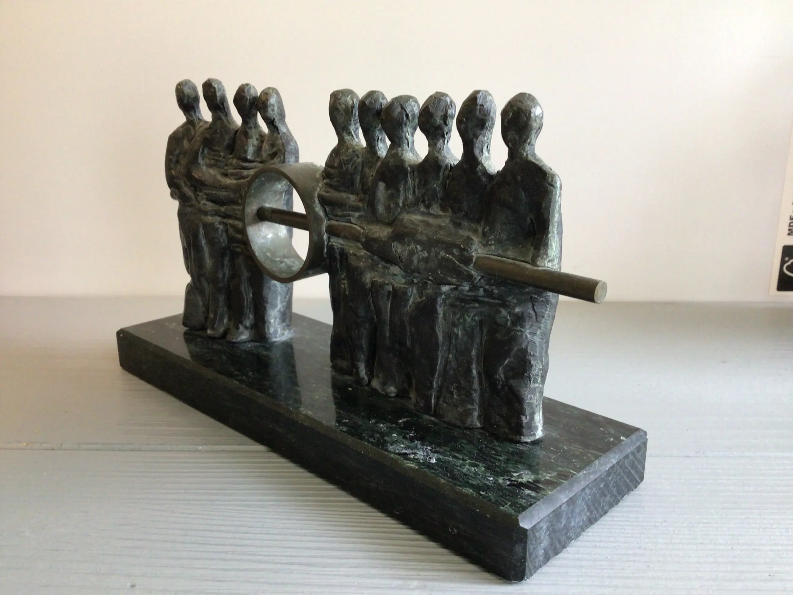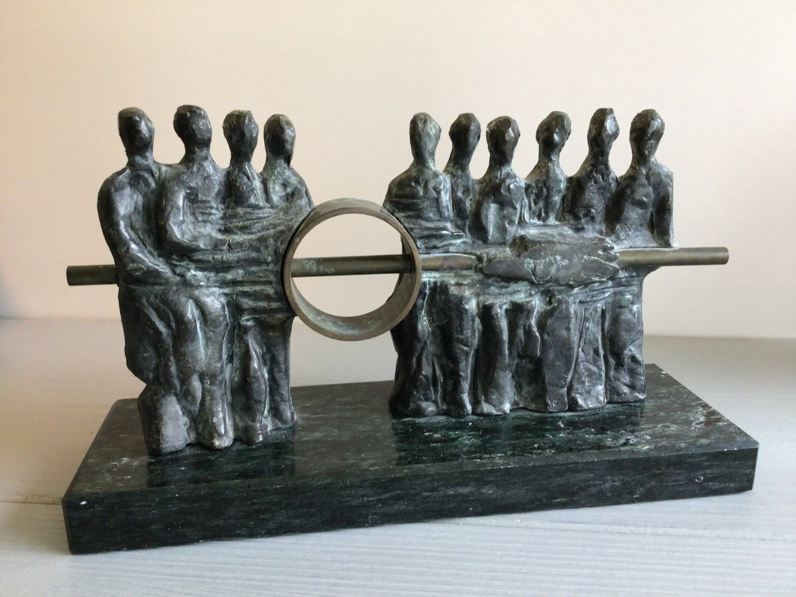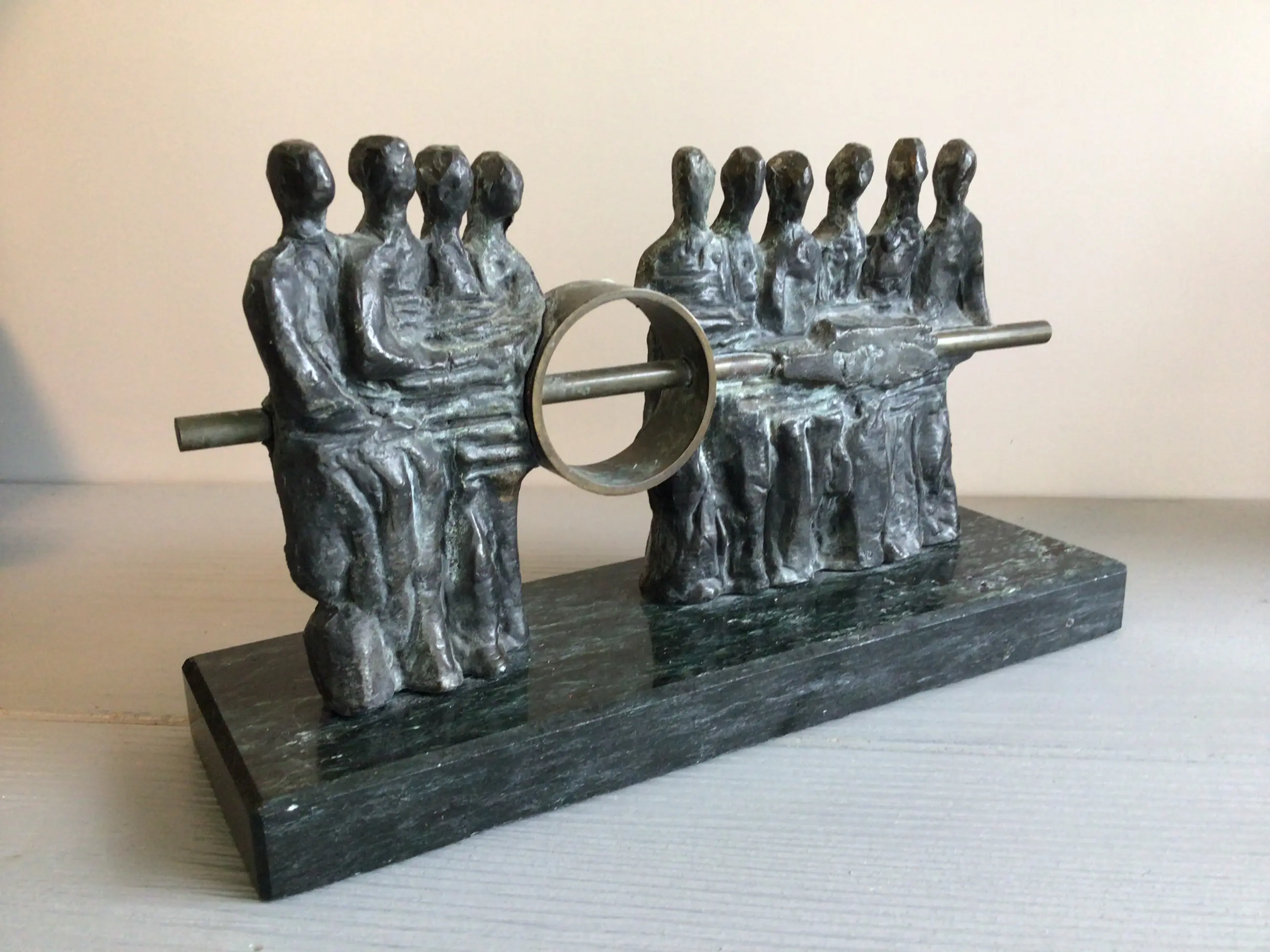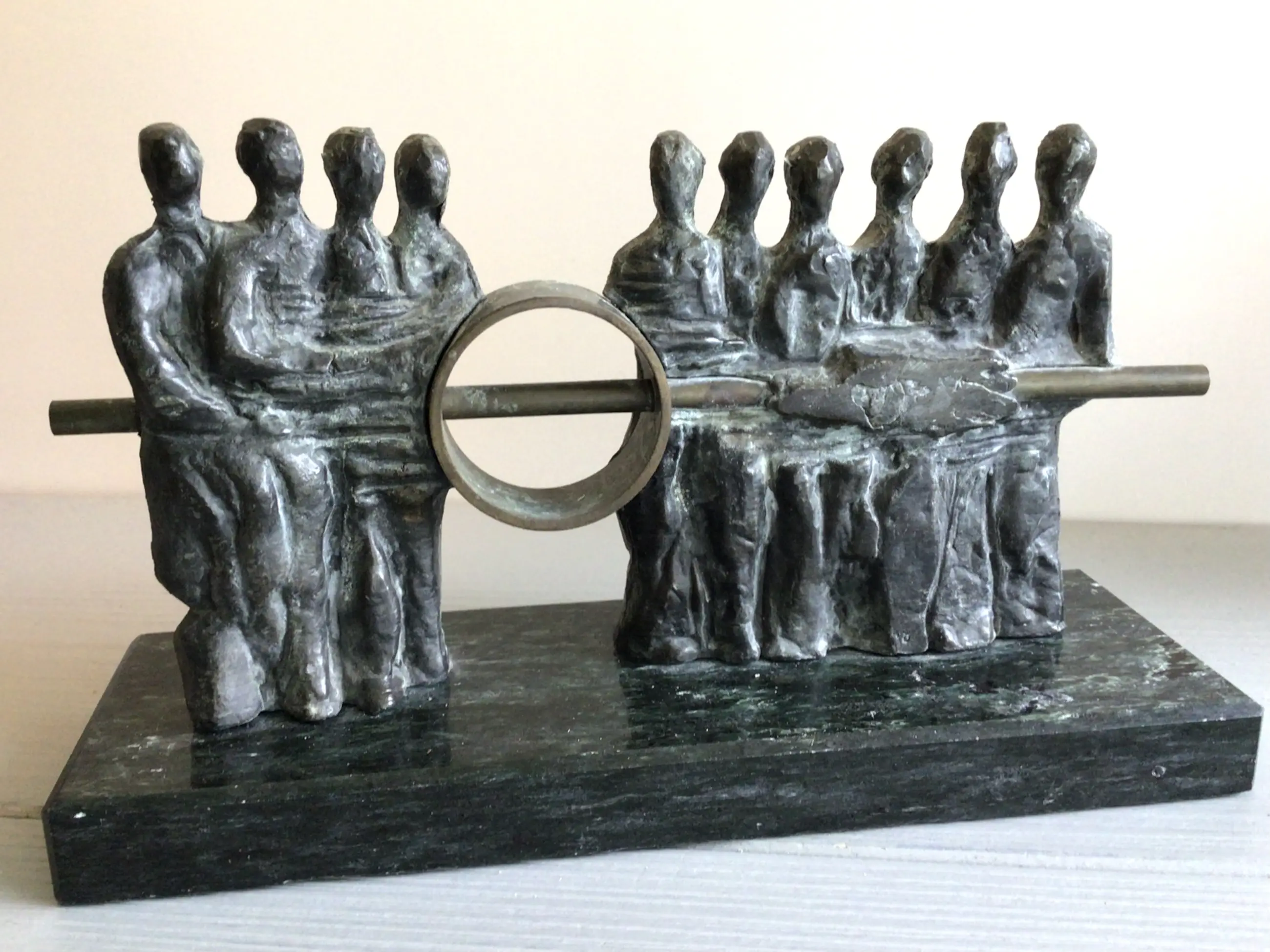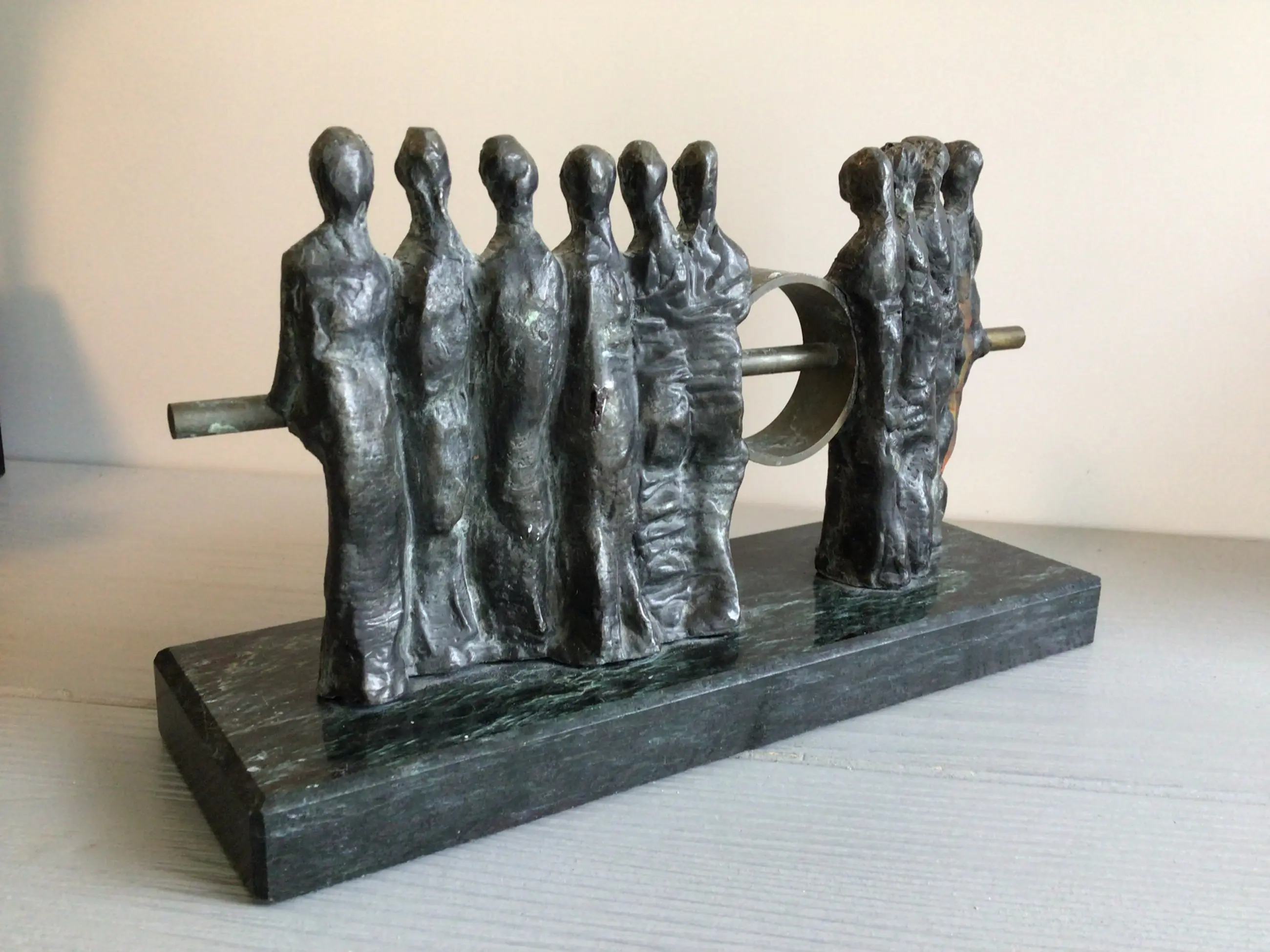 Zeer fraai vormgegeven en zeldzaam sculptuur van een tiental mensfiguren die gezamenlijk de verbinding maken, een mooie symboliek. Kunstenares: Judith Braun. Onderop de bekende sticker uit haar galerie “ Atelier Judith Braun “ Materiaal: brons Het beeld verkeert in goede staat en wordt zorgvuldig verpakt verzonden