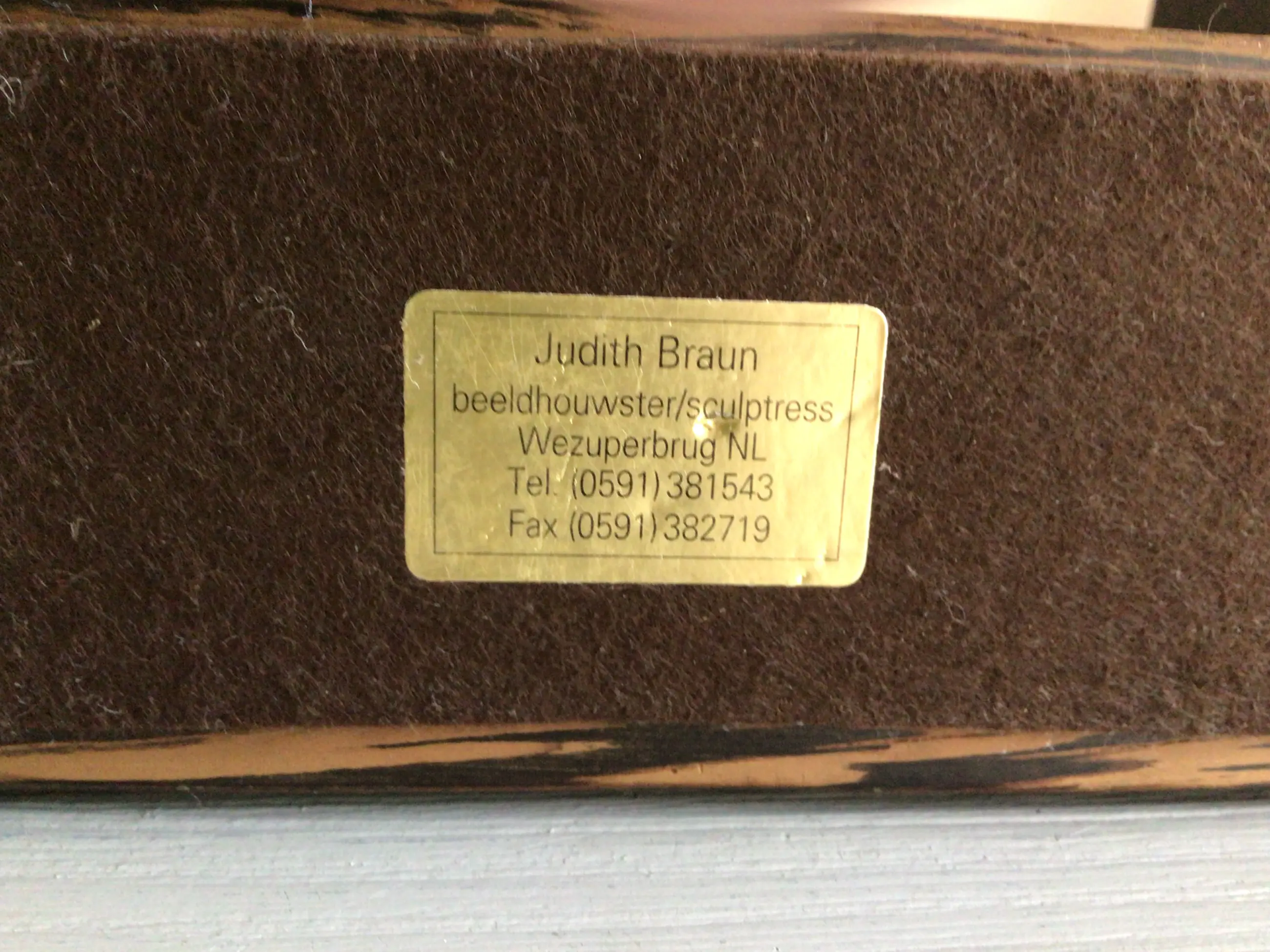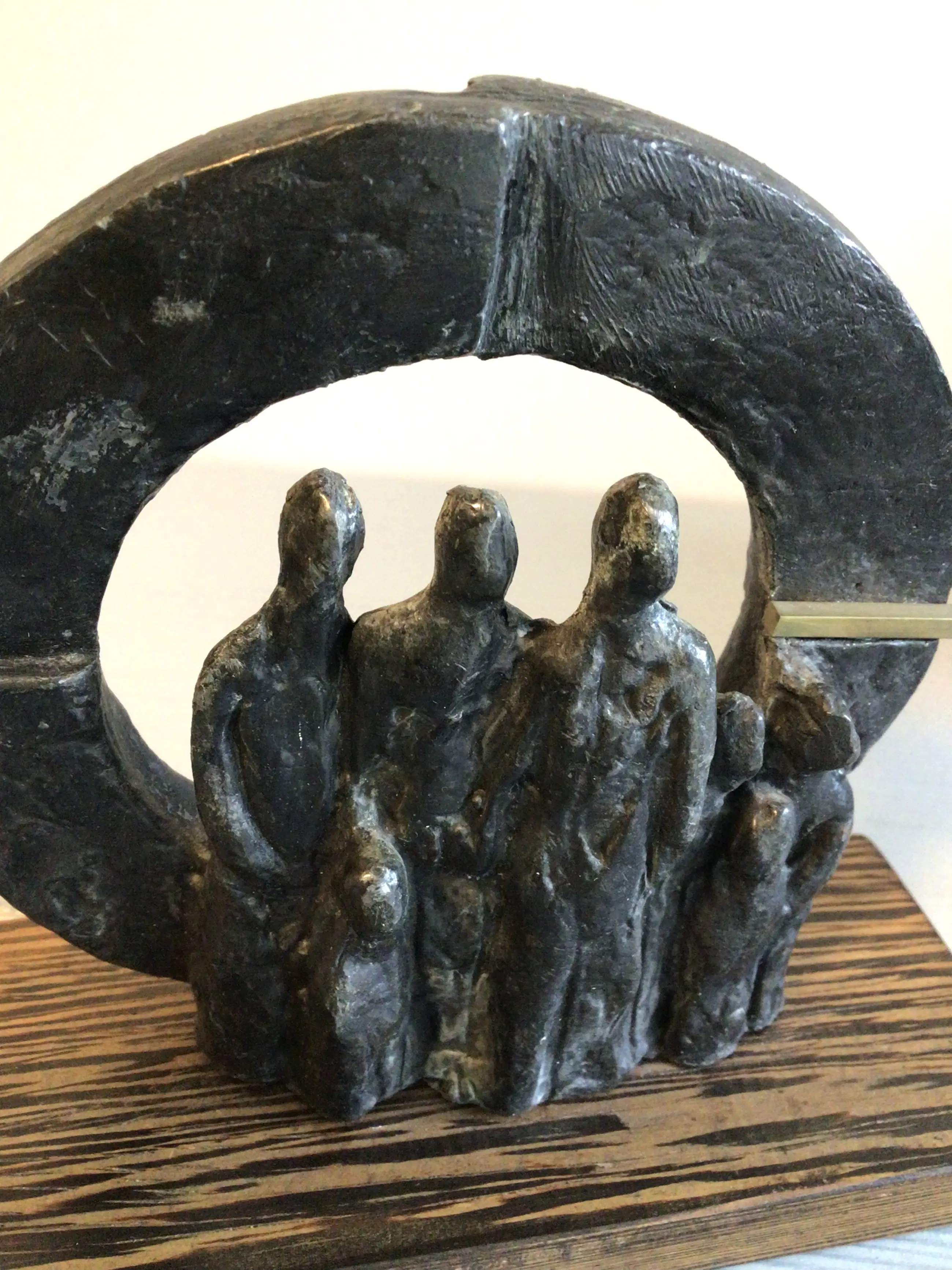 Zeer fraai vormgegeven sculptuur van een zevental mensfiguren staand voor een cirkel, een mooie symboliek. Het betreft een vrij zeldzaam exemplaar, ik ben deze zelf nog niet eerder tegengekomen. Kunstenares: Judith Braun. Onderop het bekende goudkleurige merkje uit haar galerie “ Atelier Judith Braun “ Materiaal: brons Het beeld verkeert in goede staat en wordt zorgvuldig verpakt verzonden