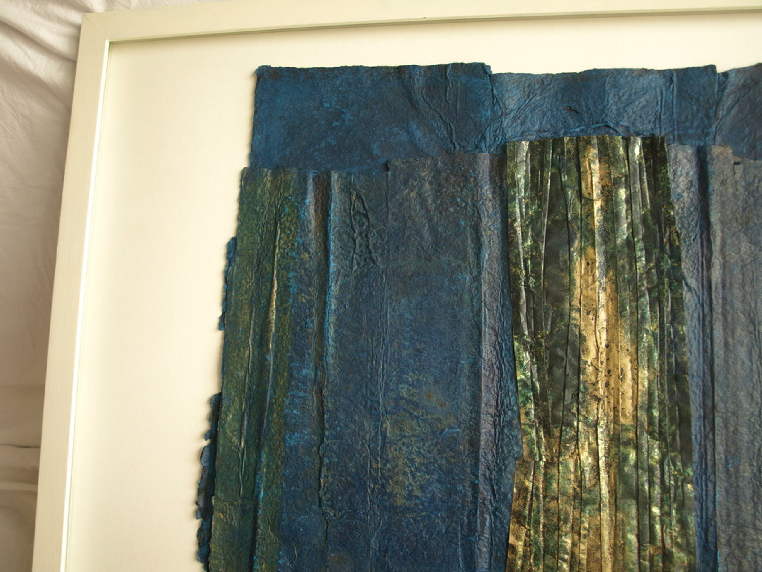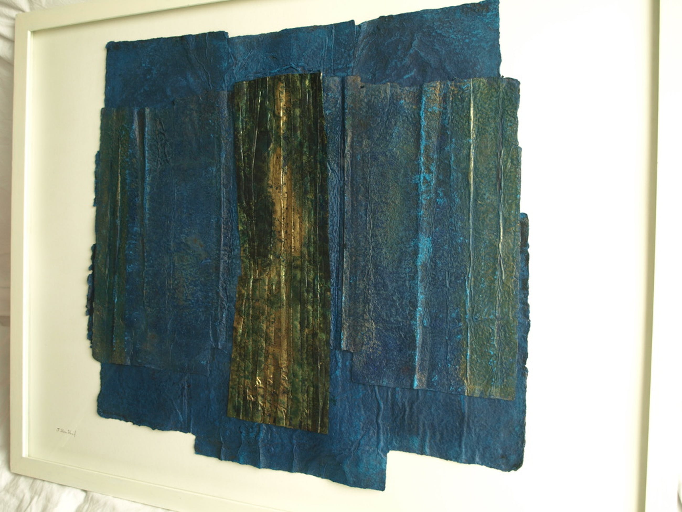 Gemaakt d.m.v. een gemengde techniek van zelfgeschept papier, pigment en koper.