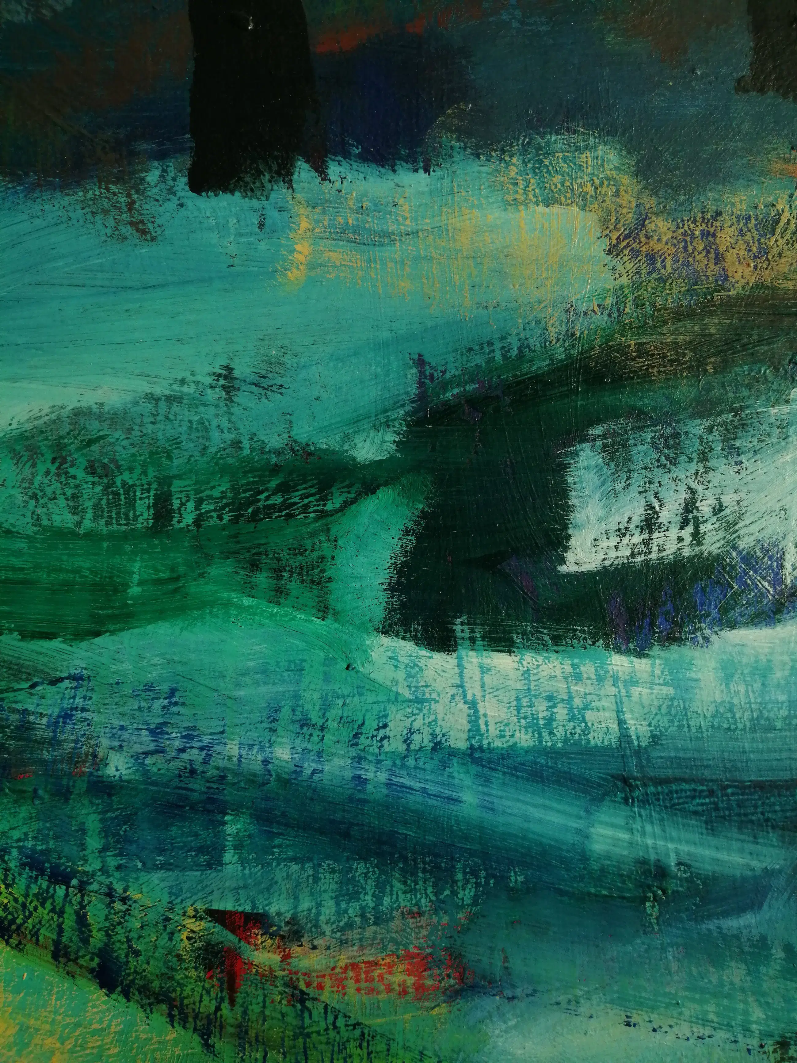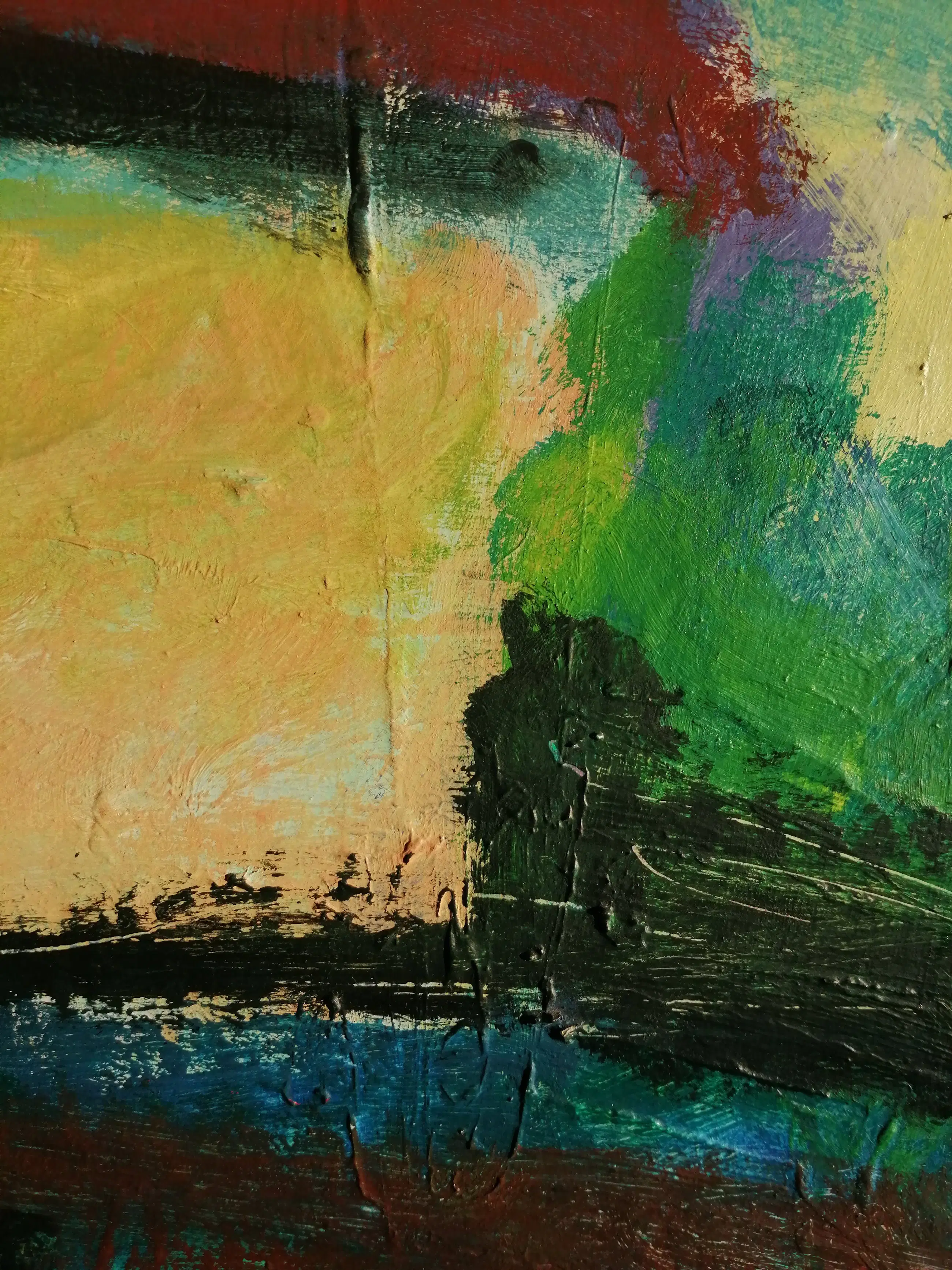 Acrylverfschilderij op hardboard vervaardigd door Judith Stolker. Een expressieve compositie met bijbehorende lijst.