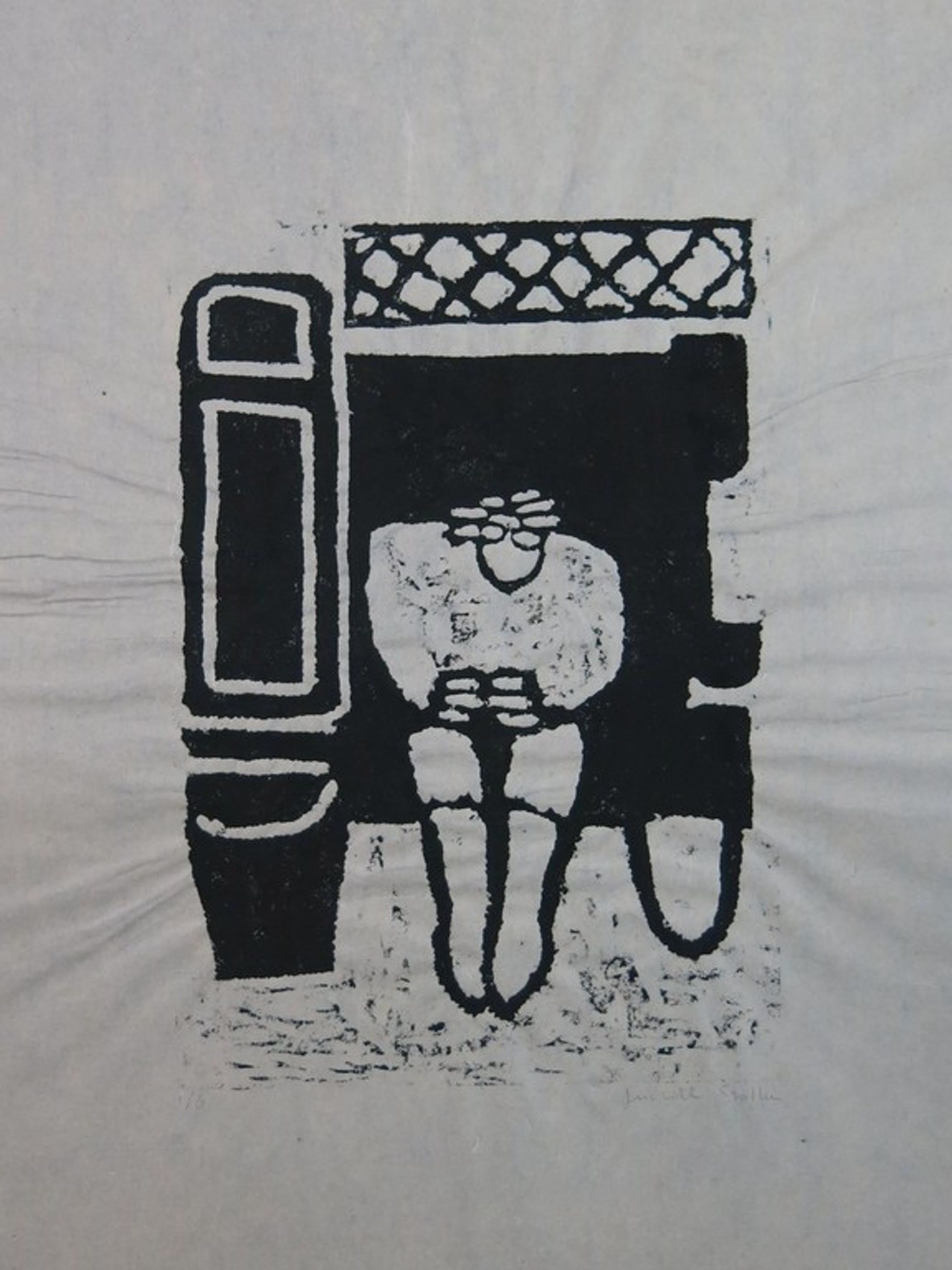 Conditie: In goede staat, maar veel golving in het blad, ontstaan tijdens het drukken van het beeld op dit papier. Ingelijst minder duidelijk zichtbaar.