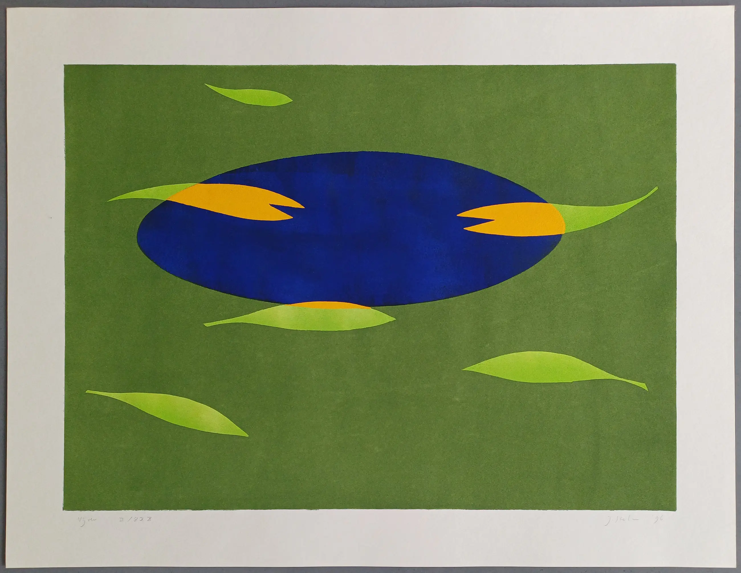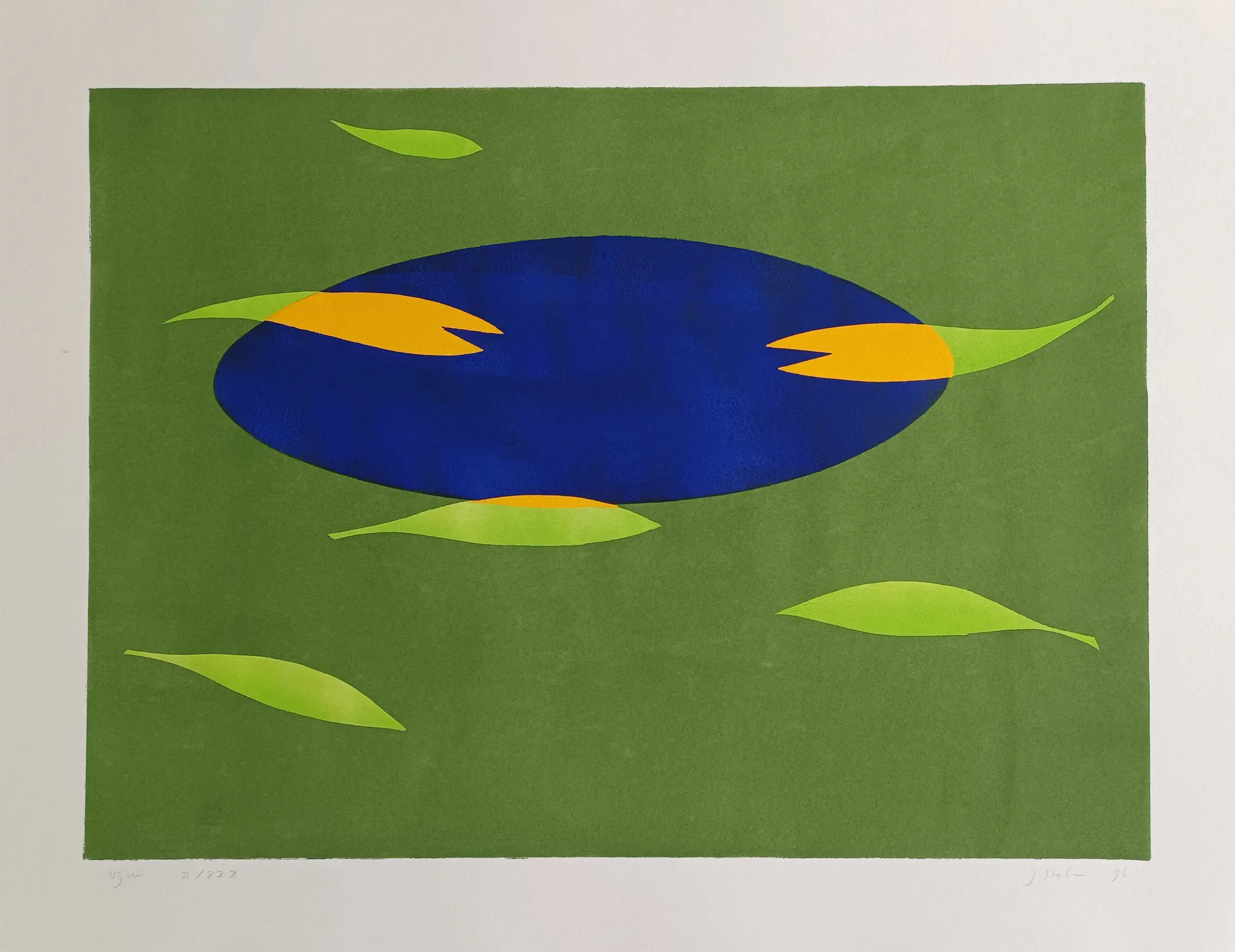 Gesigneerde sjabloondruk van de kunstenaar Judith Stolker (1960) Rechtsonder is het werk gesigneerd en 96, linksonder met vijver en II/XXX. Afmeting papier 50 x 65 cm (hxb). Het werk is in prima staat en is nooit ingelijst geweest.