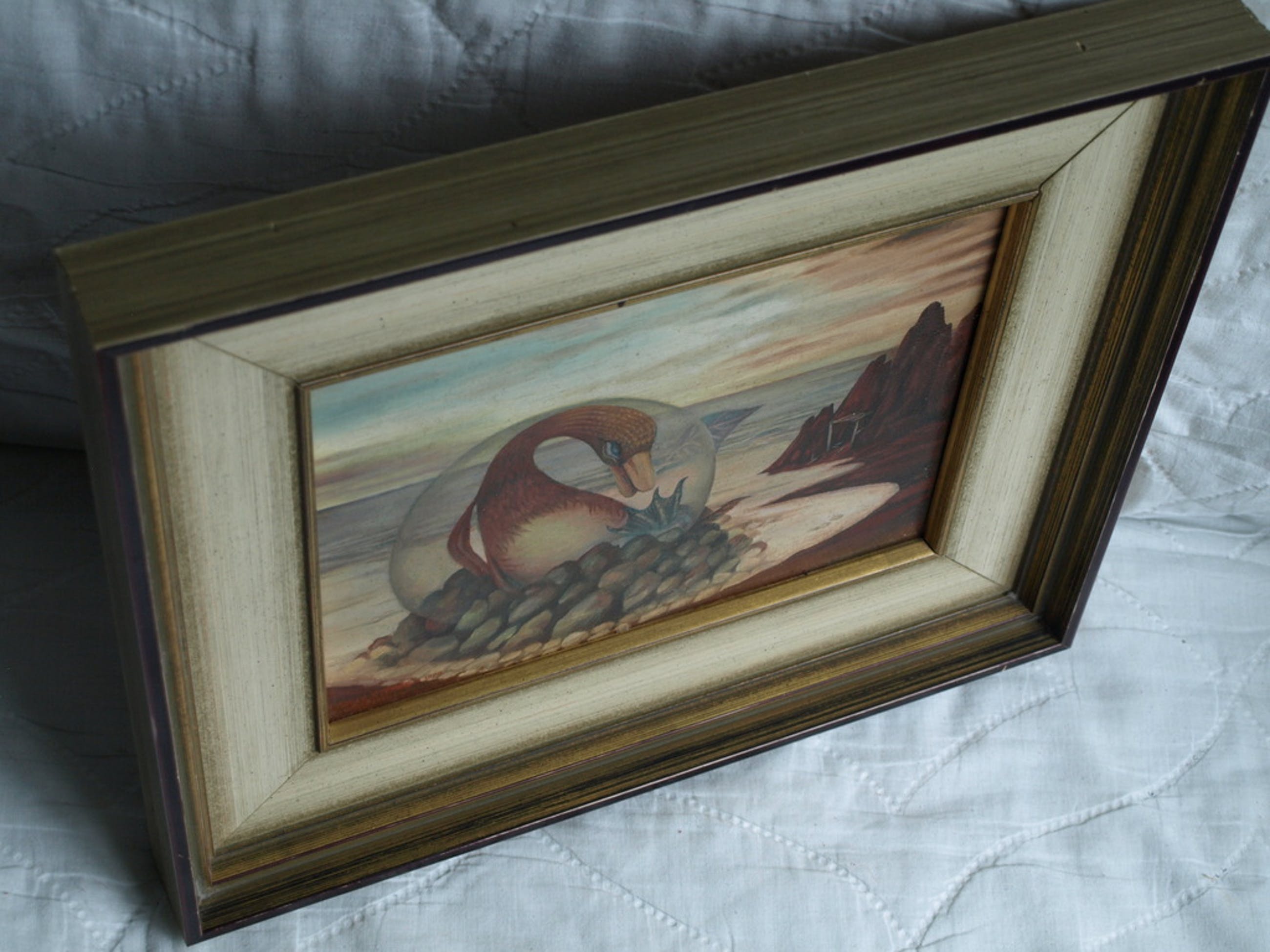 Een ‘vroeg’schilderij van de Nederlandse kunstenares Judith Vermeeren-Neet met een surrealistische voorstelling van een vogel (eend?) in een doorzichtig ei op het strand.