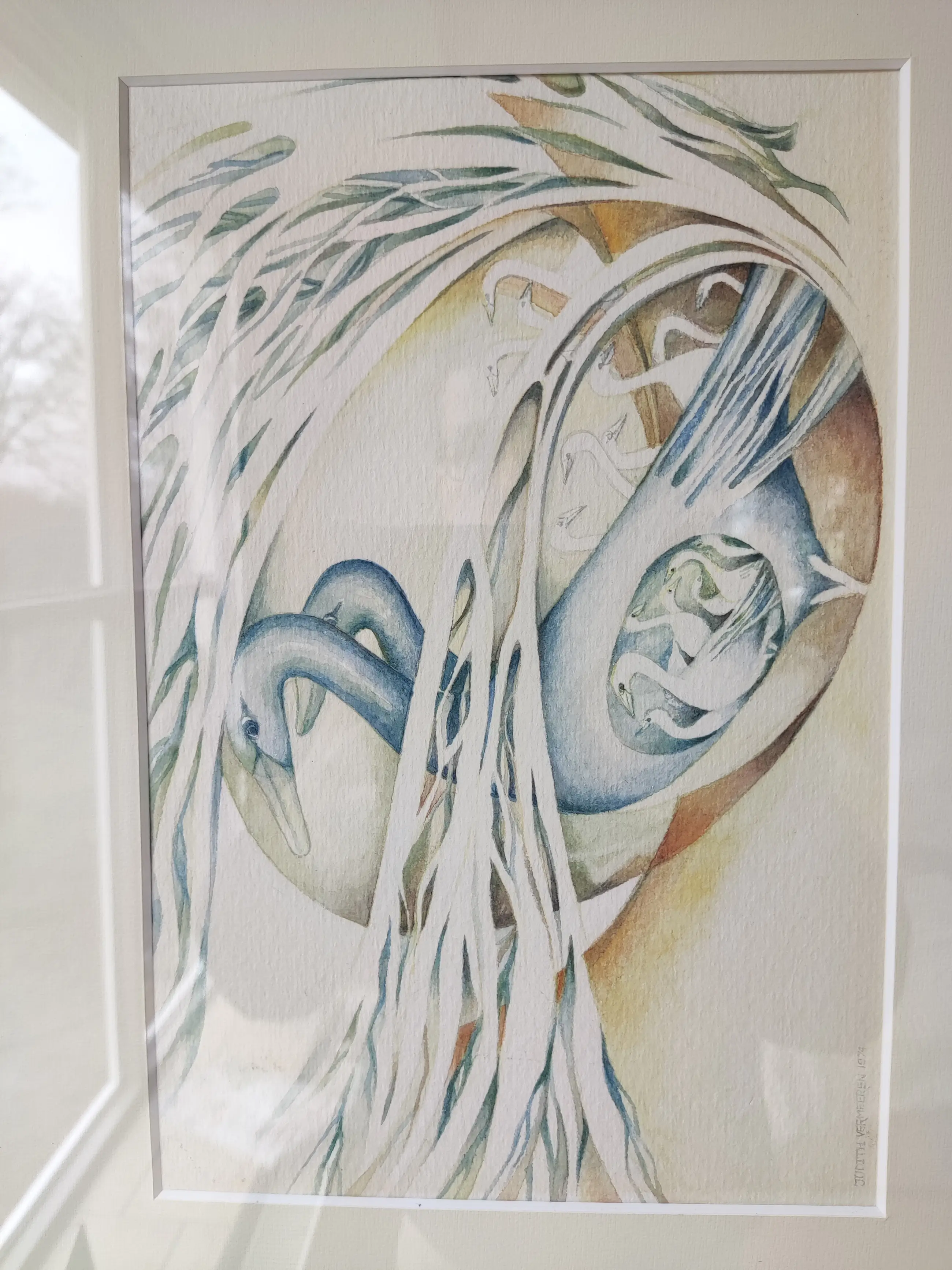 Vroeg werk van deze Nederlandse kunstenares. Aquarel van zwanen in een ei. Met daarin weer zwanen in een ei. Werk is in perfecte staat achter glas. Lijst vertoond wat beschadigingen aan de rand.