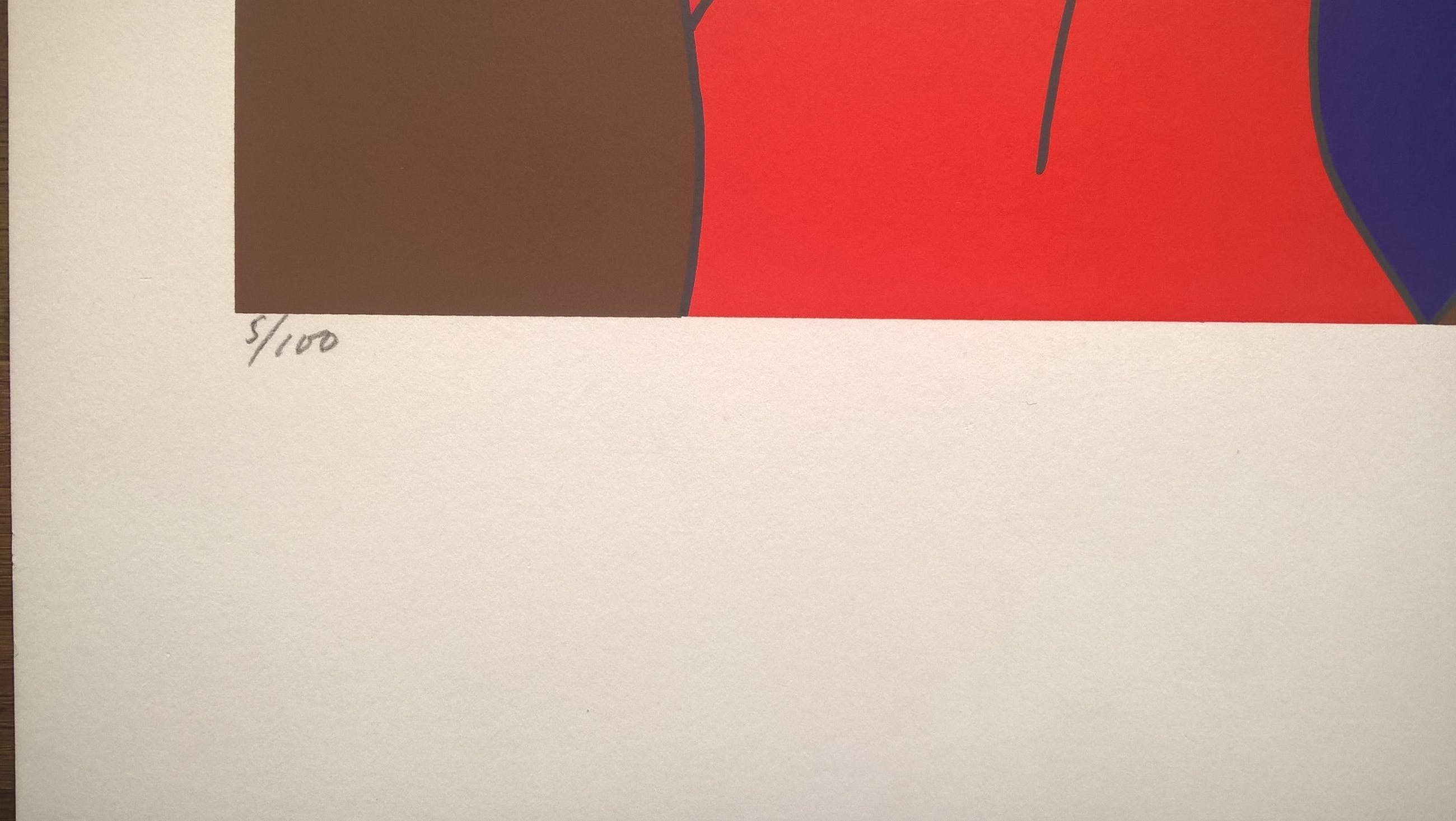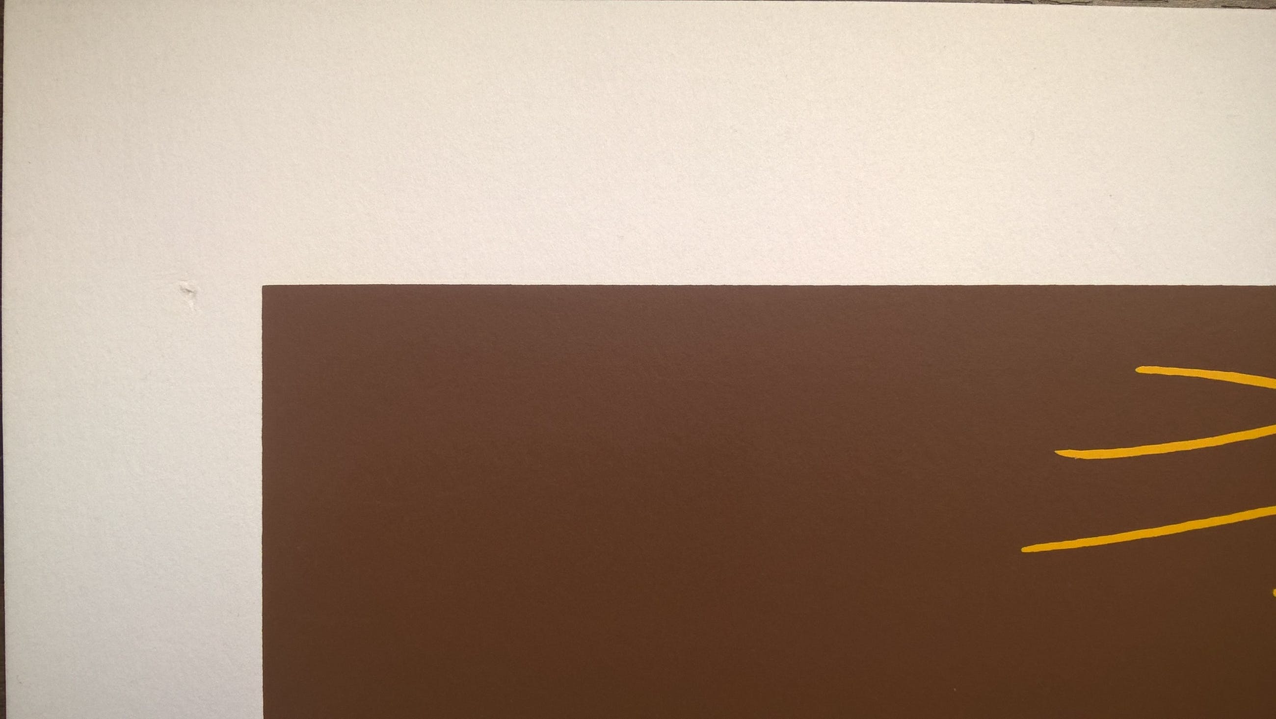 | In de linker bovenhoek zit een kleine beschadiging in het papier. Verder is de zeefdruk is in goede conditie en is nooit ingelijst geweest. | |||||||||||