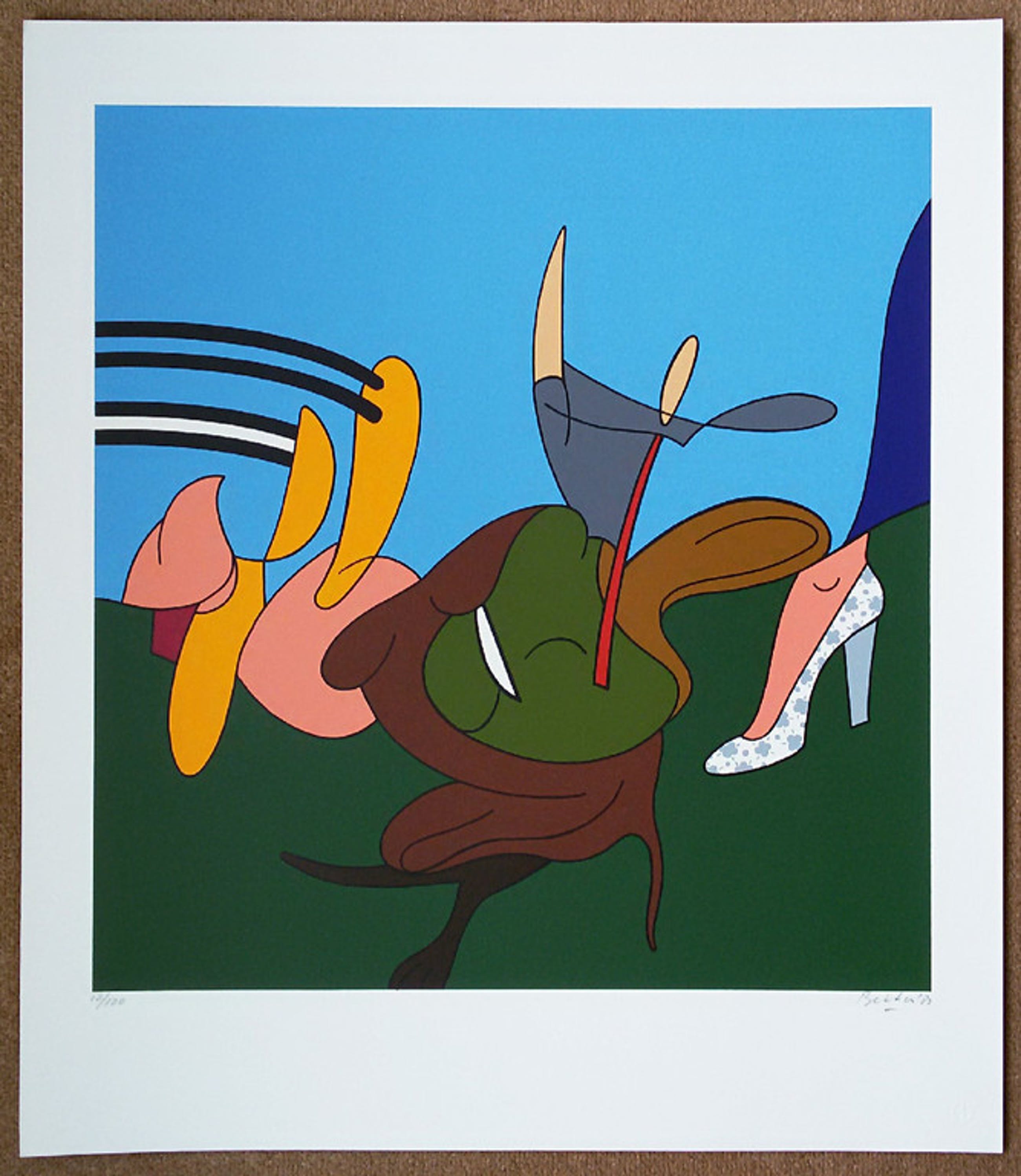 Karakteristiek, kleurrijk werk van Jules Bekker. Zeefdruk op dik papier, met potlood gesigneerd, gedateerd (‘82) en genummerd (12/120). In mint conditie.