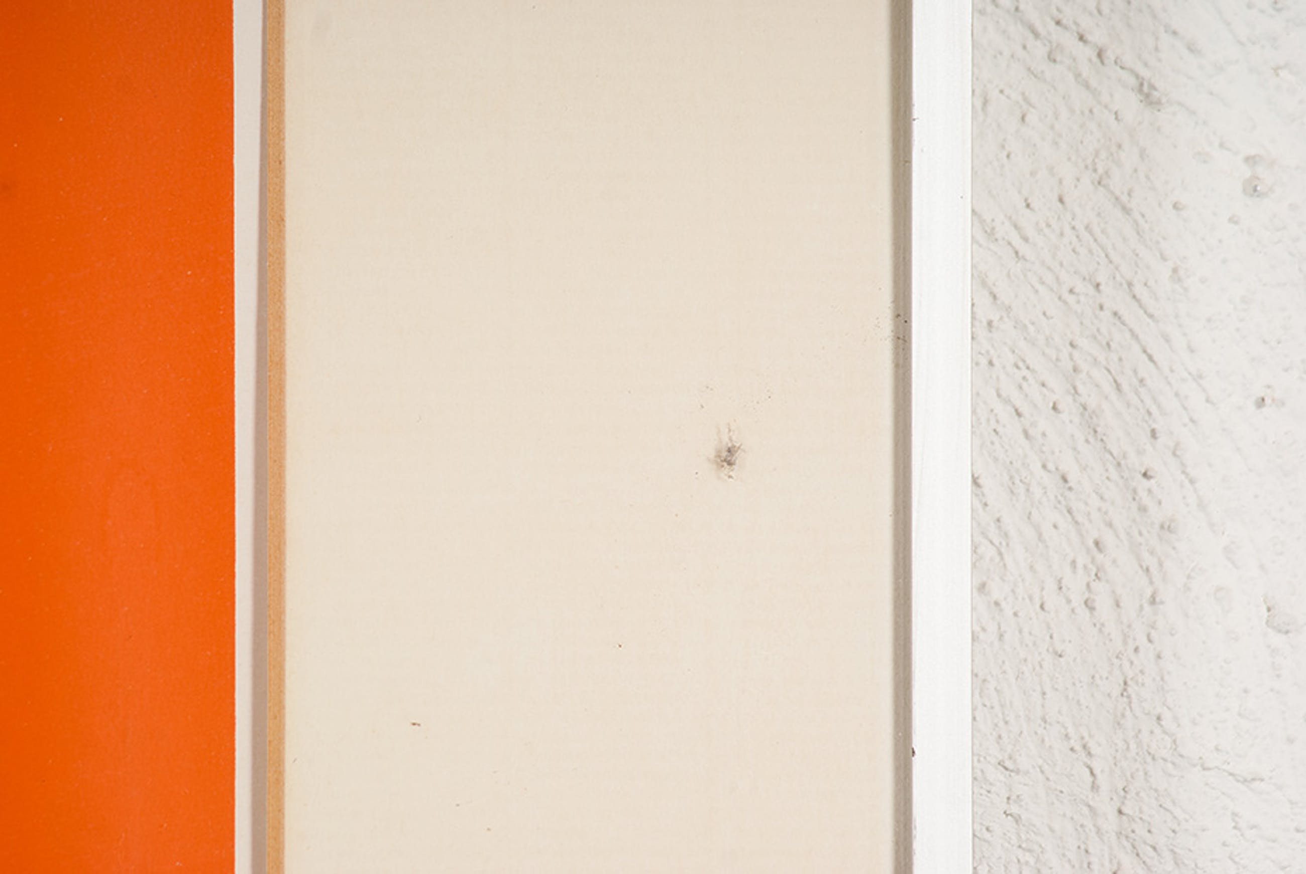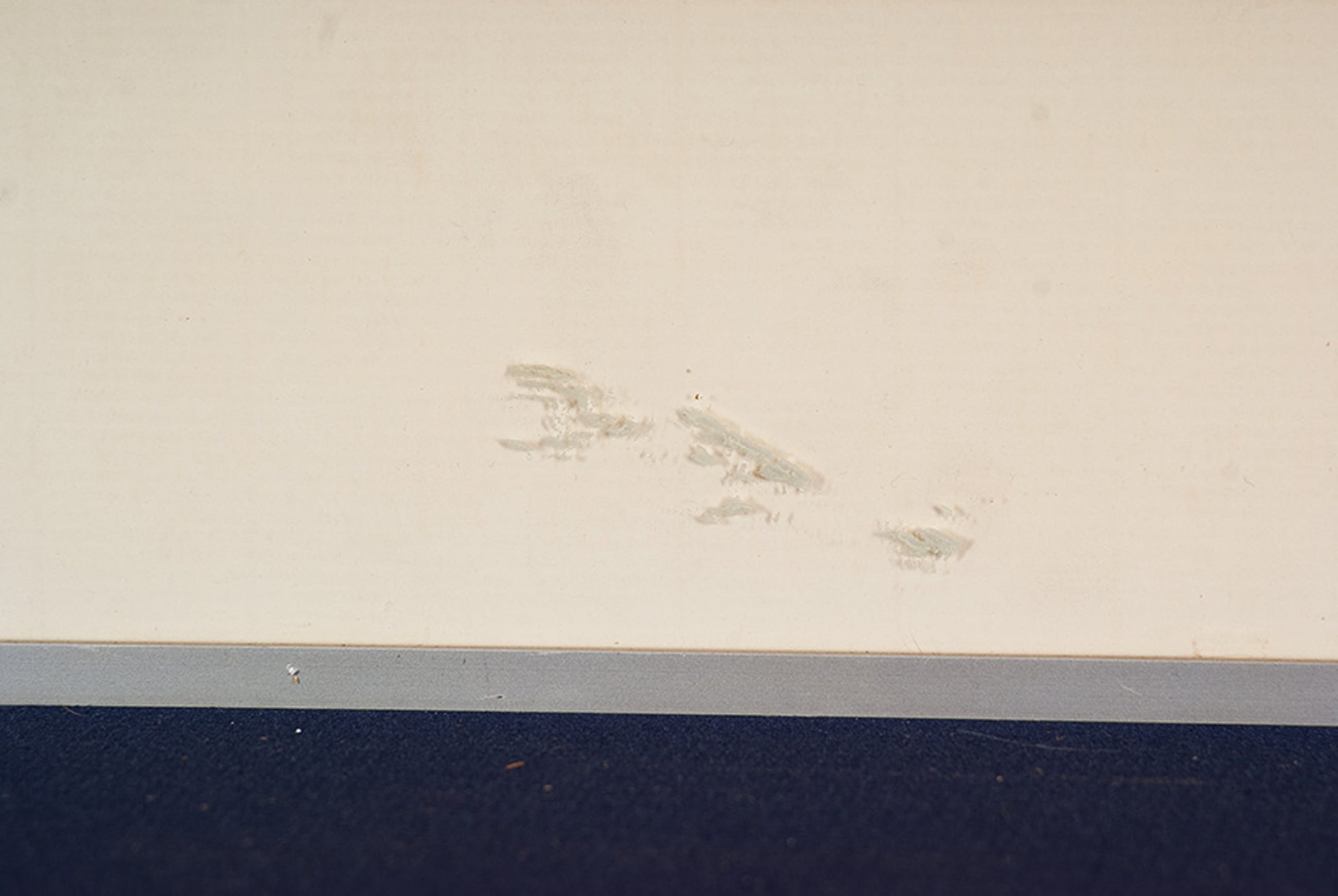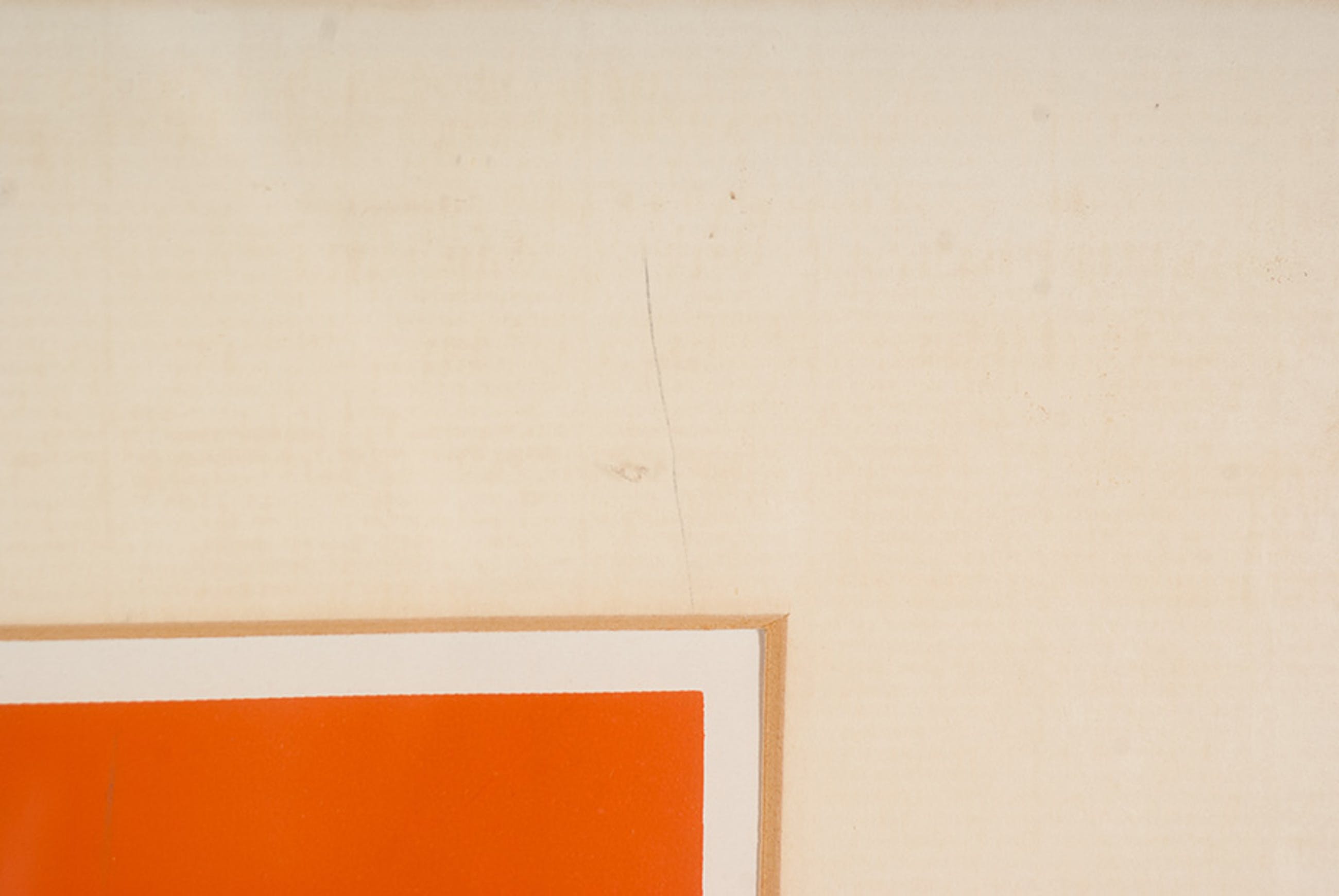 | De achterplaat is gemaakt van zeer dun karton, het blad is licht gerimpeld en verschoven achter het passe-partout. Het passe-partout is ook vergeeld met een karkas van een insect rechtsonder. Daarnaast is de lijst enigszins verbogen in de onderhoeken. De glasplaat heeft sticker resten midden onder. | |
