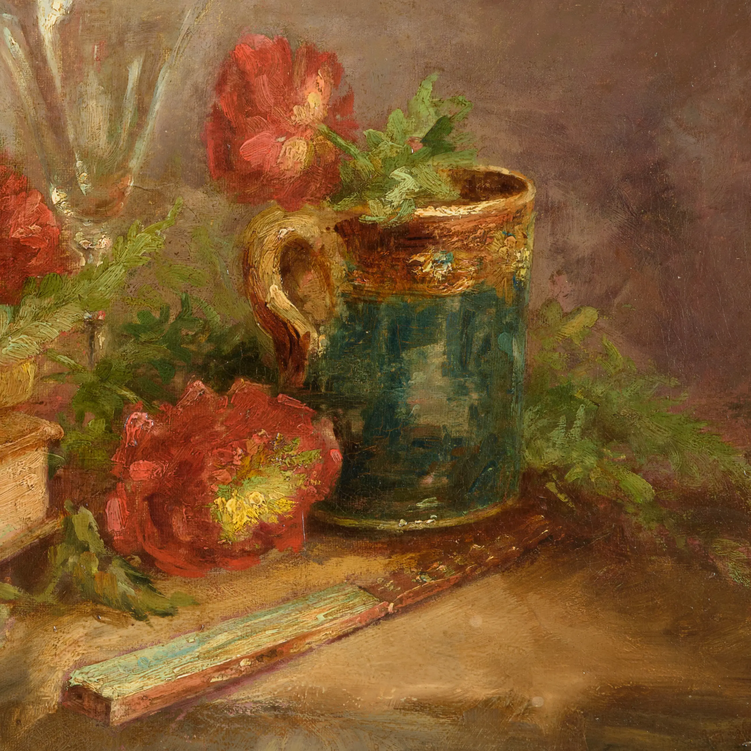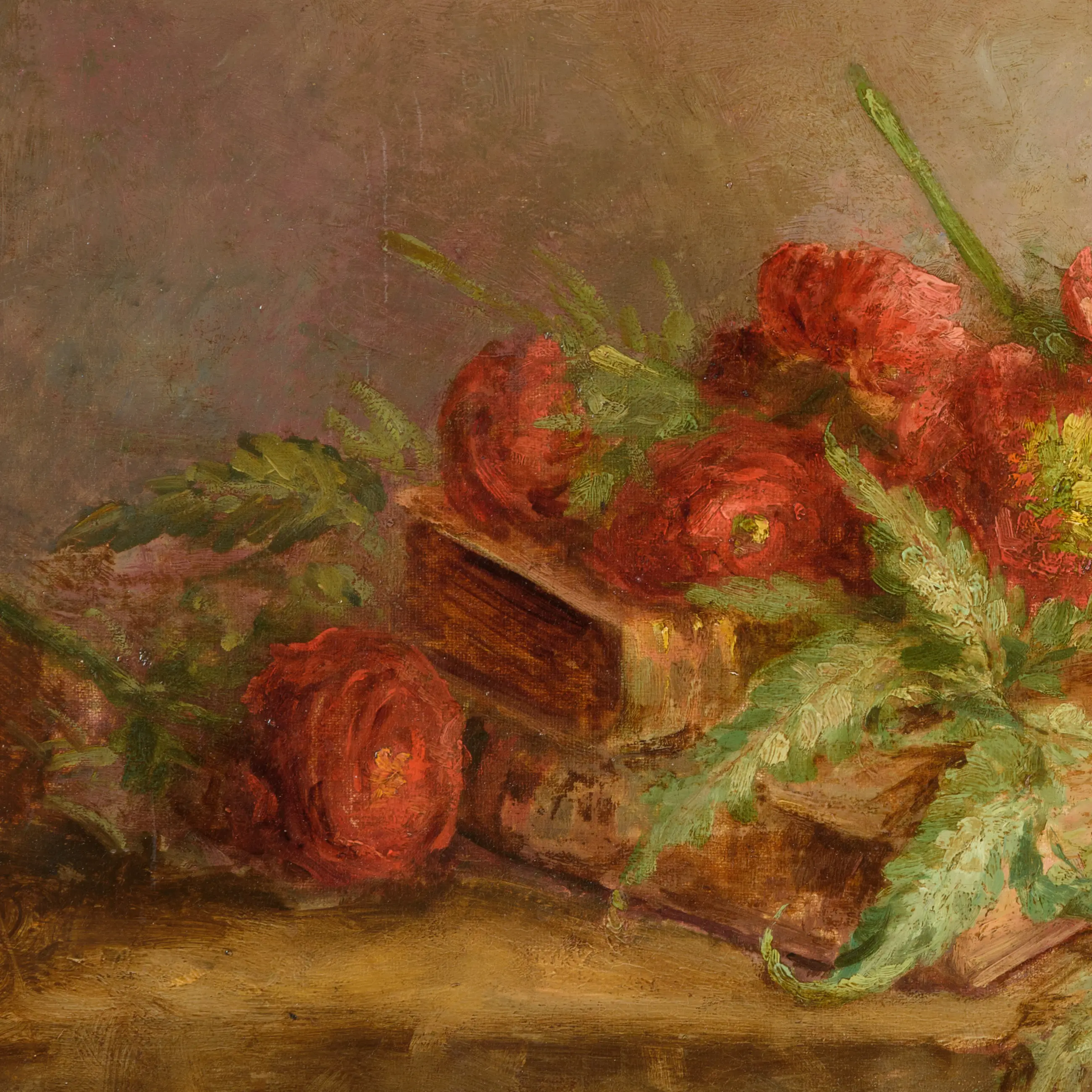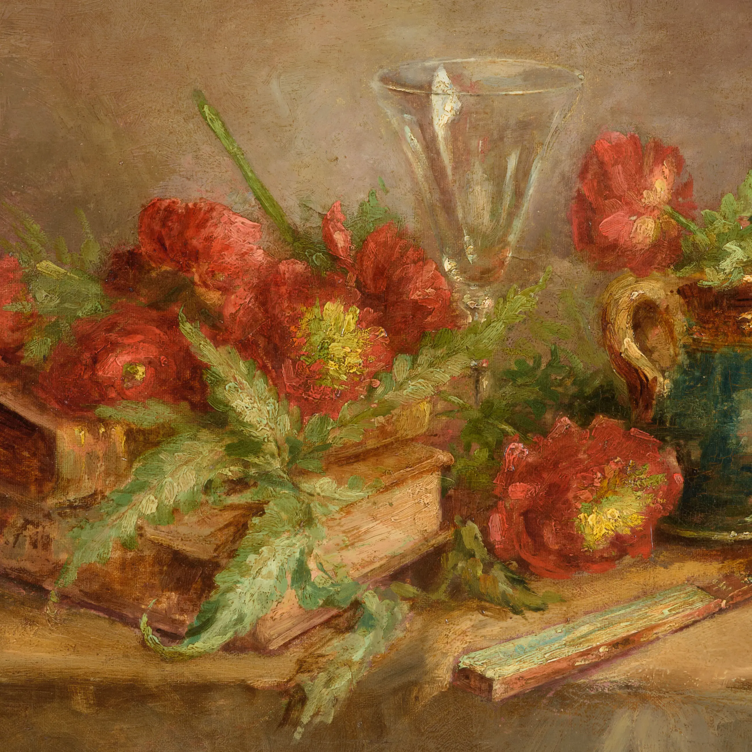 Dit schilderij is een klassiek stilleven dat een warme, bijna poëtische sfeer oproept. De kunstenaar heeft met een losse penseelvoering een zorgvuldig gearrangeerde compositie neergezet waarin rode bloemen, mogelijk anemonen of papavers, zich over een stapel verweerde boeken uitstrekken. De levendige rode tinten van de bloemen contrasteren prachtig met de doffe, aardse kleuren van de boeken en het aardewerk.