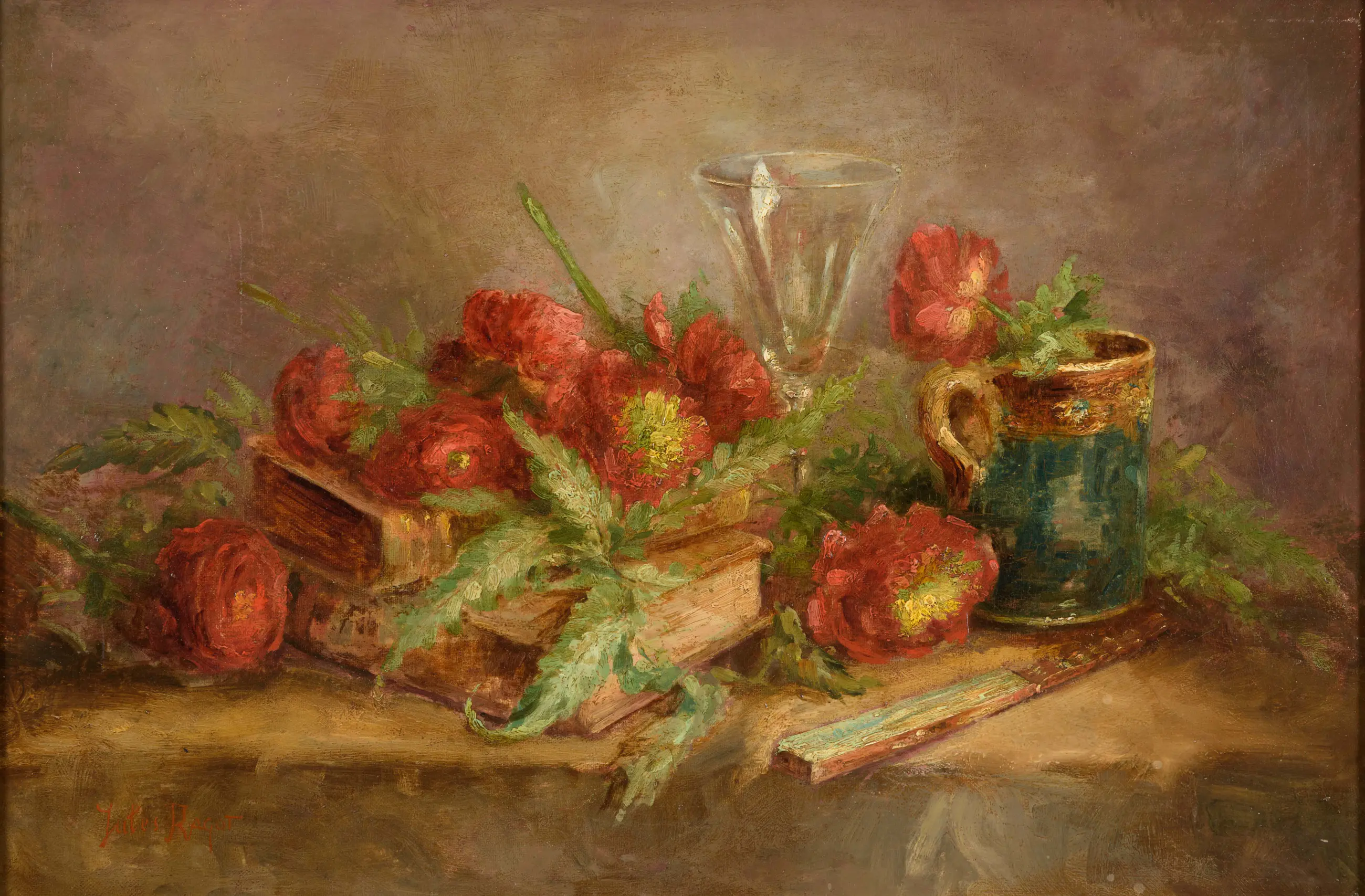 Jules Ragot (1835-1910) was een Frans-Belgische schilder afkomstig uit Parijs. Het werk is linksonder door Ragot gesigneerd.