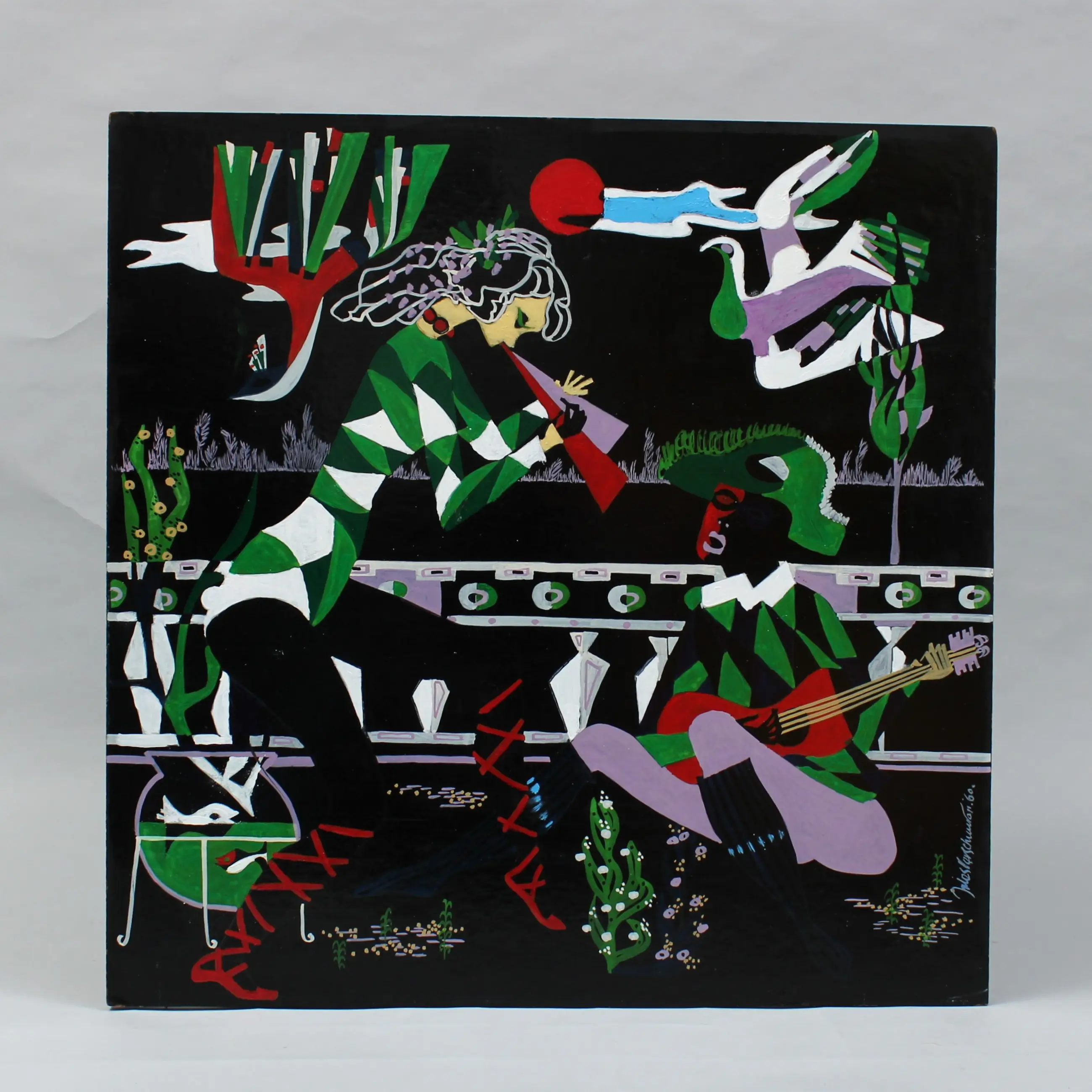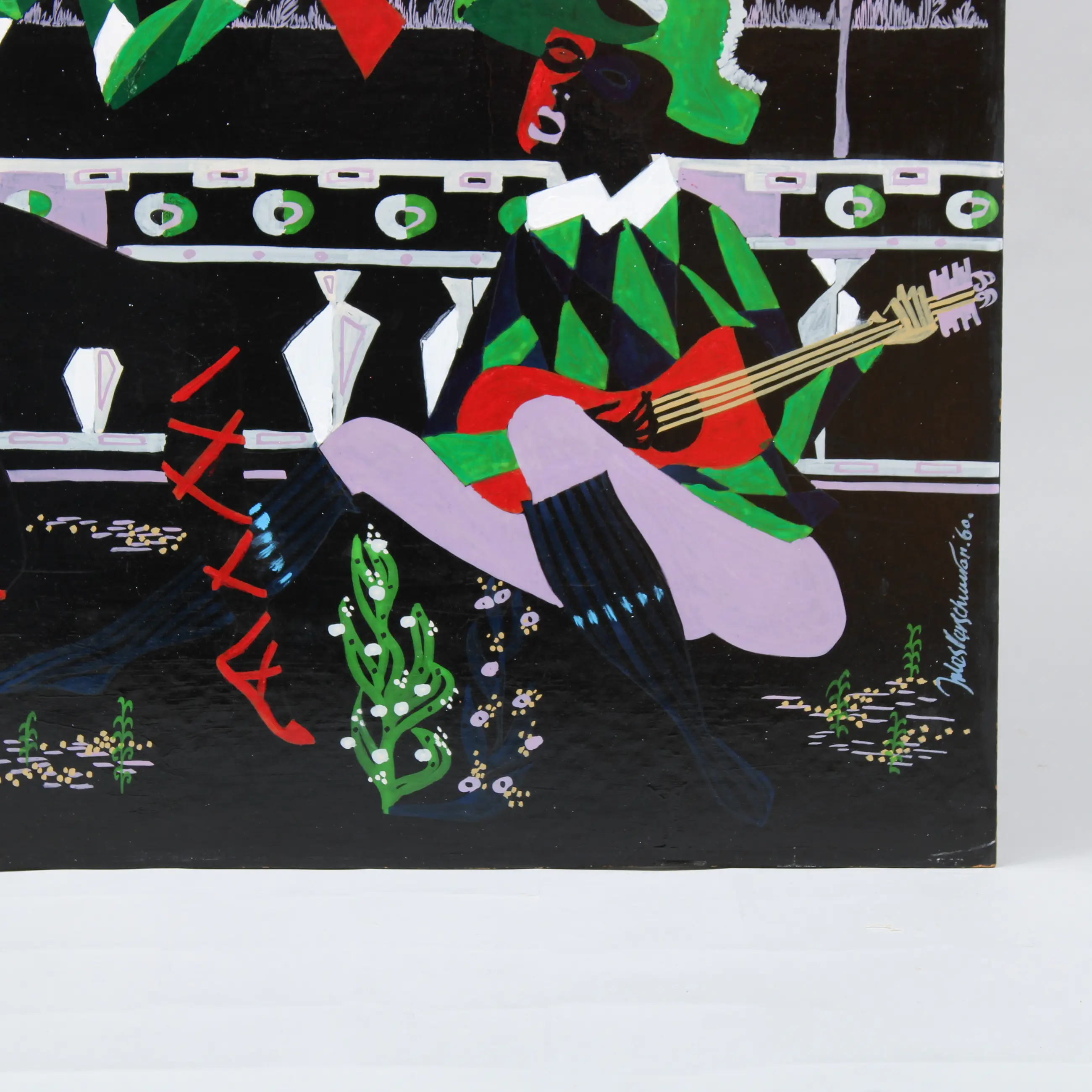 Jules Louis Marie Verschuren (1920) Compositie met musicerende figuren, olieverf geschilderd op paneel (hardboard). Gesigneerd en gedateerd in de rechter onderhoek. Normale sporen van gebruik zoals te verwachten na ruim 60 jaar.
