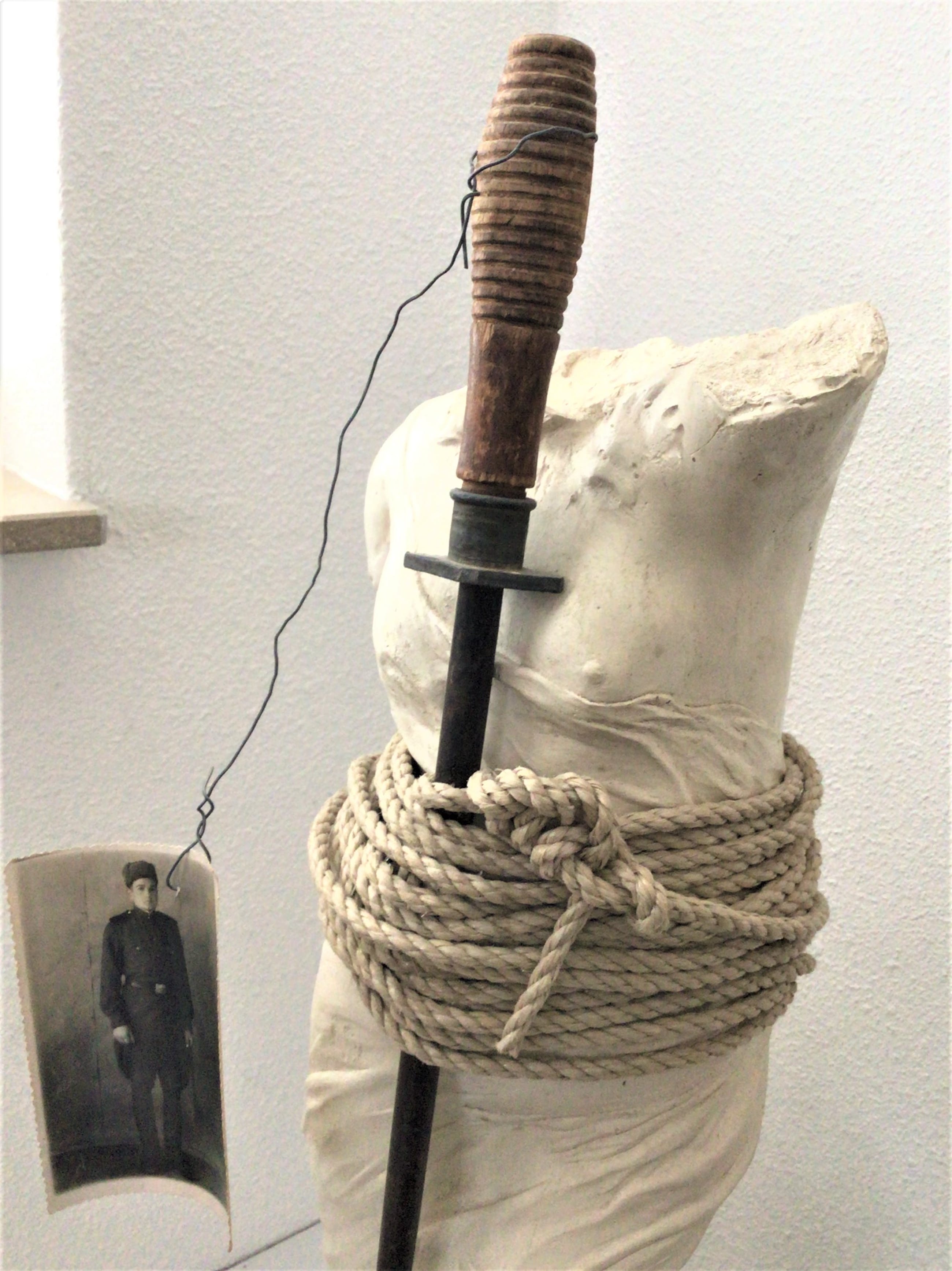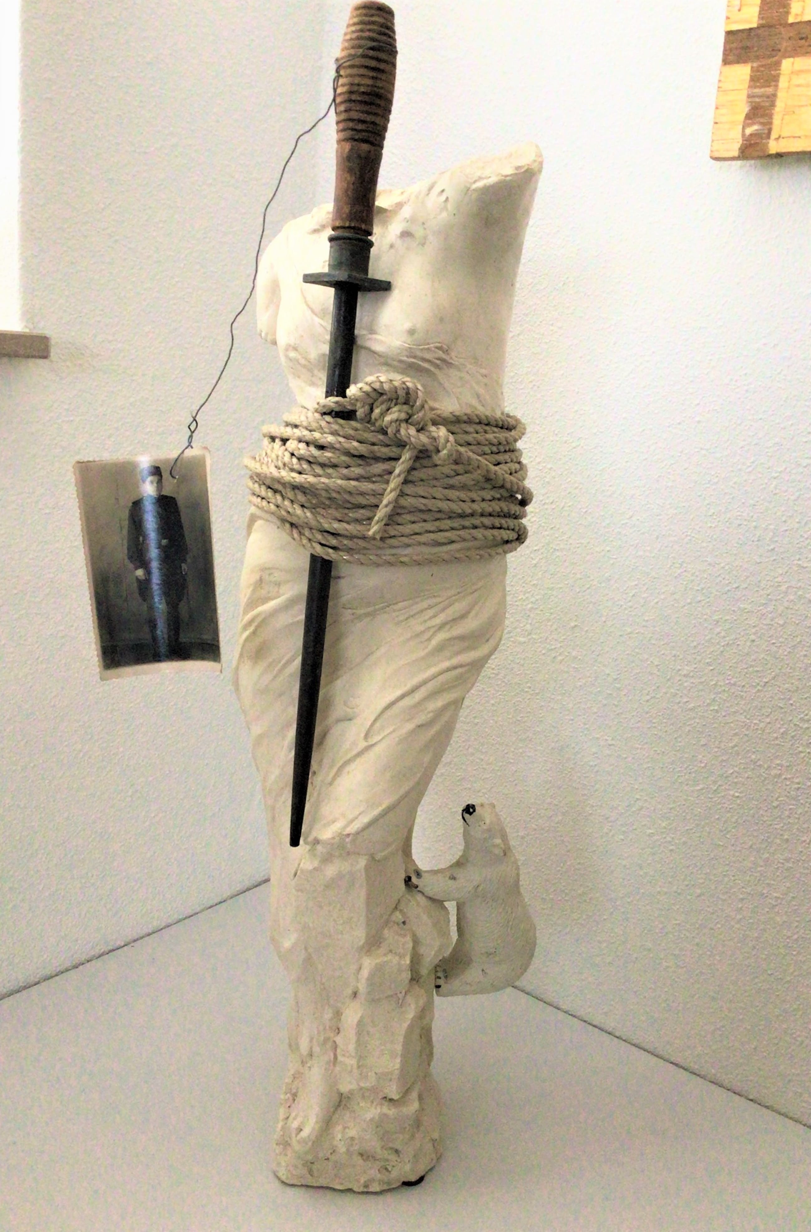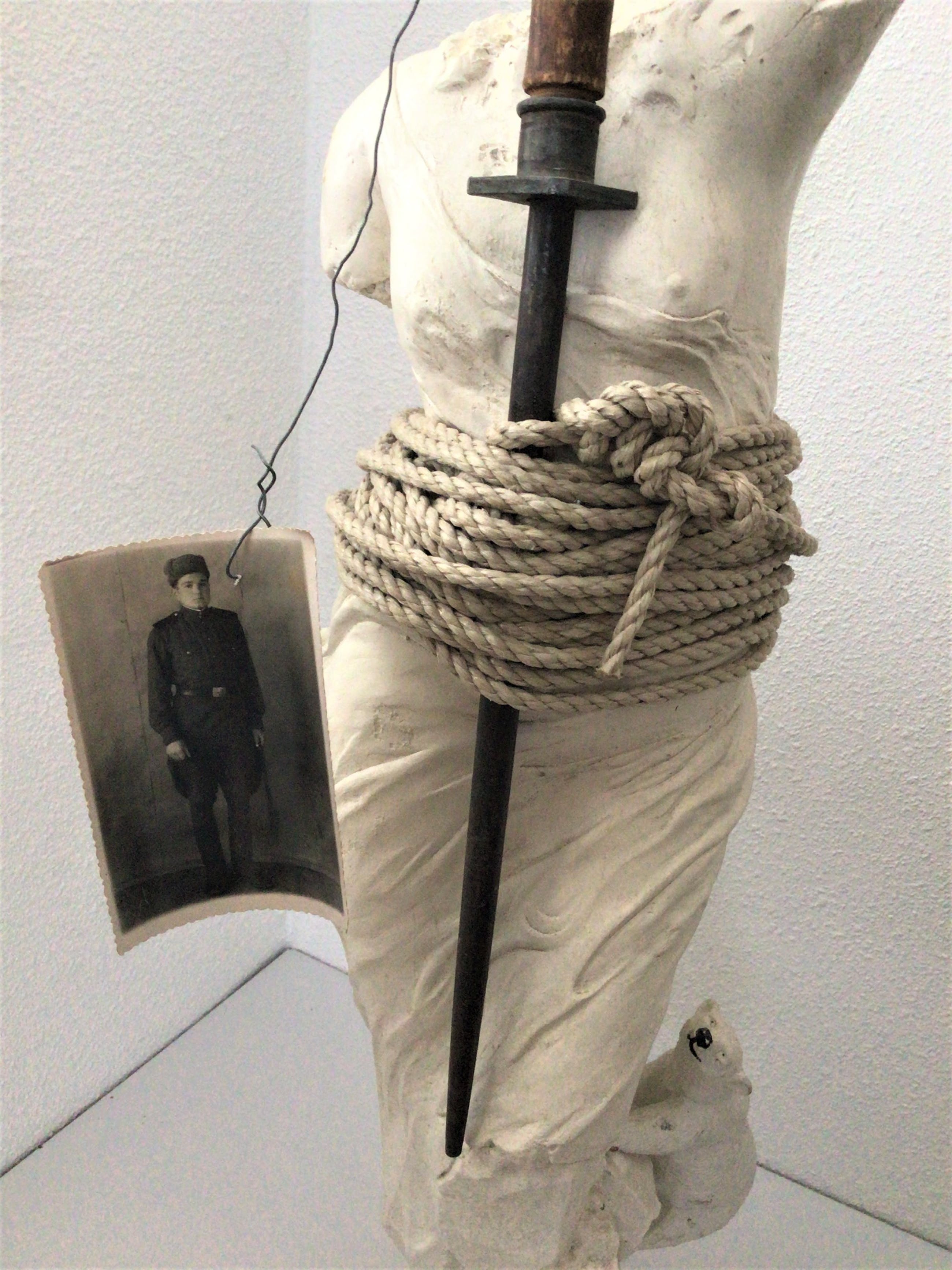 Materialen: Gips, touw, metaal, hout, plastic en zw/w foto.