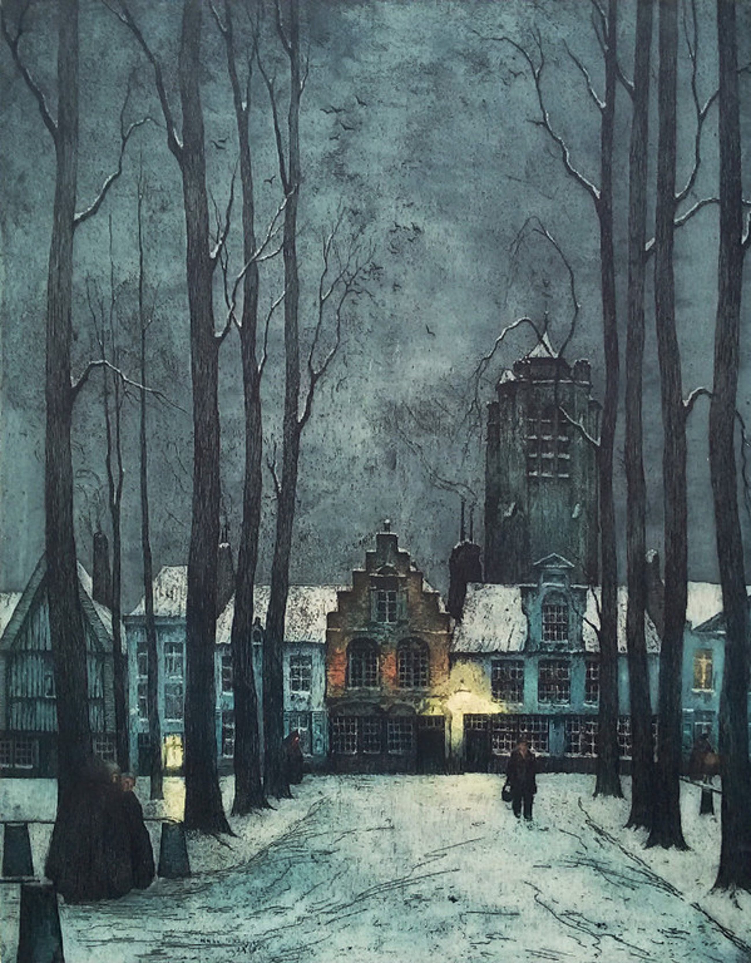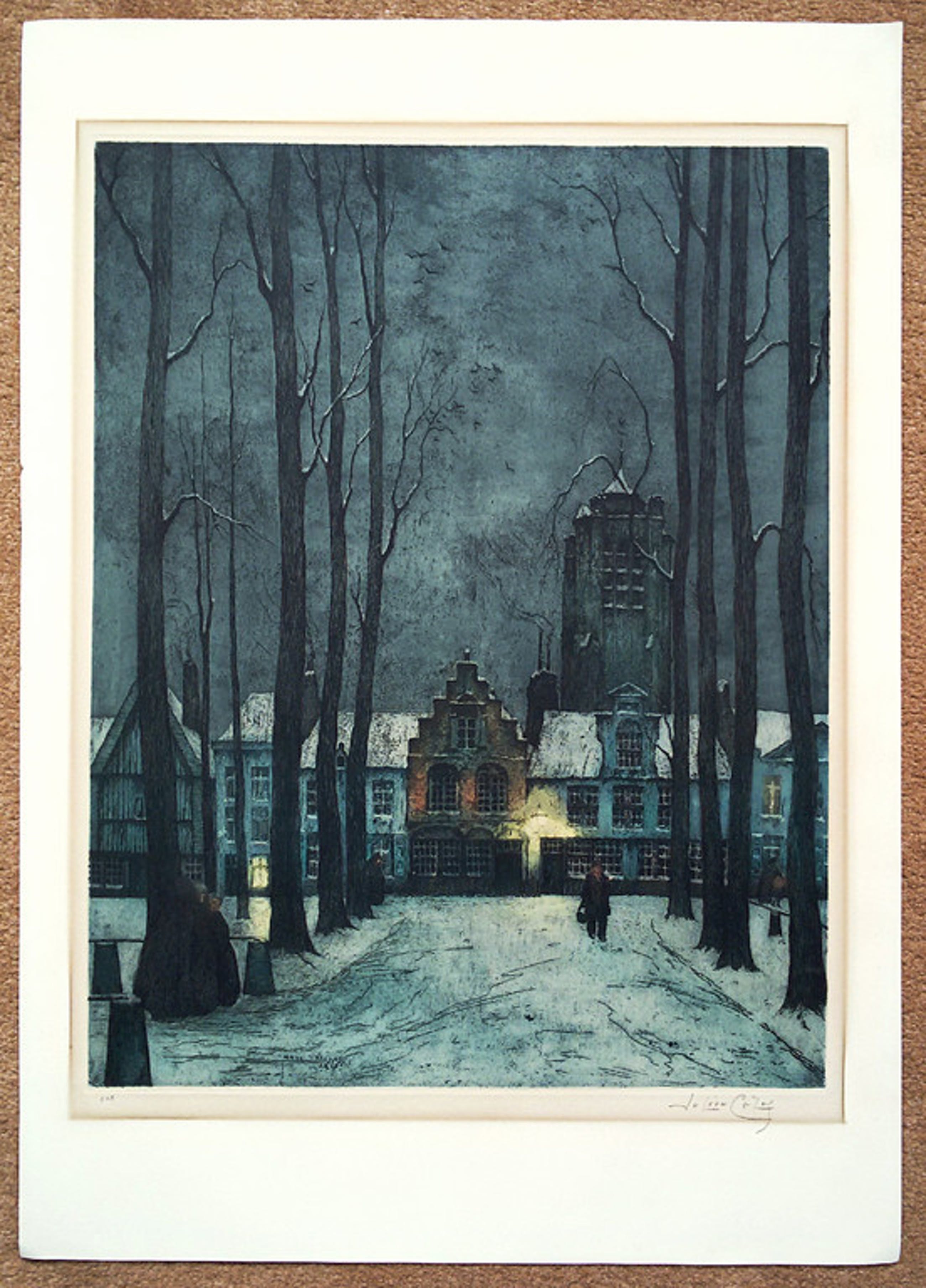 Grote ets van de Antwerpenaar Julien Celos. Kleurenets op papier, met potlood gesigneerd en genummerd (101). In redelijk goede conditie. Werk heeft ingelijst gezeten want het blad is sterk verkleurd binnen een voormalig passe-partout. Ingelijst met passe-partout is het werk prima want door de donkere tinten van de ets valt de verkleuring nauwelijks op.