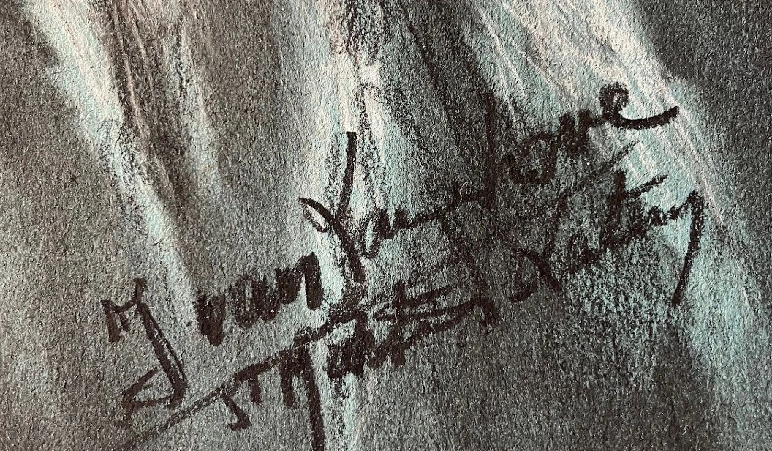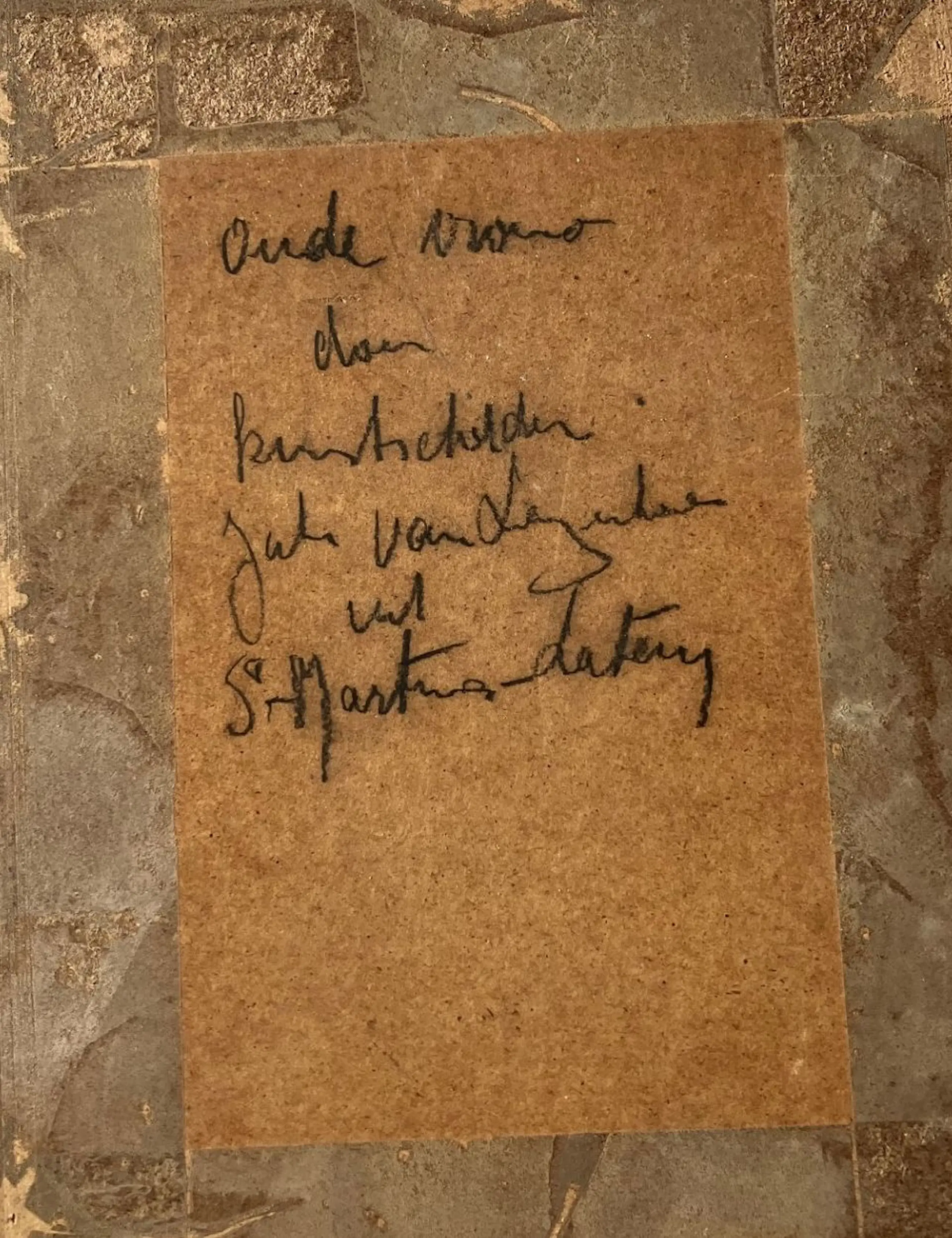 Tekening op blauw licht karton, in kader achter glas. Dit kan eventueel zonder kader en glas gemakkelijk verstuurd worden met de houten achterzijde waarop handgeschreven tekst staat