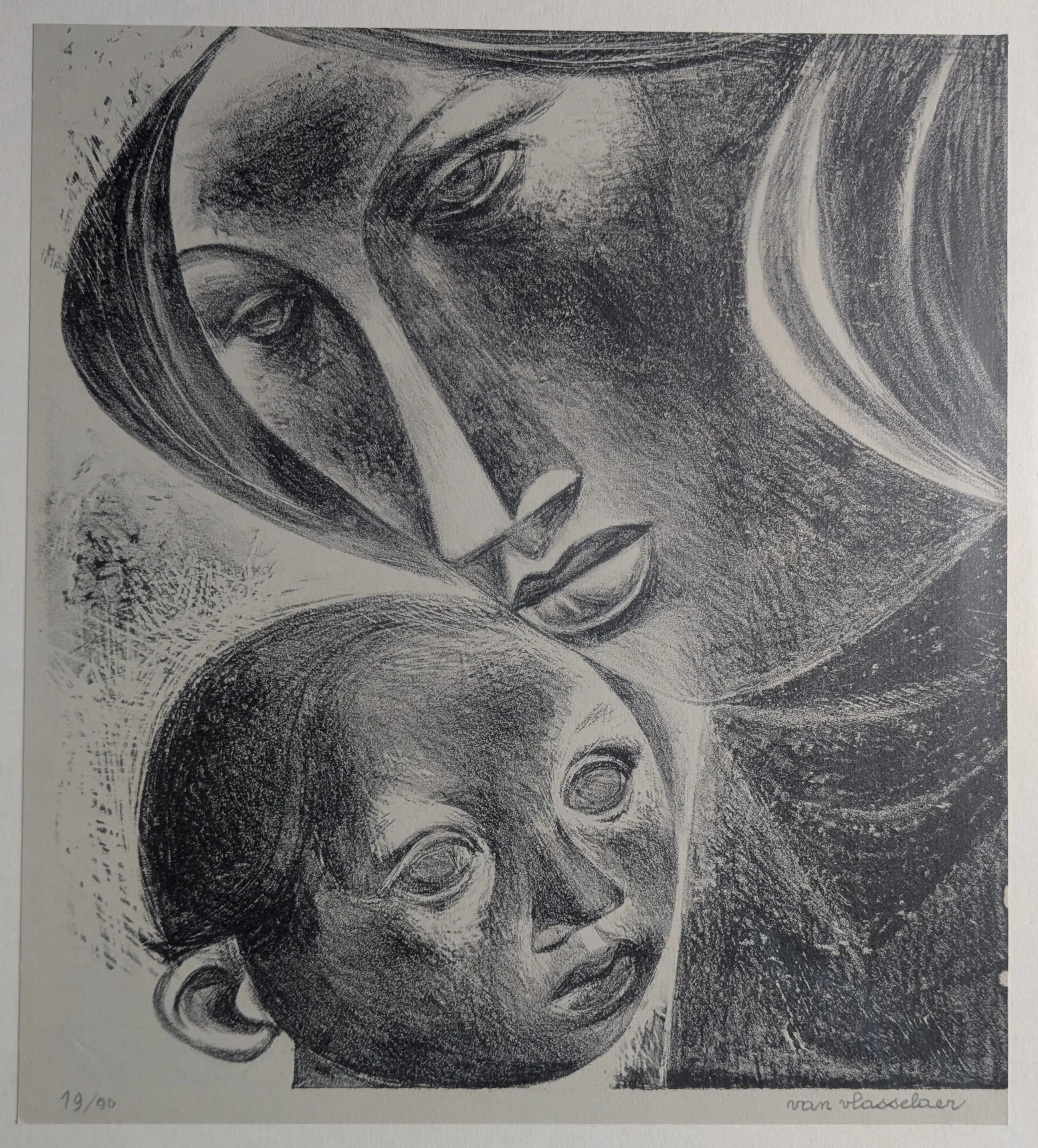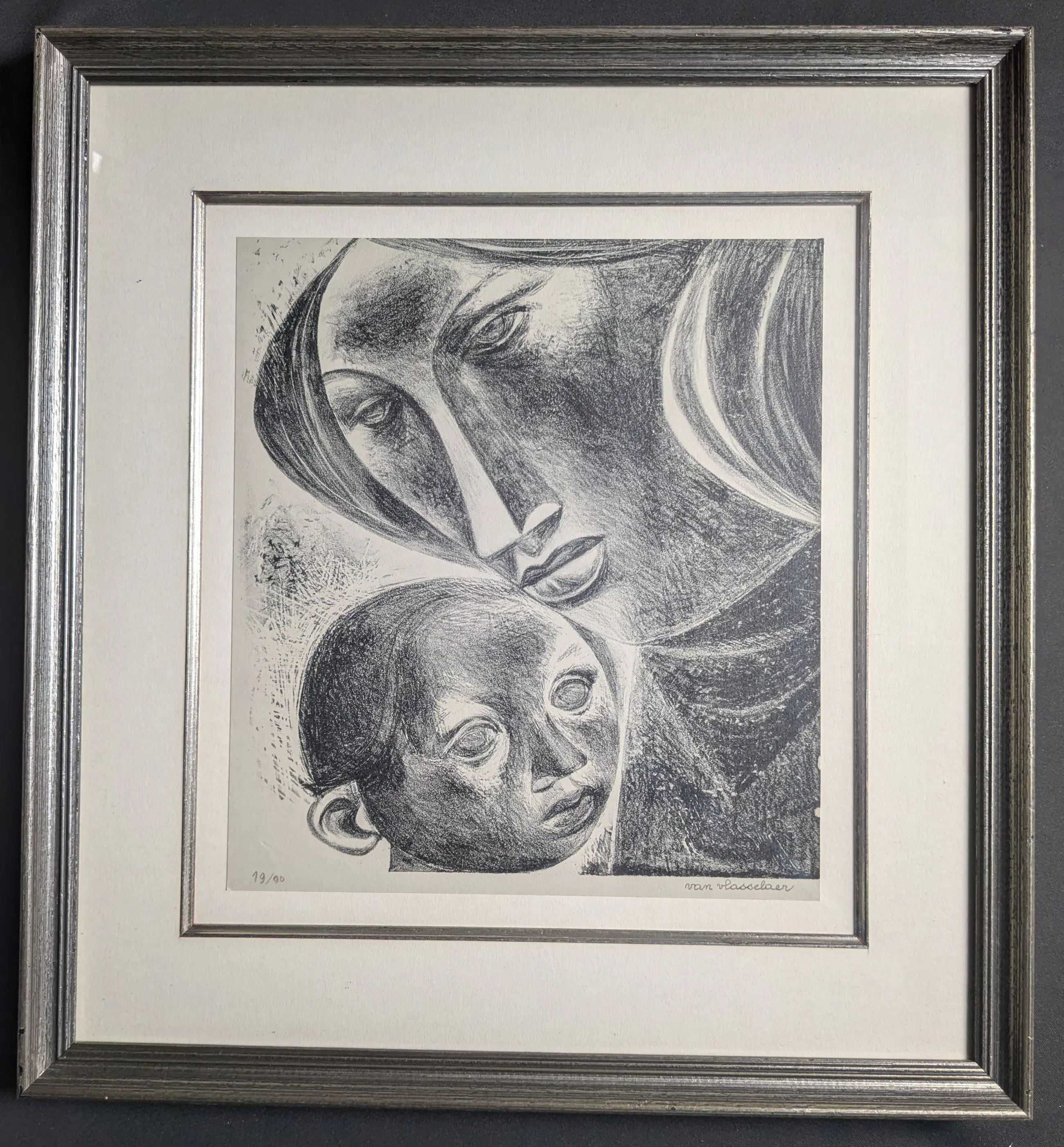 Op de litho staat een vrouw met kind. mooi expressief en modern weergegeven. Goed exemplaar.