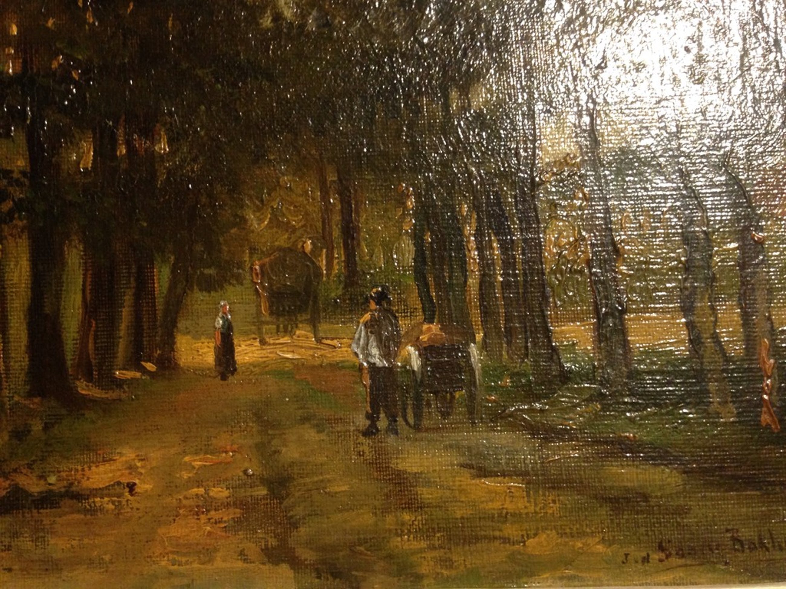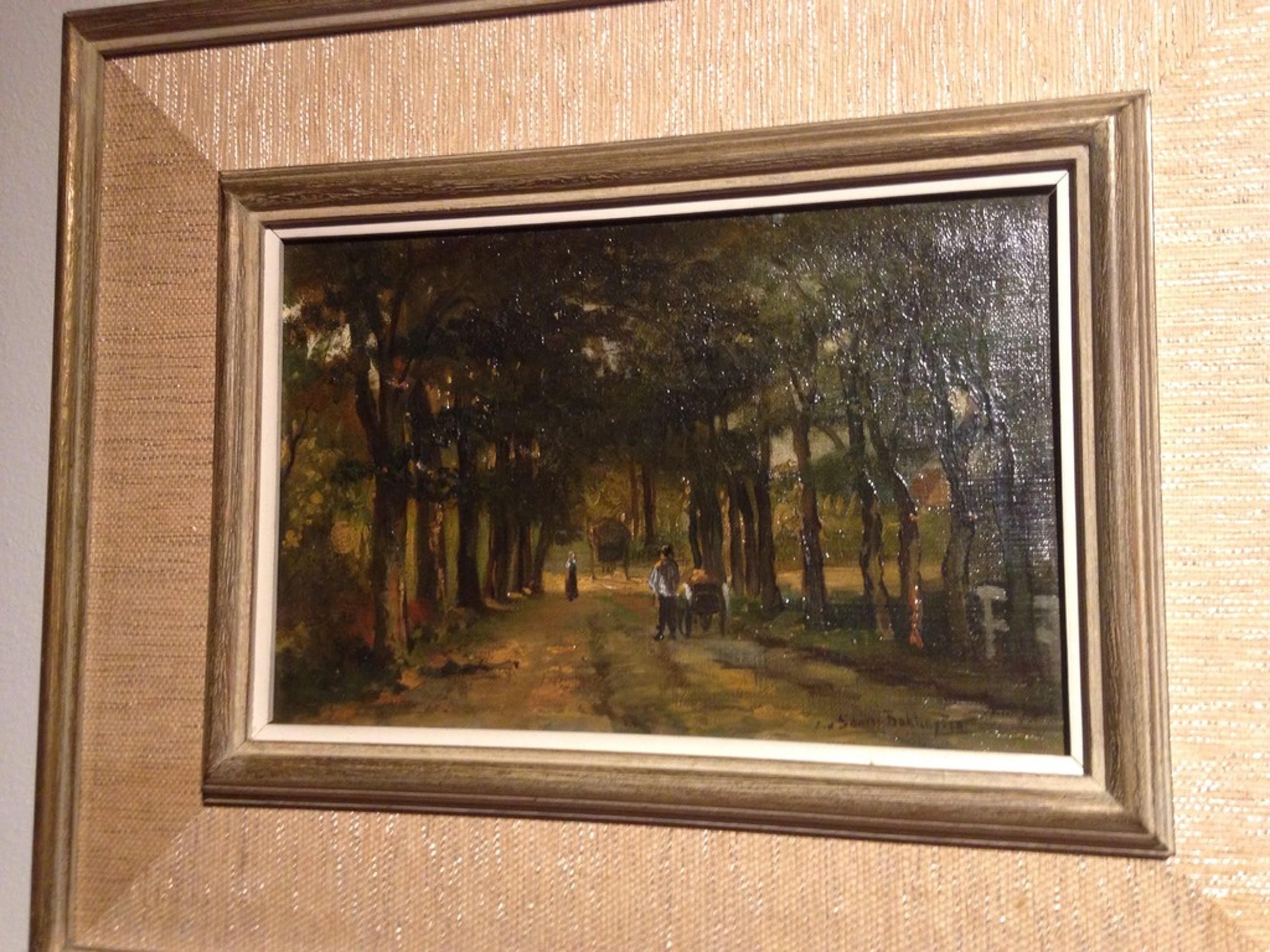 Schilderij olieverf op doek van bosweg met mensen en kar. Prima staat.