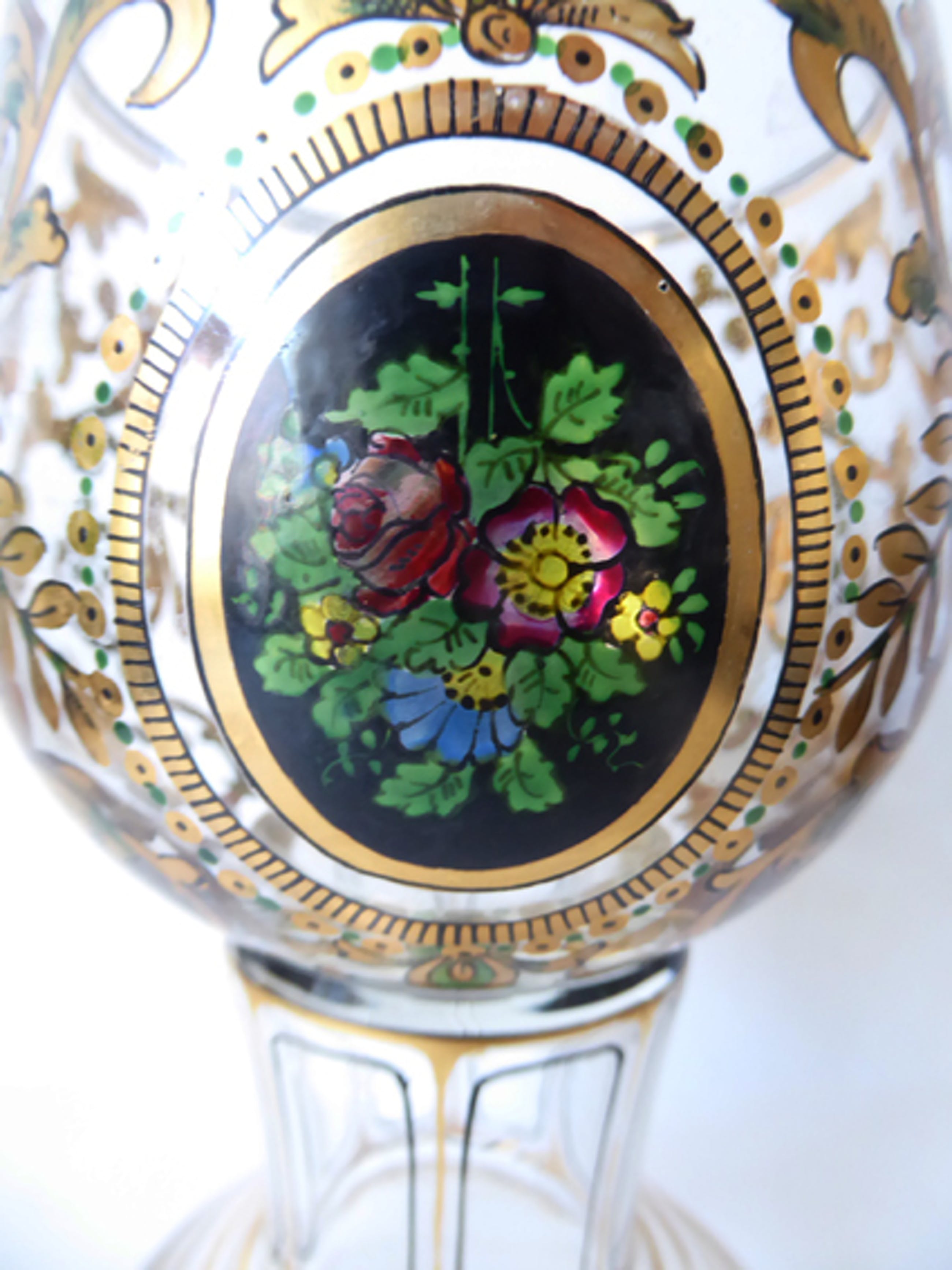 glas, floraal decor met zwarttin en gouden ornamenten.