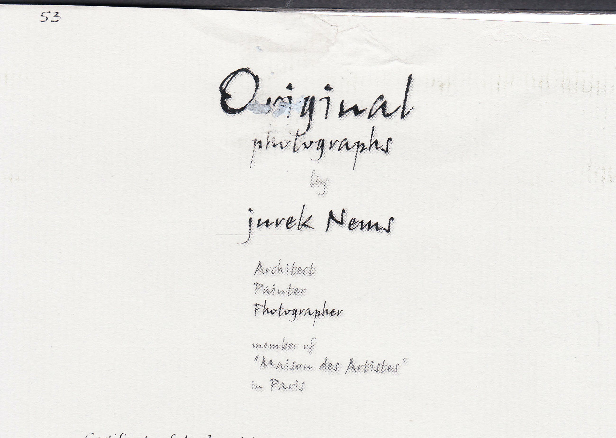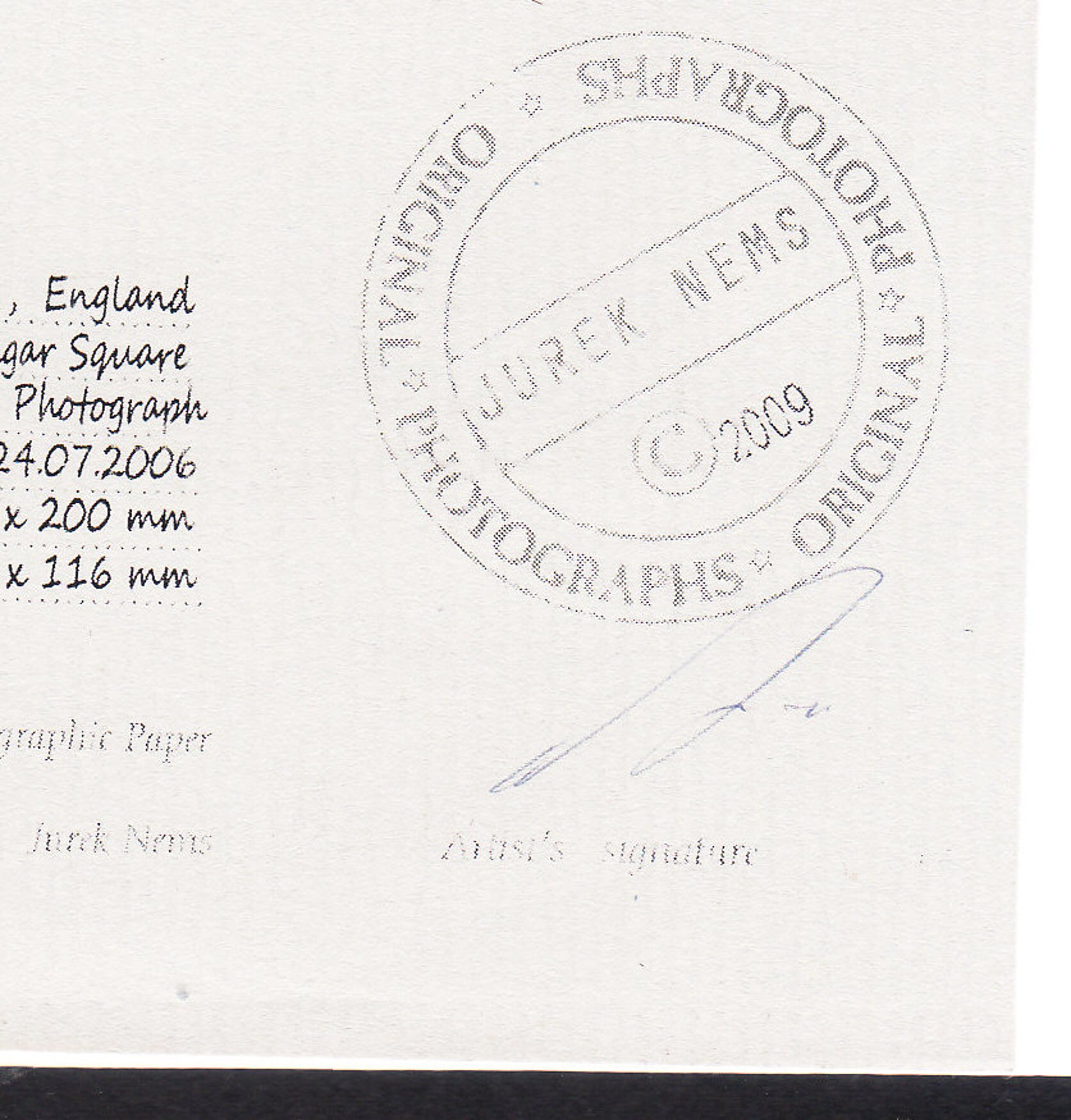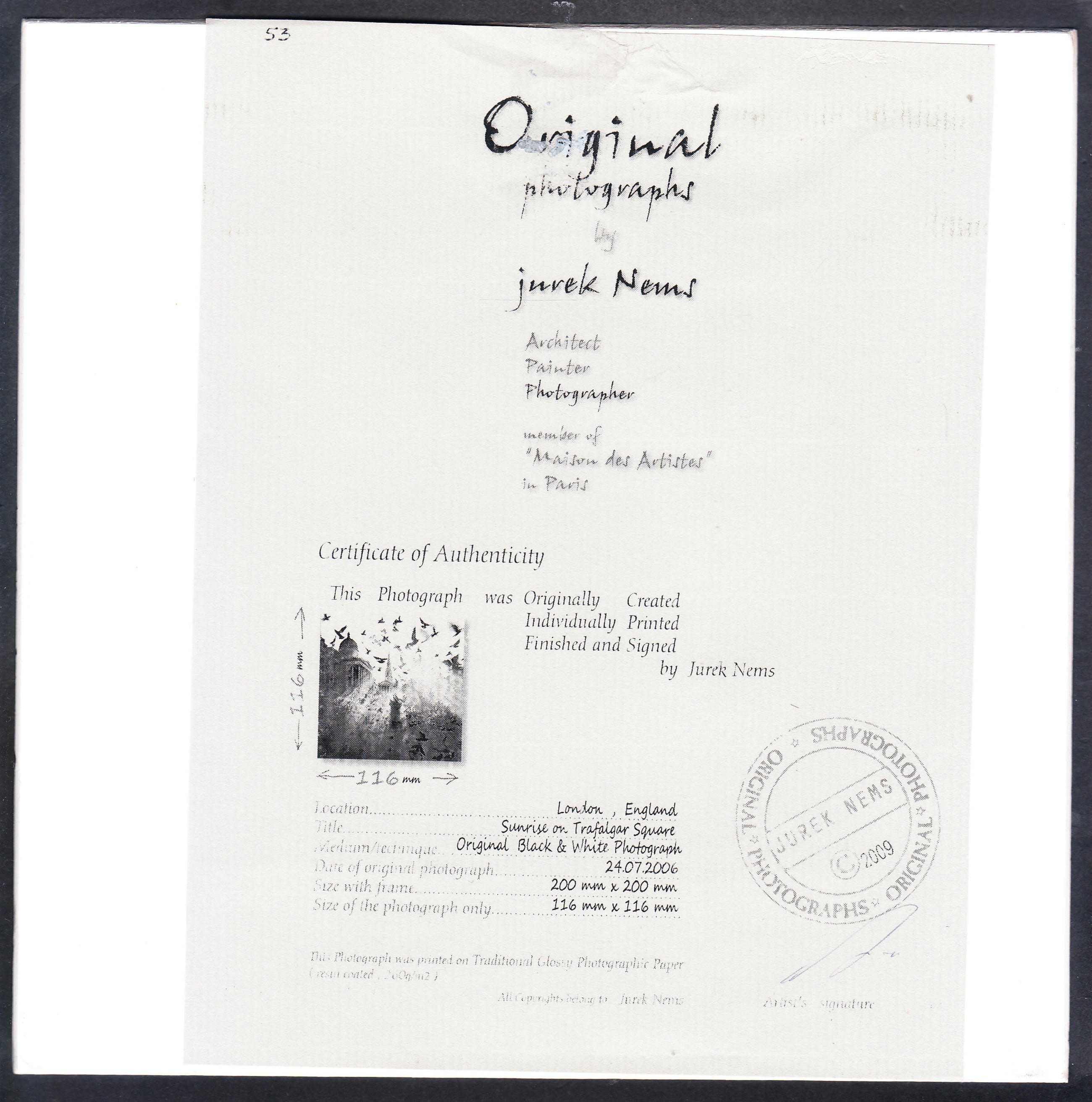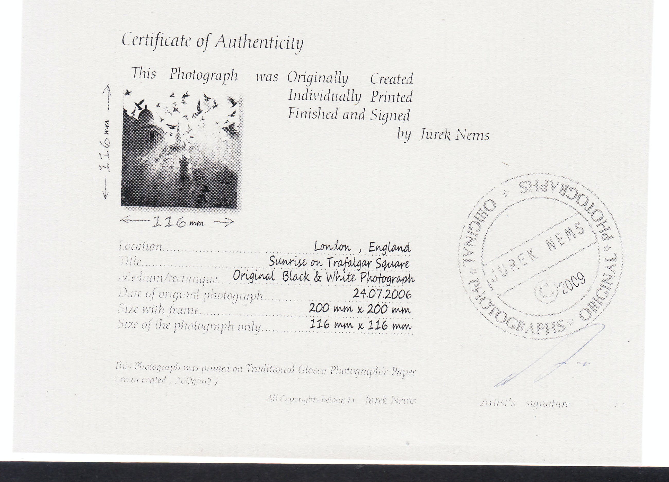 Original Black & White Photograph by Jurek Nems ( Architect , Painter & Photographer ) signed by hand with pencil , including Certificate of Authenticity . Size with frame 200 x 200 mm. Size of the photograph only 116 x 116 mm.