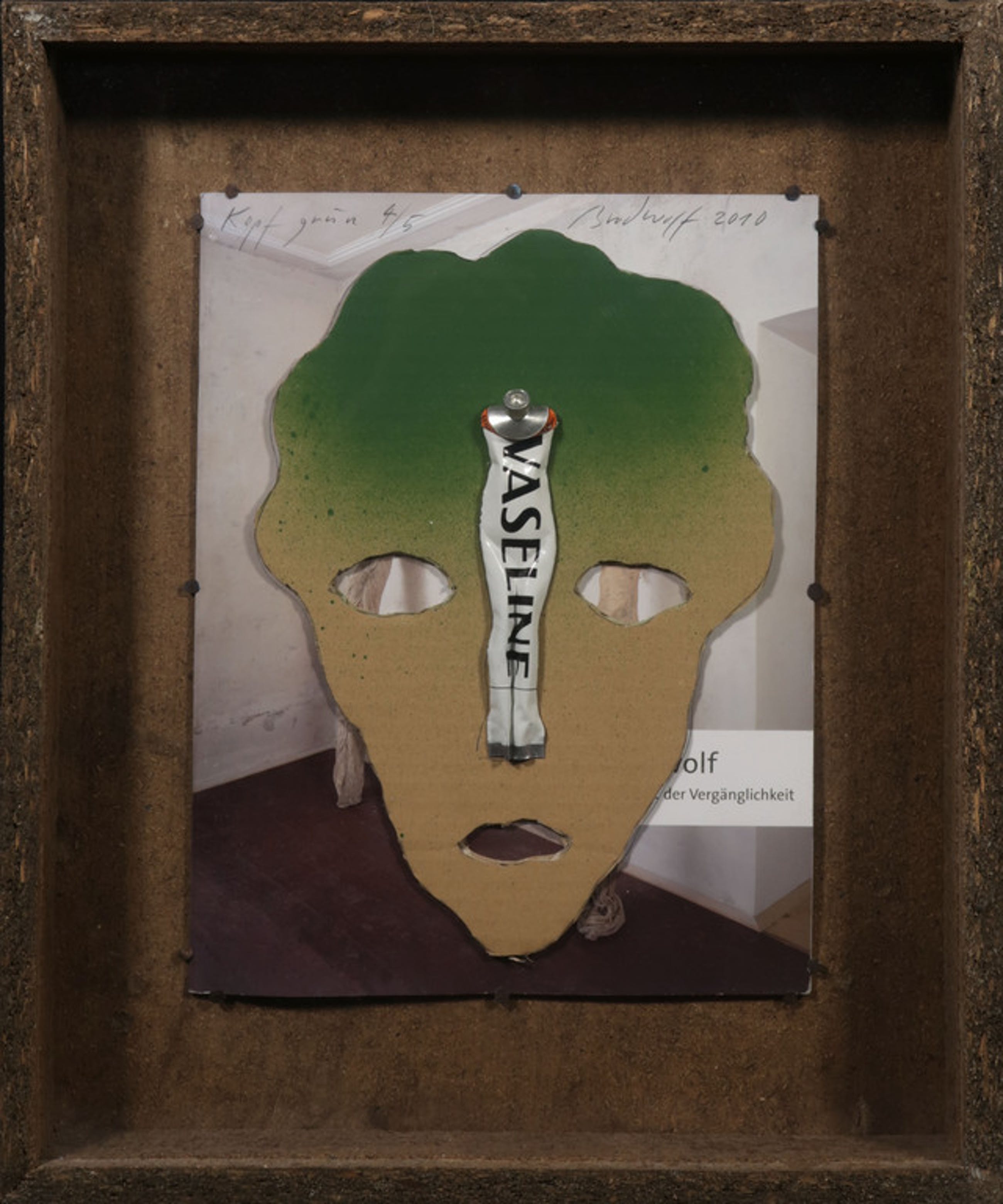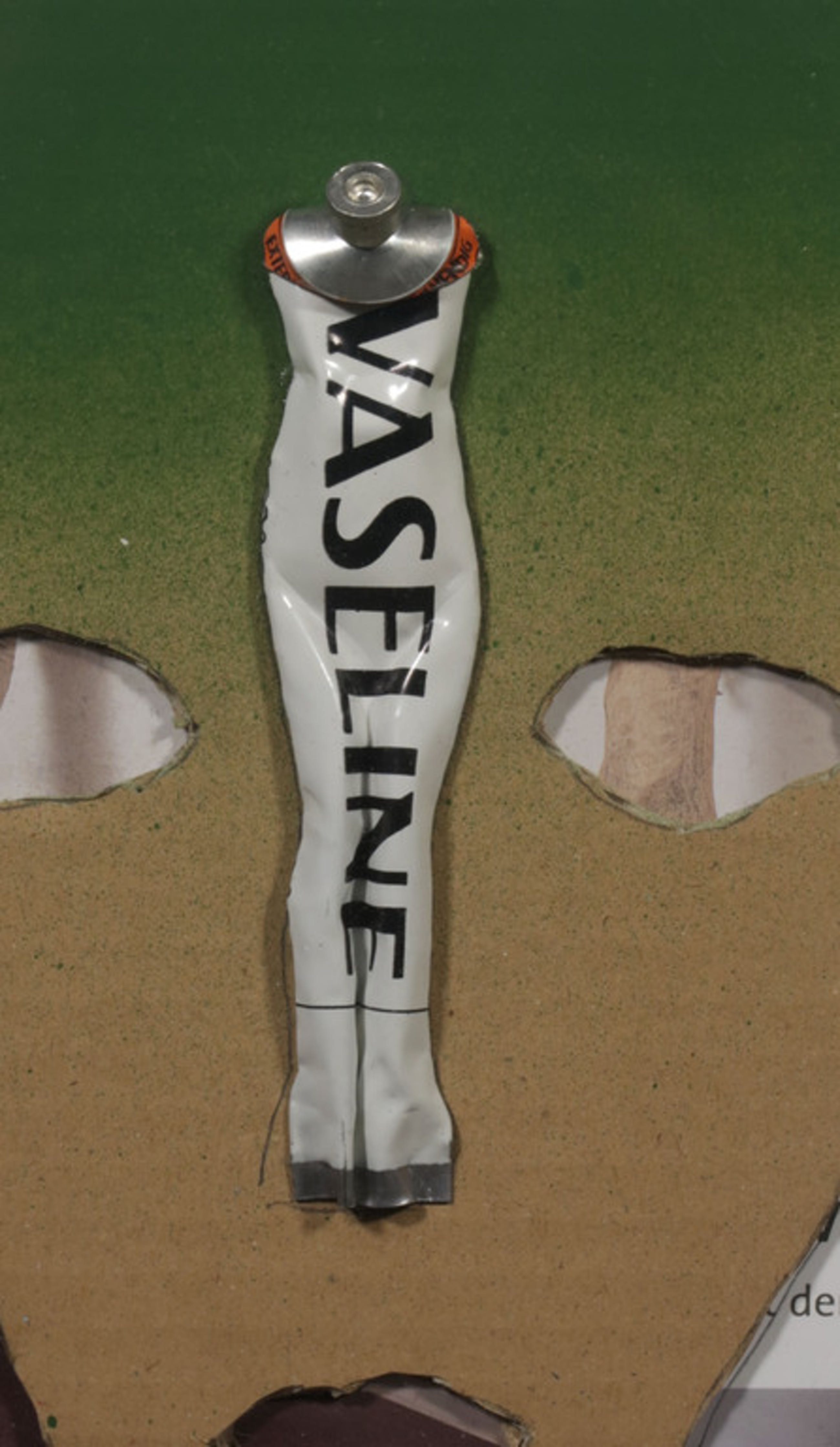 Materiaal: Assemblage: Verftube op karton op tijdschrift