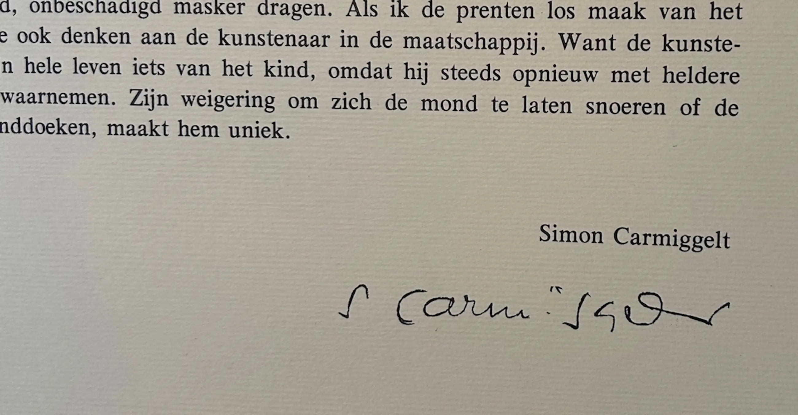 (Aalst 1978). Nr.11/50exx. Map met bindlinten waarin 10 losse bladen, waarop het gesigneerde verhaal van Carmiggelt en vijf handgekleurde etsen en een litho (het portret van Carmiggelt), telkens gesigneerd door Schneider. Een ets heeft ook nog een preegdruk. De bladmaat is 50 cm hoog en 35 cm breed. De halflinnen map met linten meet 62 bij 45 cm.