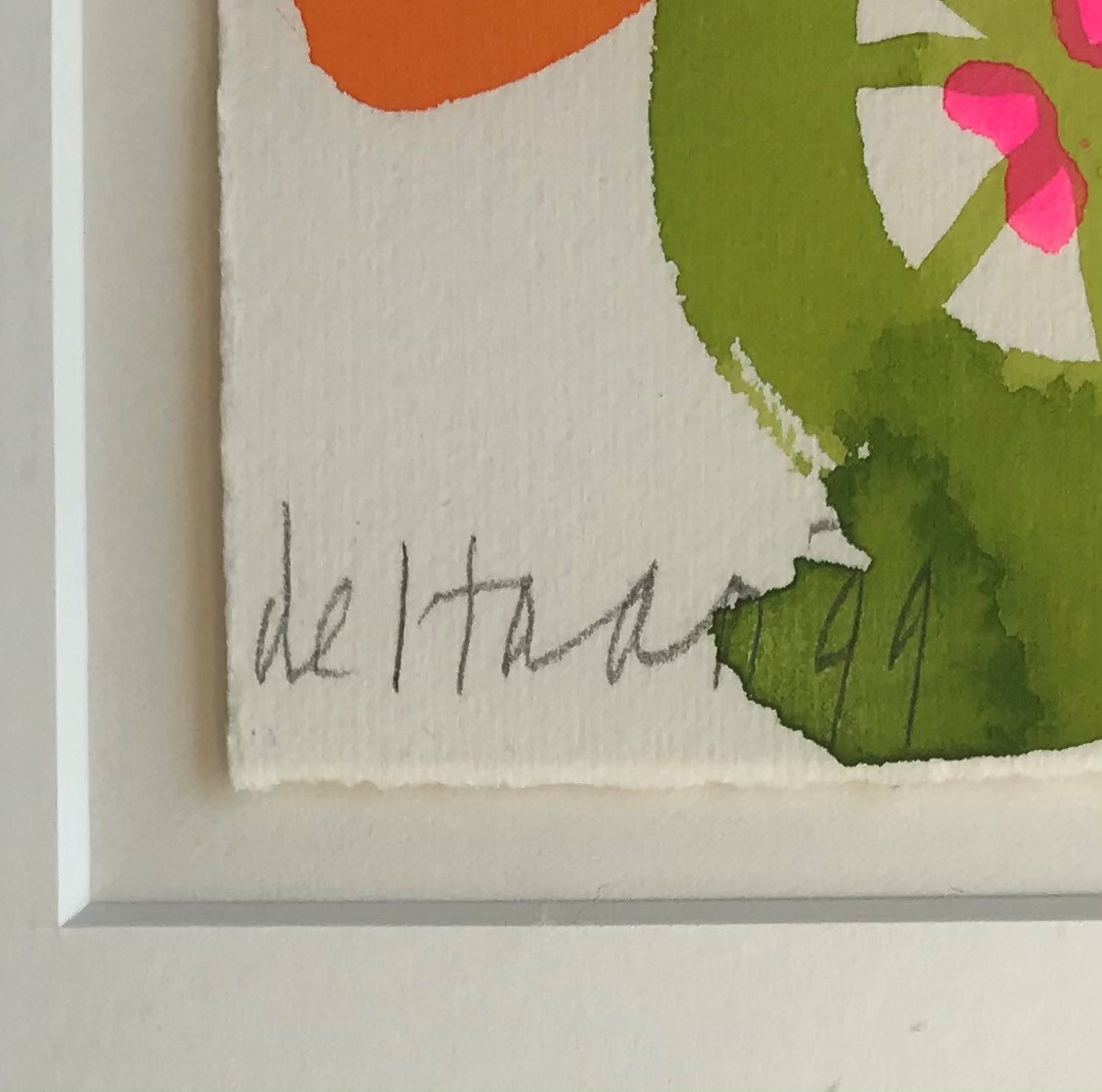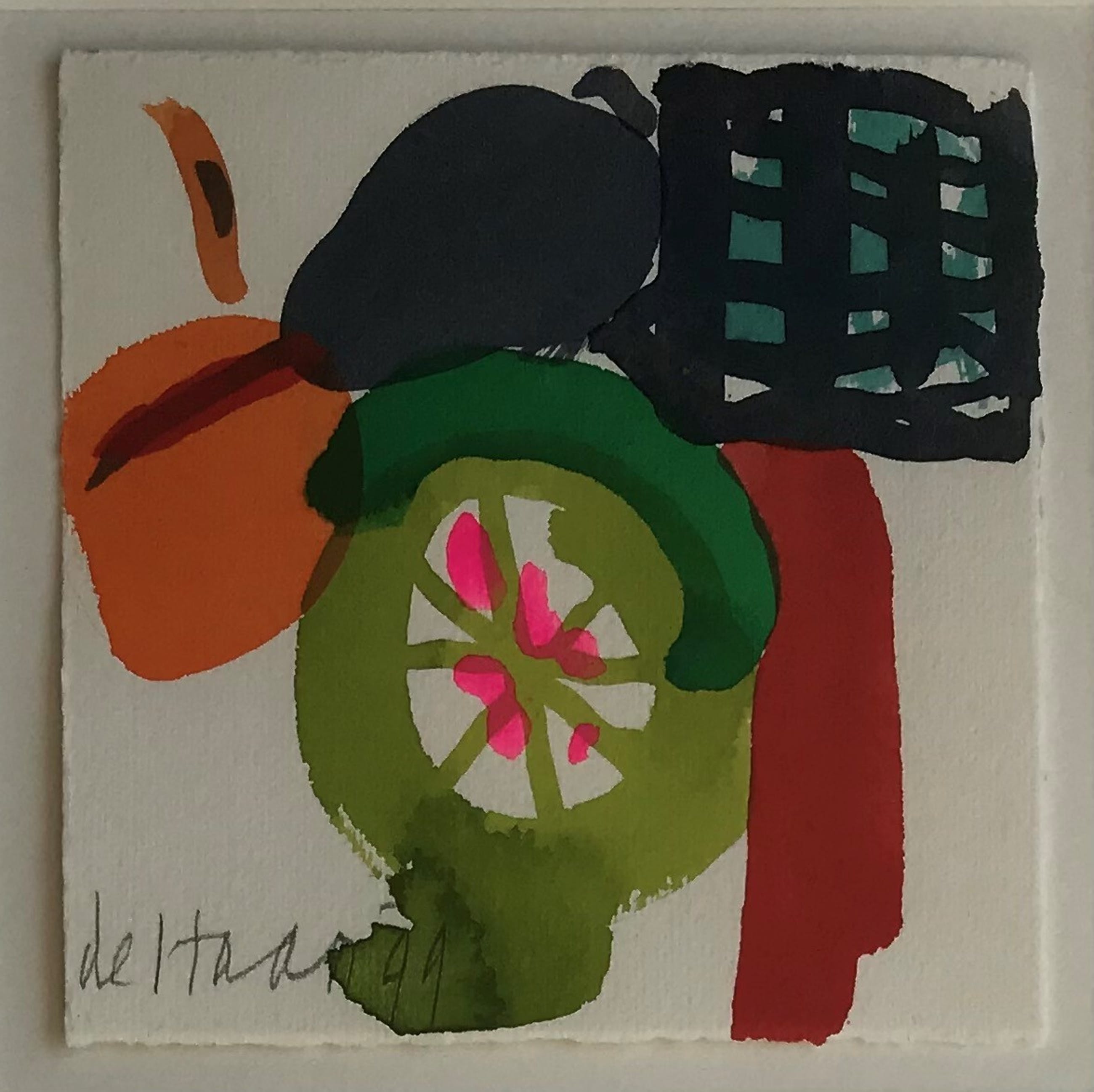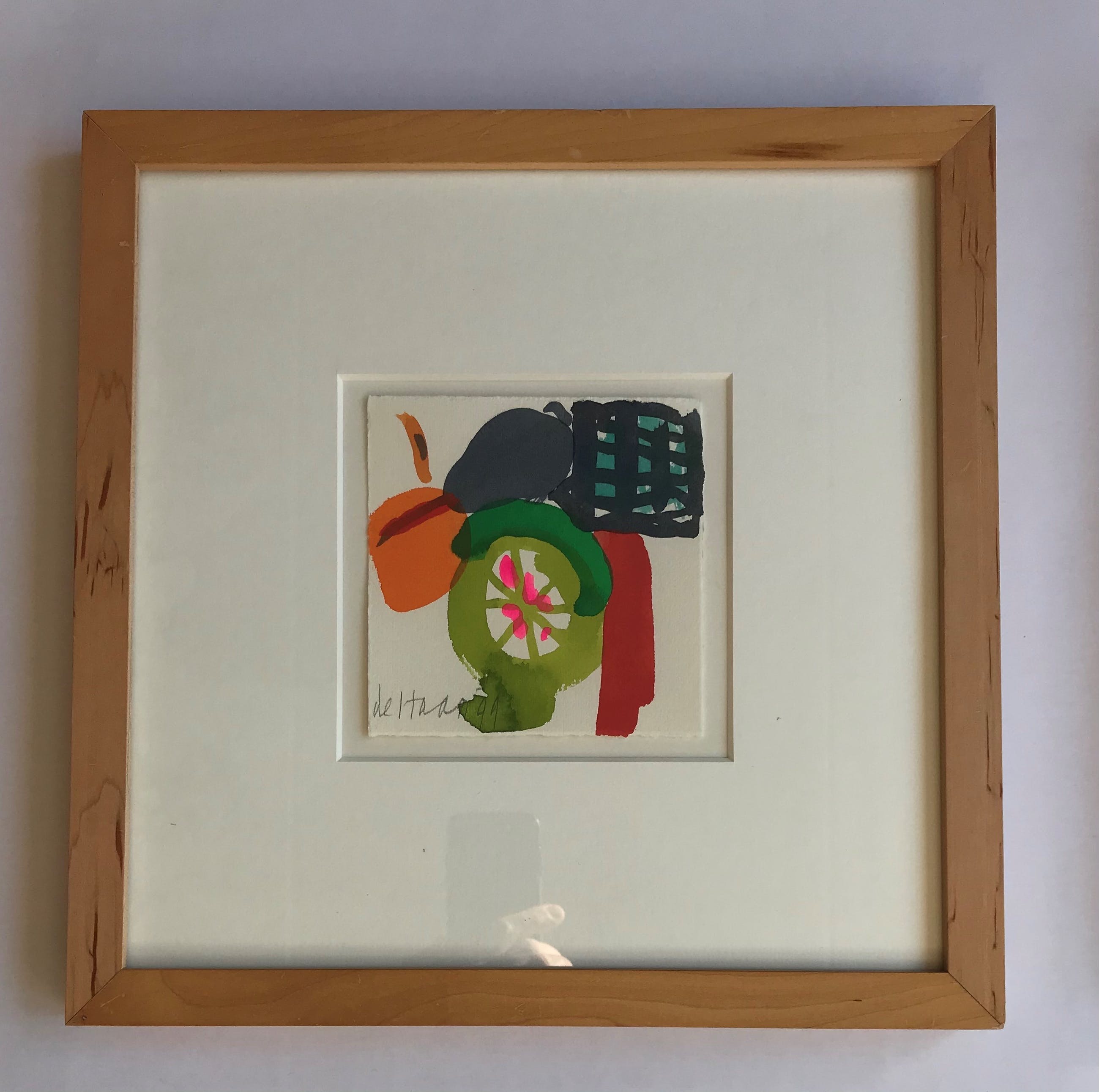 Aquarel van 12 x 12 cm op geschept papier, ingelijst binnen passe partout en onder glas.