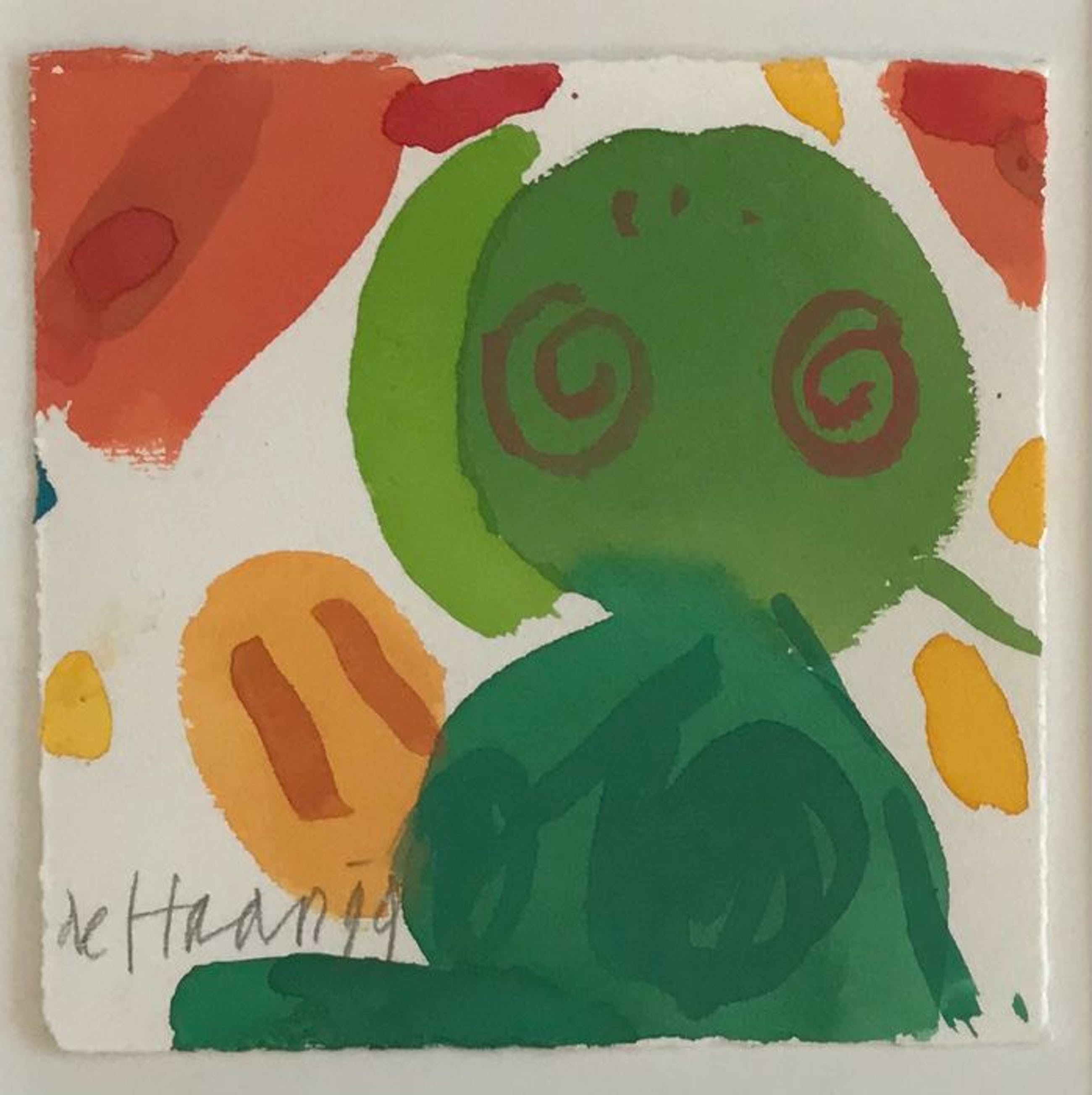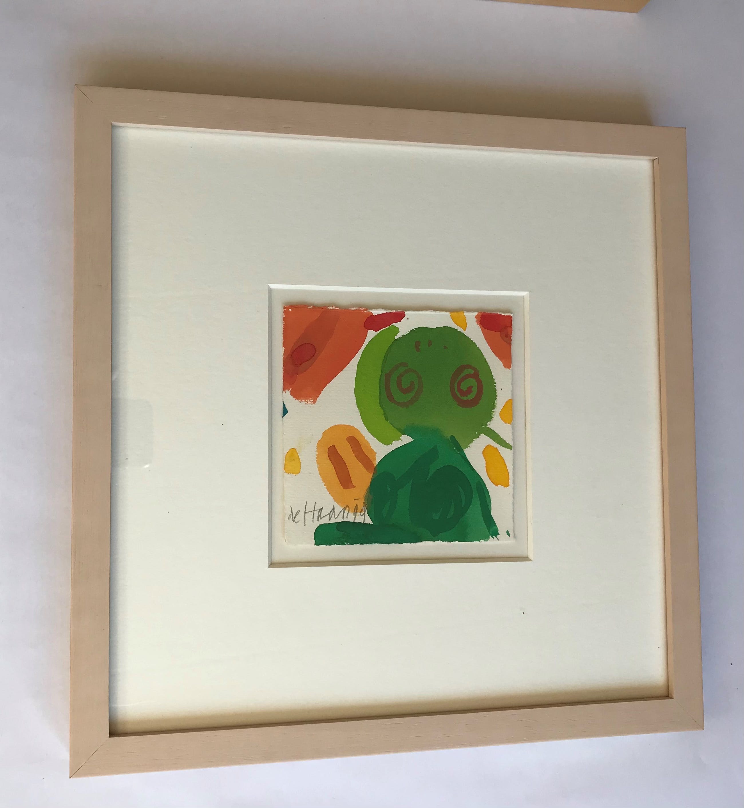 Aquarel van 12 x 12 cm op geschept papier, ingelijst binnen passe partout en onder glas.