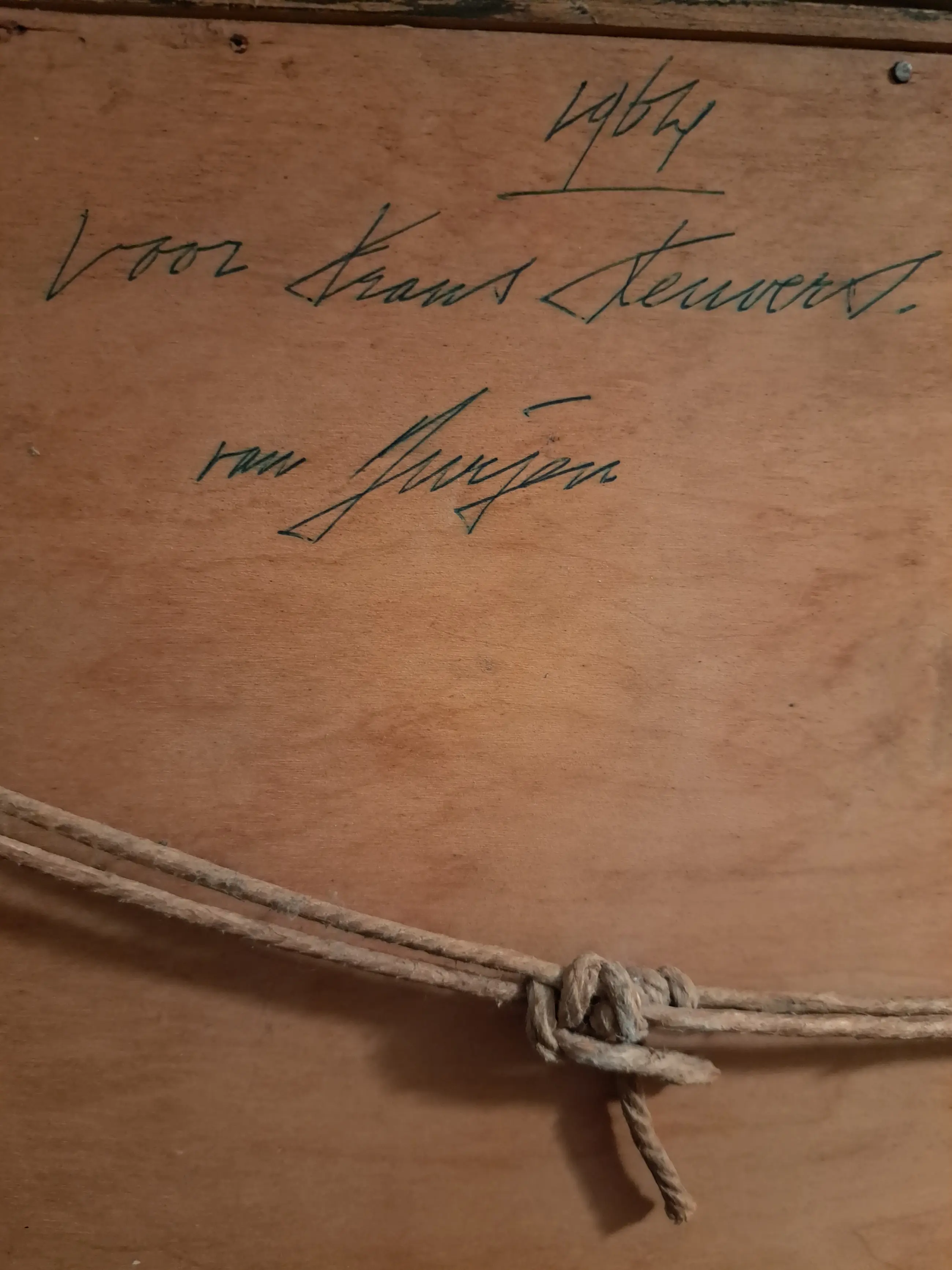 Deze vroege collage in gemengde materialen en technieken is door Jurjen de Haan speciaal opgedragen aan een vriend. De stijl is herkenbaar met ander vroeg werk van De Haan, de techniek is voor zover bekend uniek.