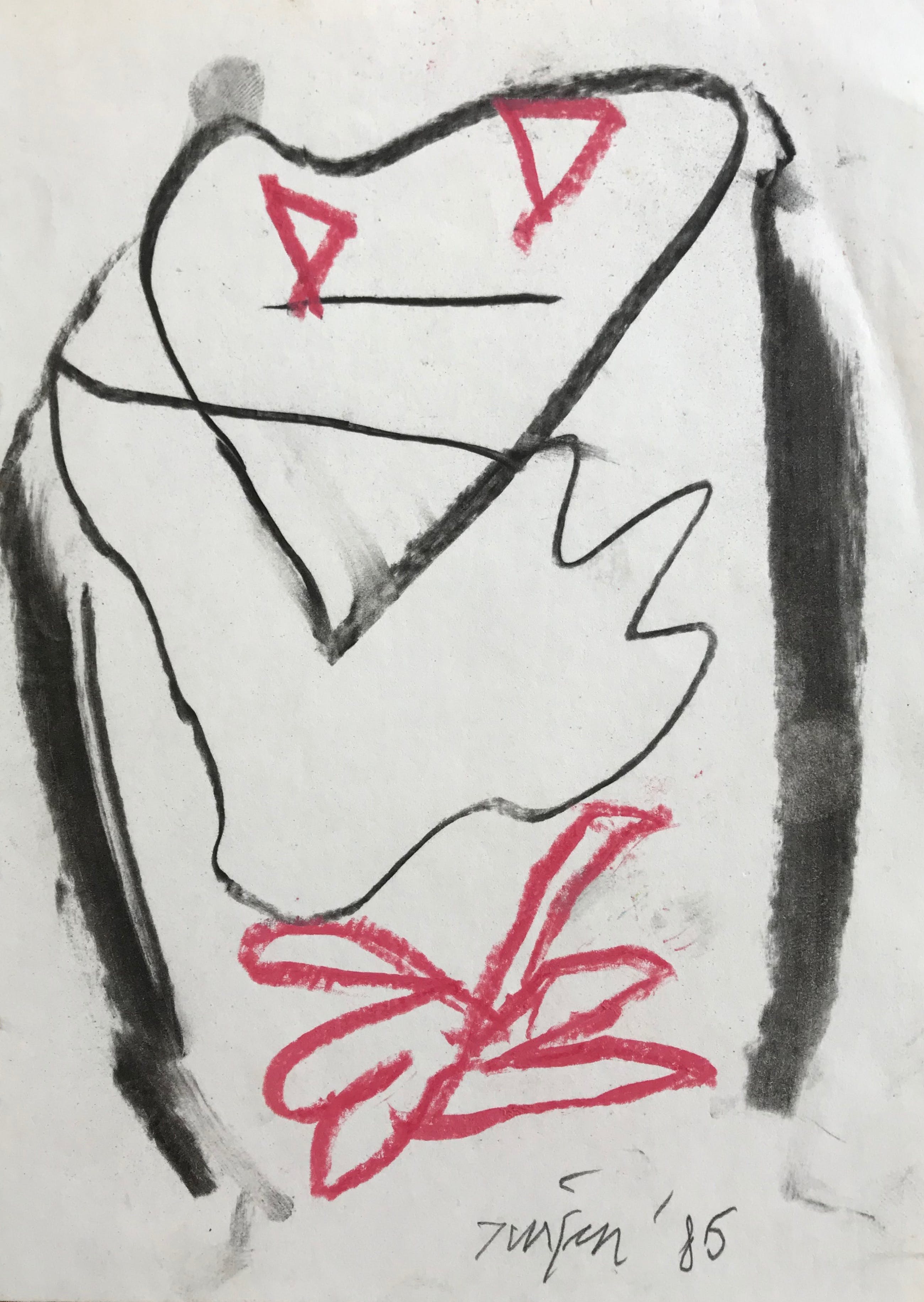 Origineel uniek werkje van de Haagse (Cobra) kunstenaar Jurjen De Haan. Gemengde techniek. Afkomstig uit kunstmap Afmetingen 21,5 x 16,5 cm Gesigneerd en gedateerd 1985'