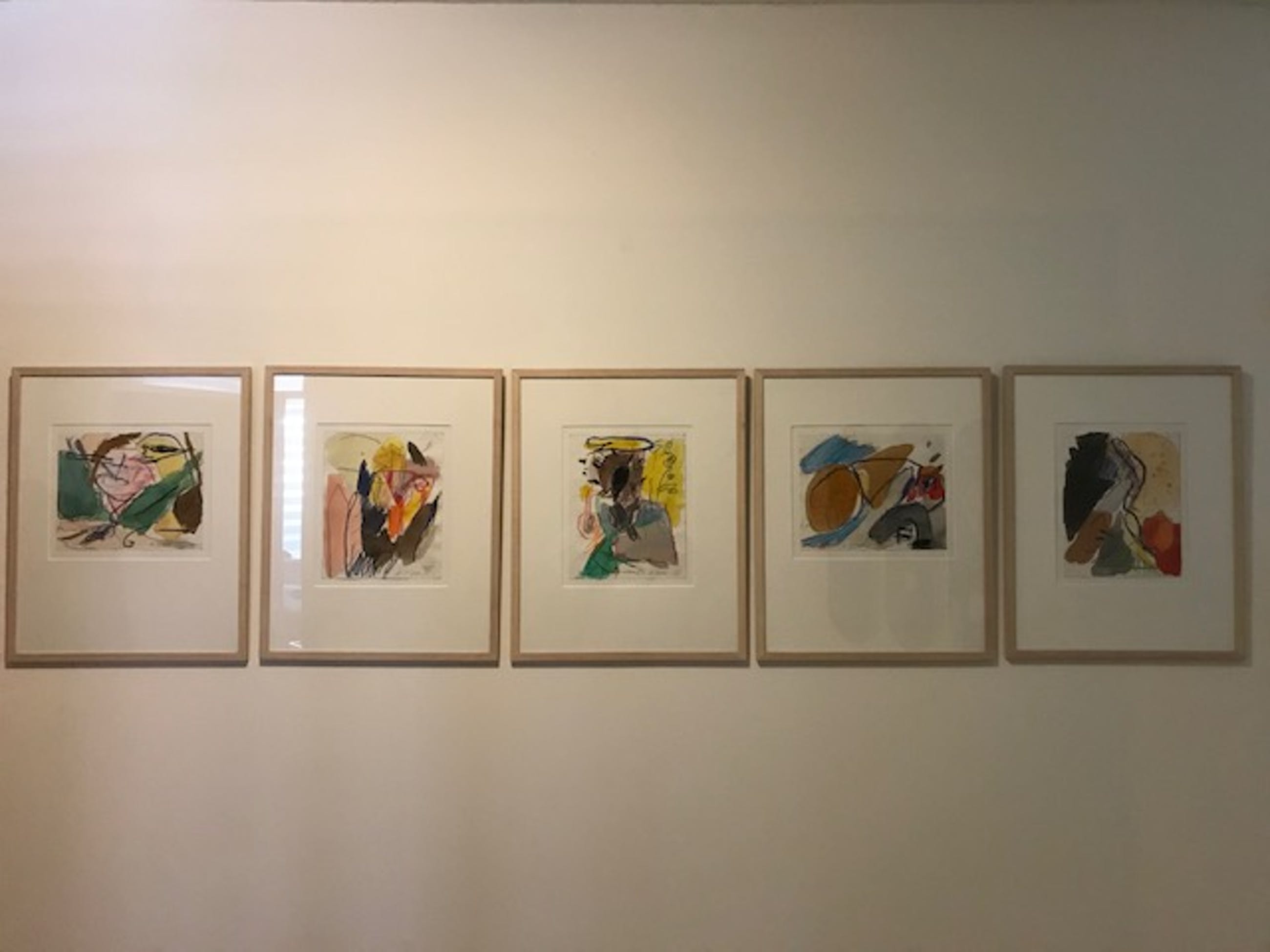 Vijf (5!) originele en verschillende werken uit dezelfde serie in houten lijsten met dezelfde buitenafmetingen.