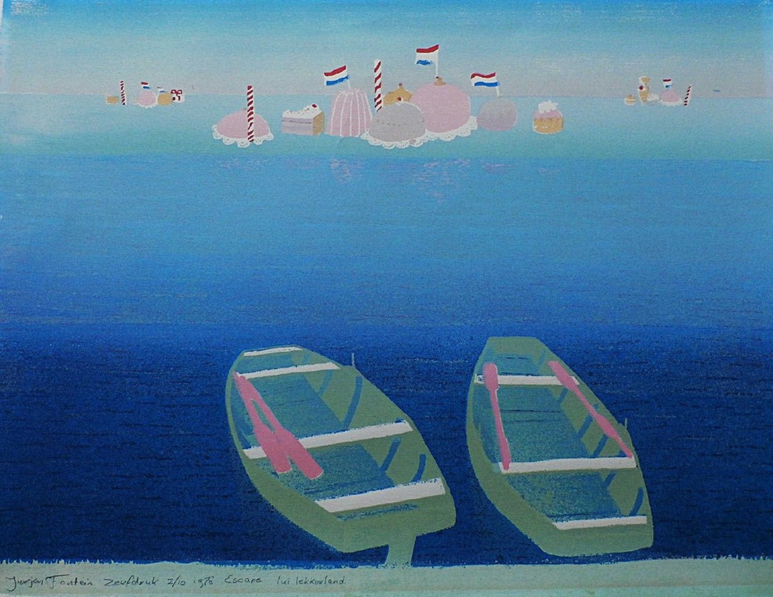 Zeefdruk van Jurjen Fontein. Titel: Escape Luilekkerland. Nummer: 2/10. Jaar: 1978 Afmetingen werk: h50 x b65 cm. Handgesigneerd rechts onder.