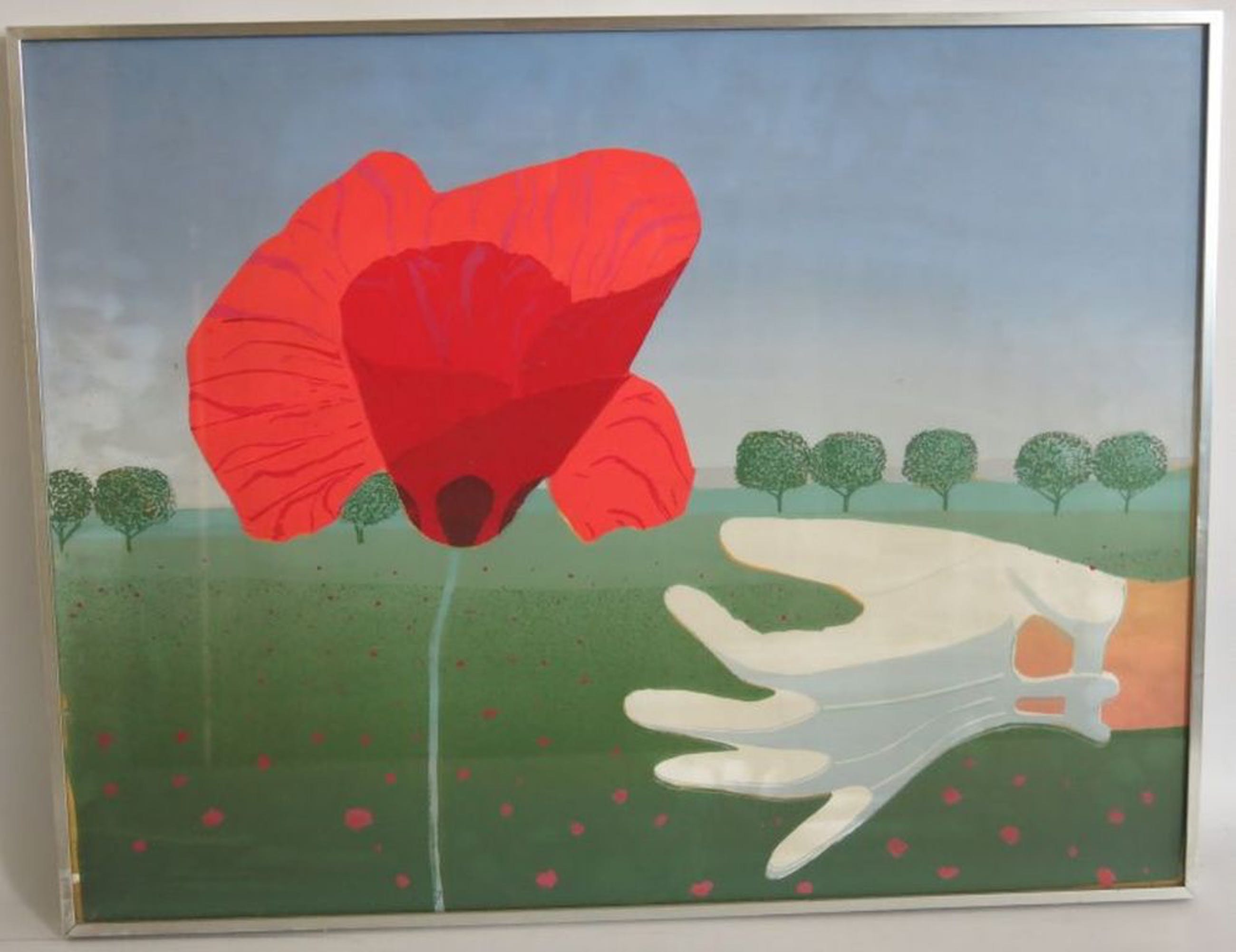 Jurjen Fontein, Zeefdruk met een klaproos die door een hand met witte handschoen wordt geplukt
