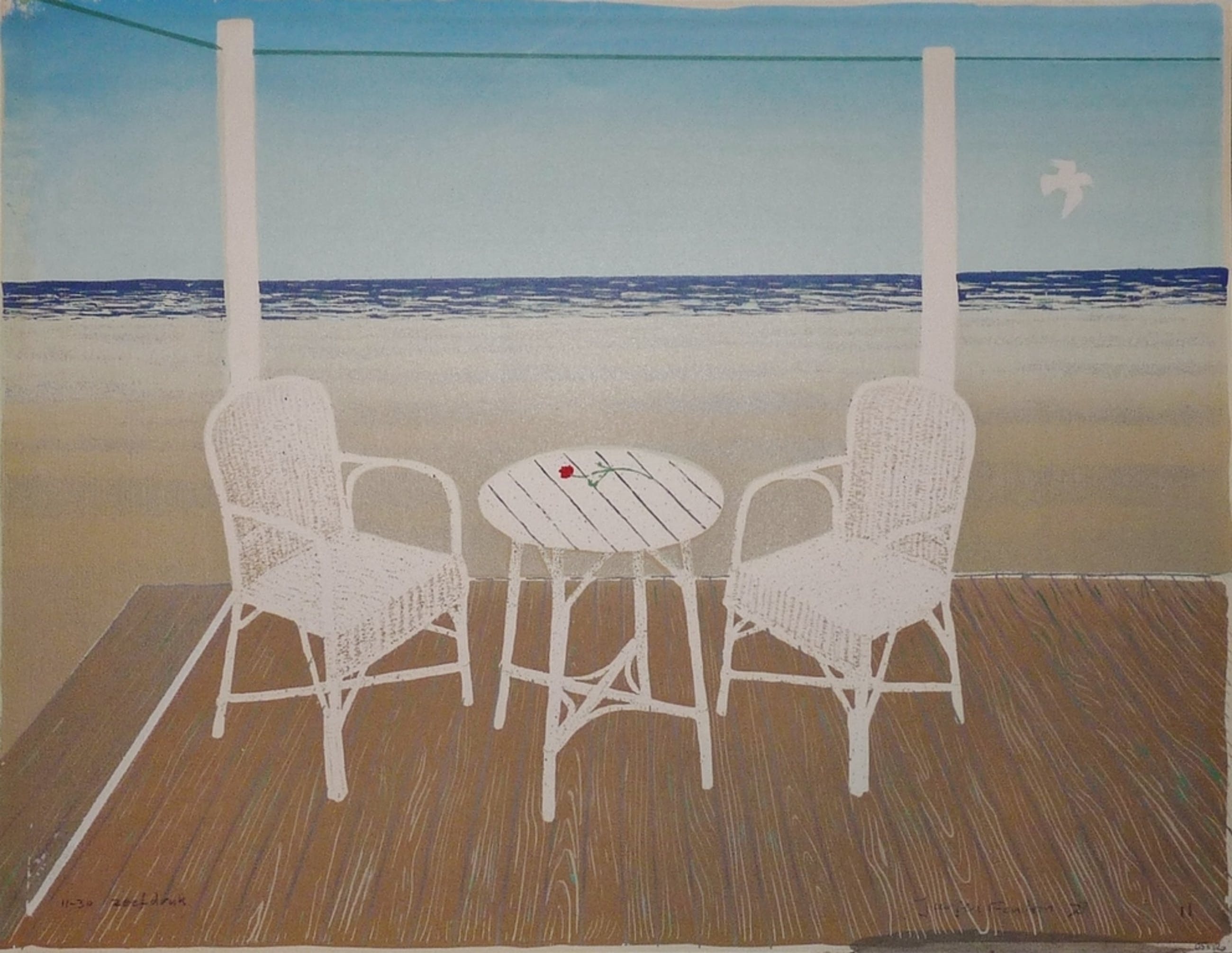 *Zeefdruk op zeer stevig papier / karton van 2 stoelen met roos op tafel en uitzicht op zee door de Nederlandse kunstenaar Jurjen Fontein in een beperkte oplage gedrukt van 30 ex. .