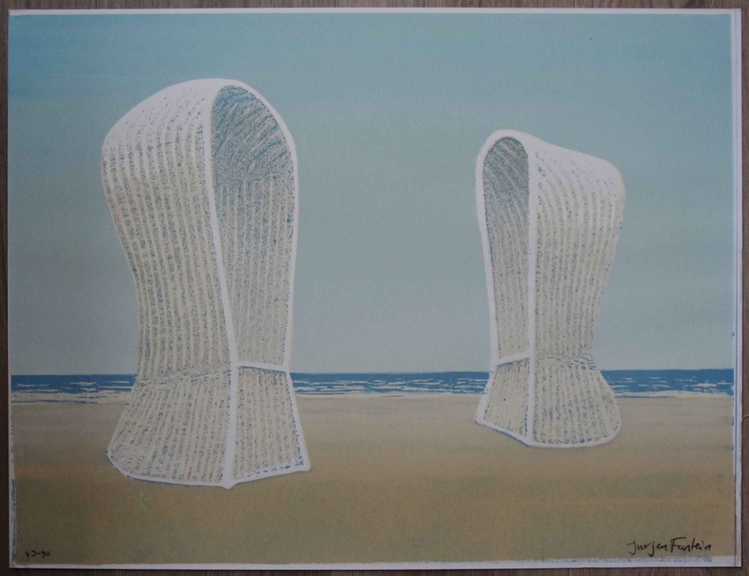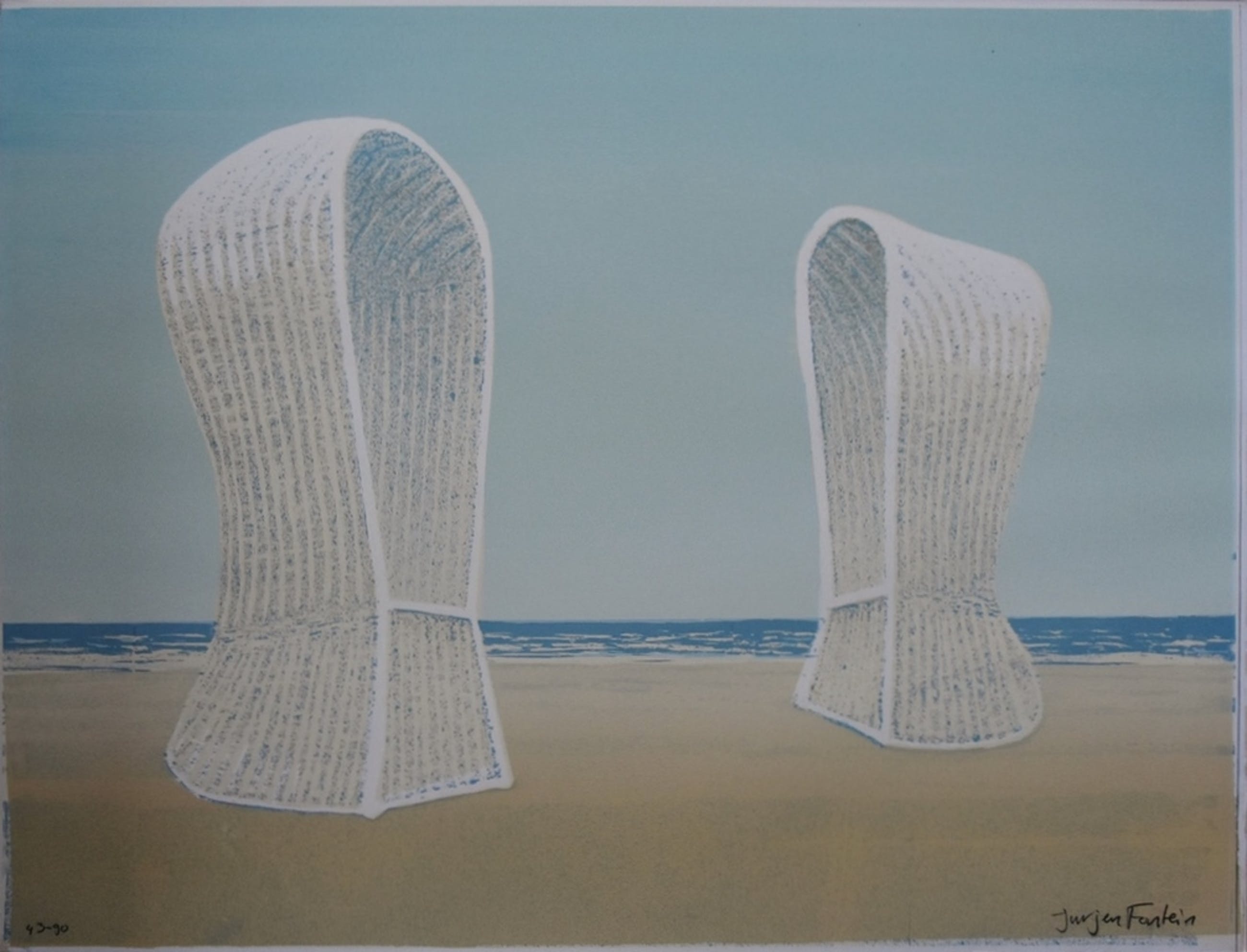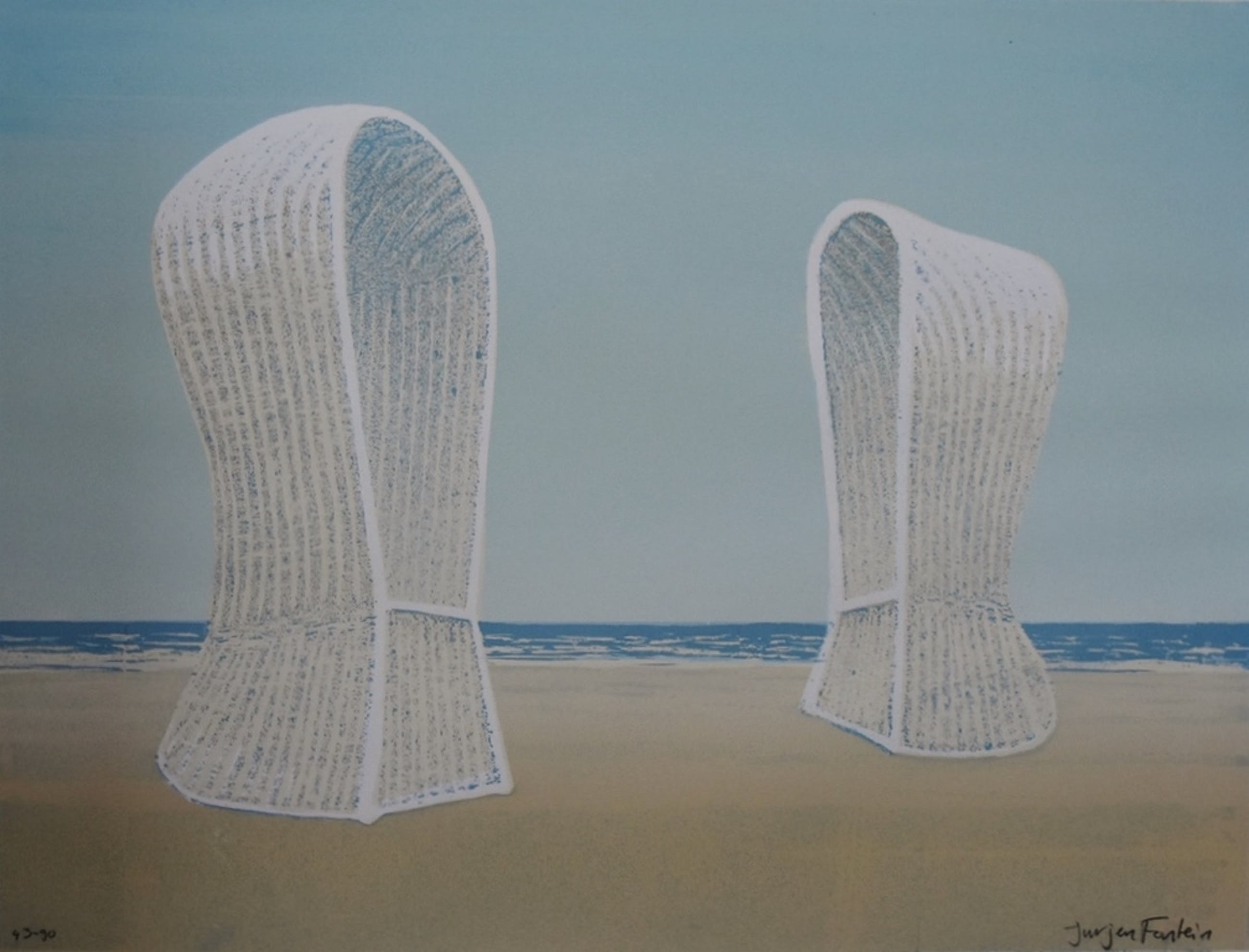 *Zeefdruk op zeer stevig papier / karton van 2 strandstoelen en uitzicht op zee door de Nederlandse kunstenaar Jurjen Fontein in een oplage gedrukt van 90 ex. .