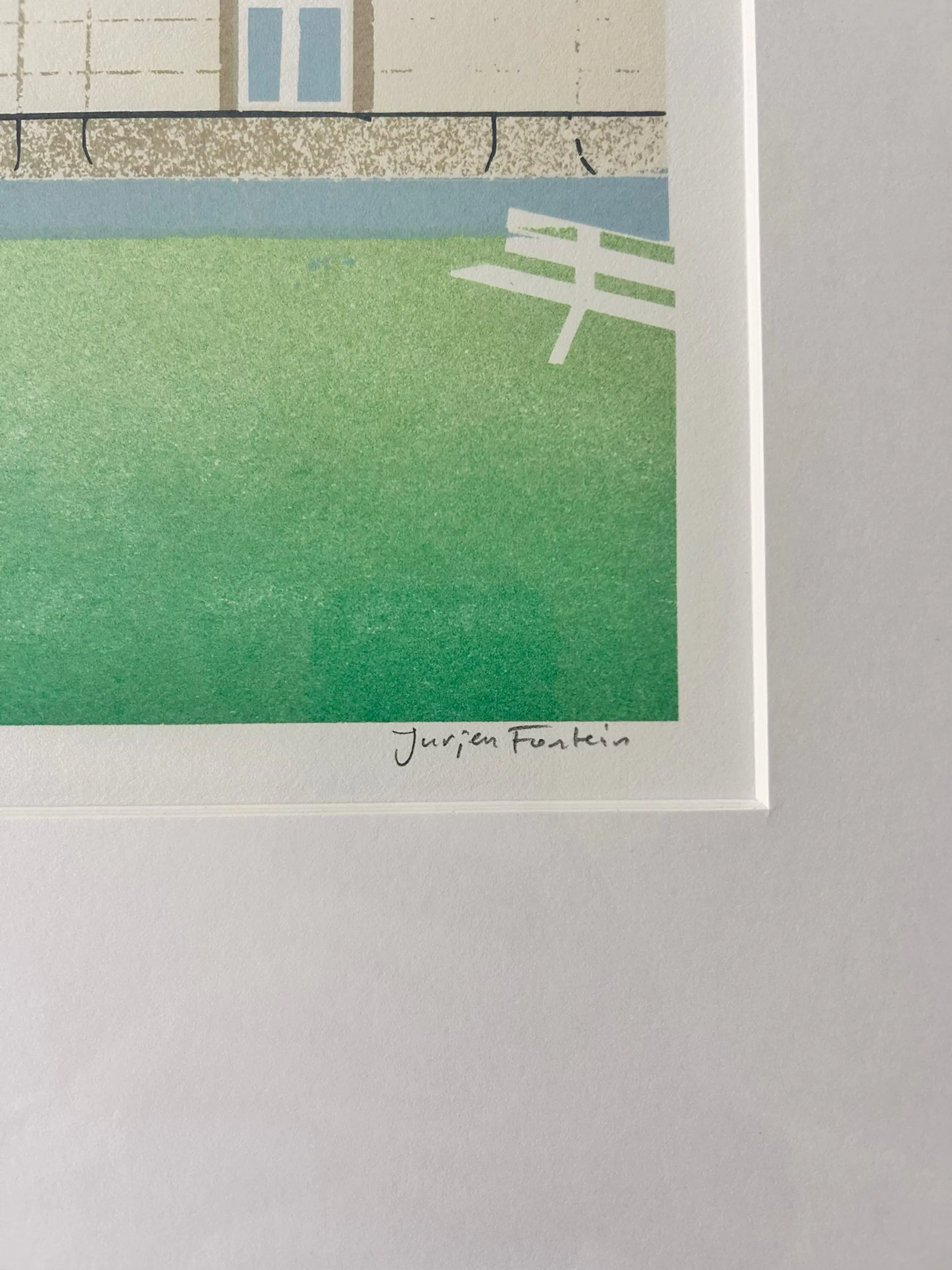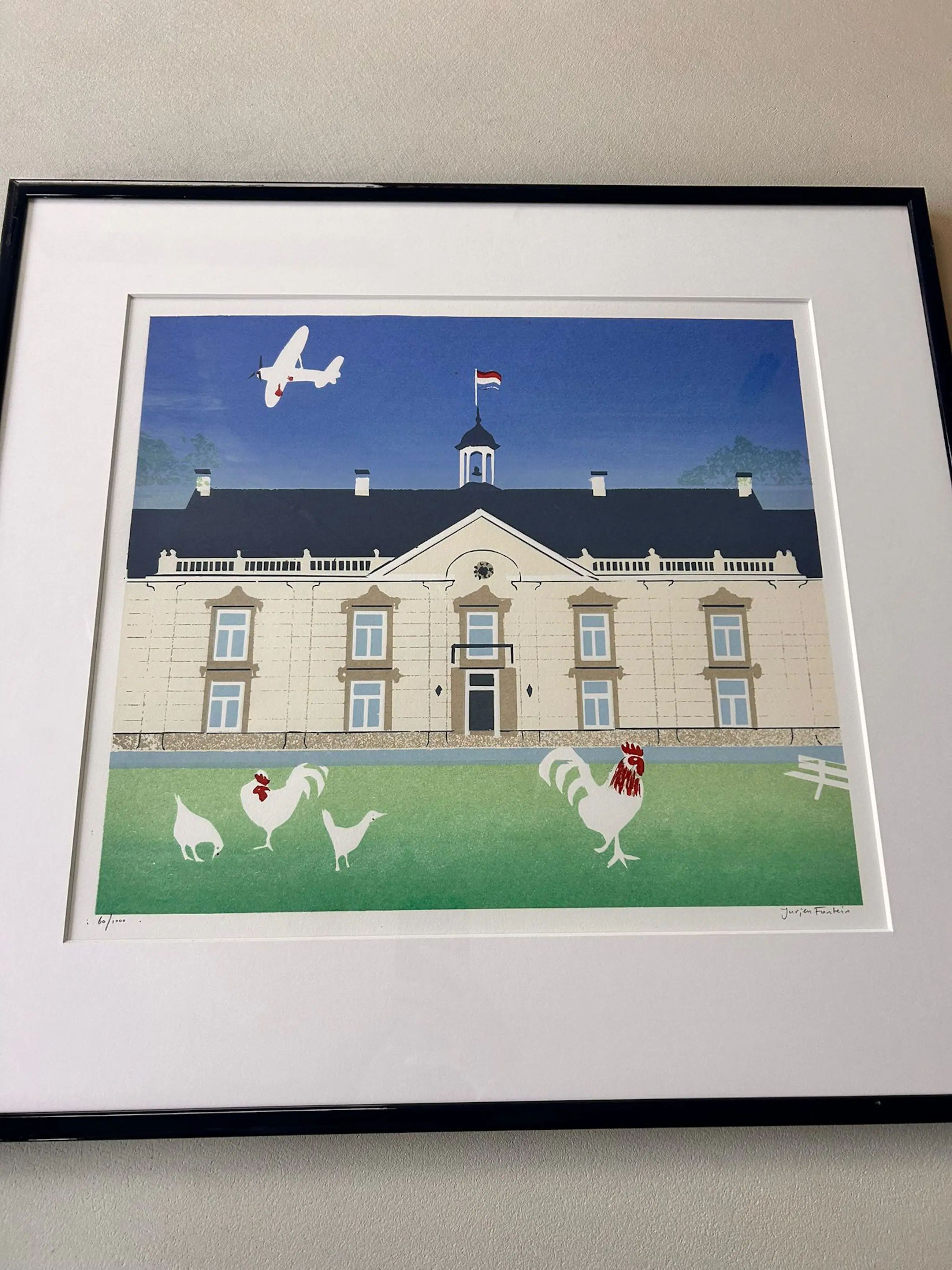 Mooie zeefdruk van Jurjen Fontein. Ingelijst in een donkerblauwe lijst. Hier zitten een paar mini beschadigingen op maar die vallen niet op.