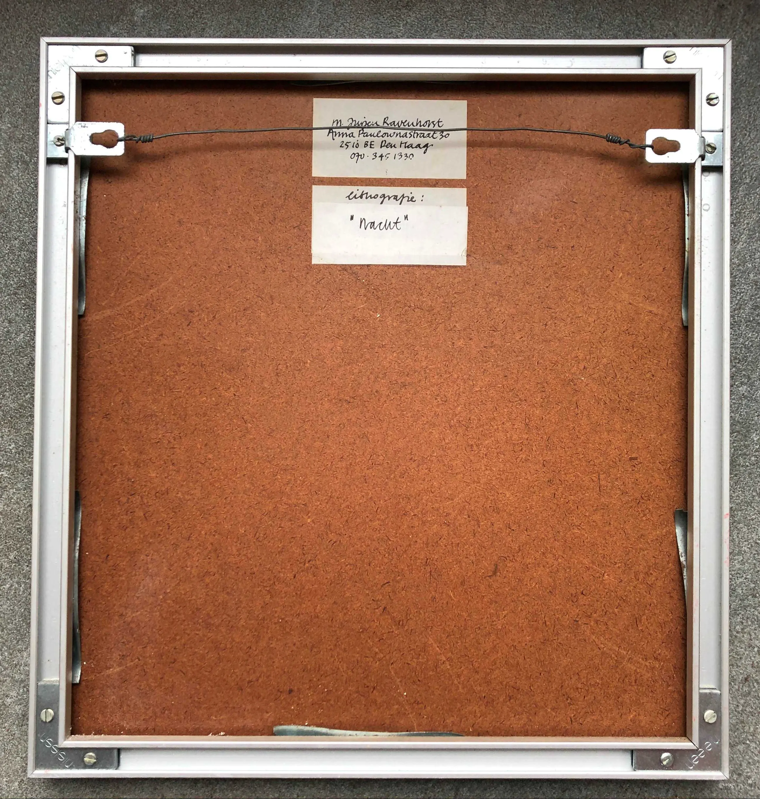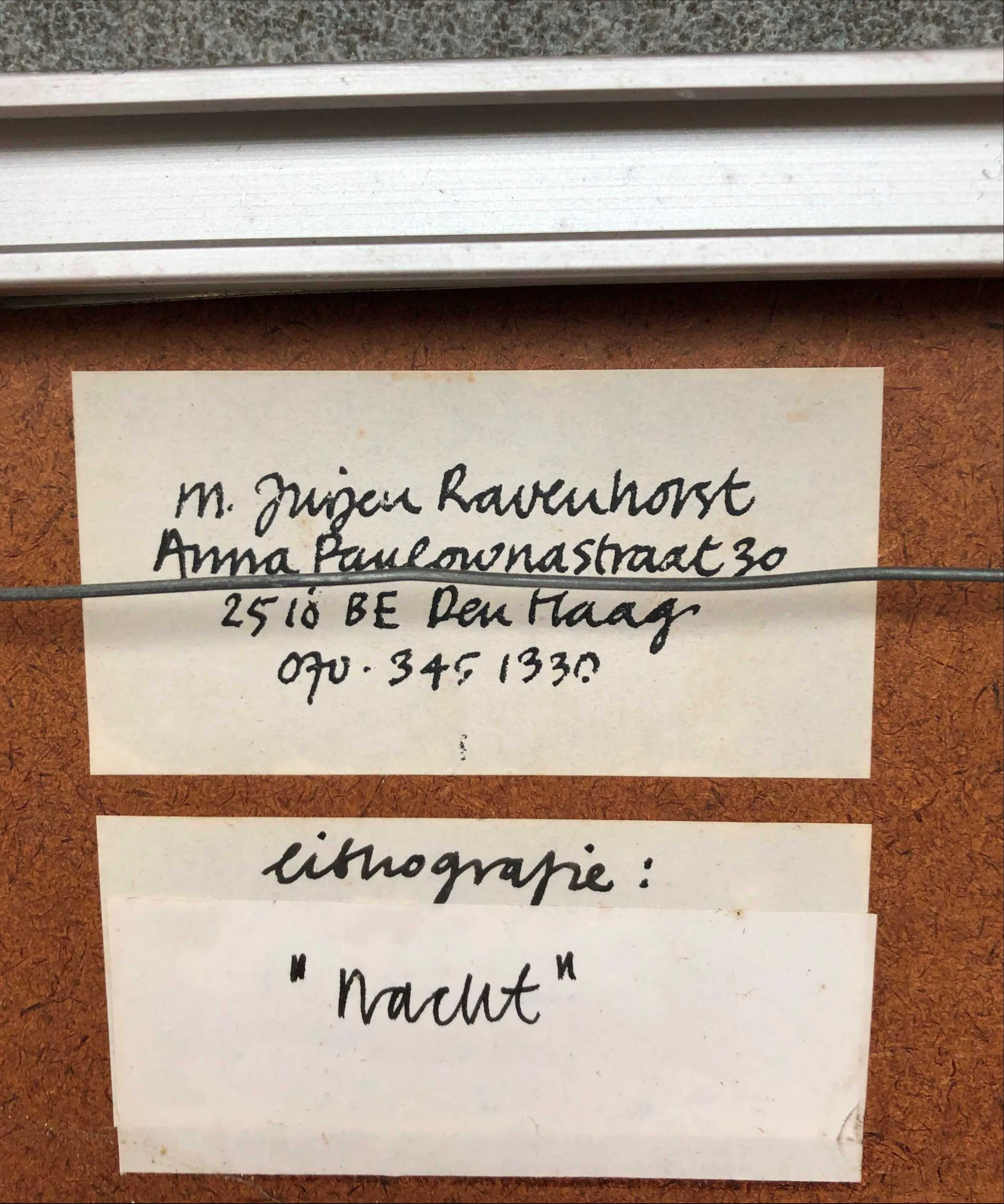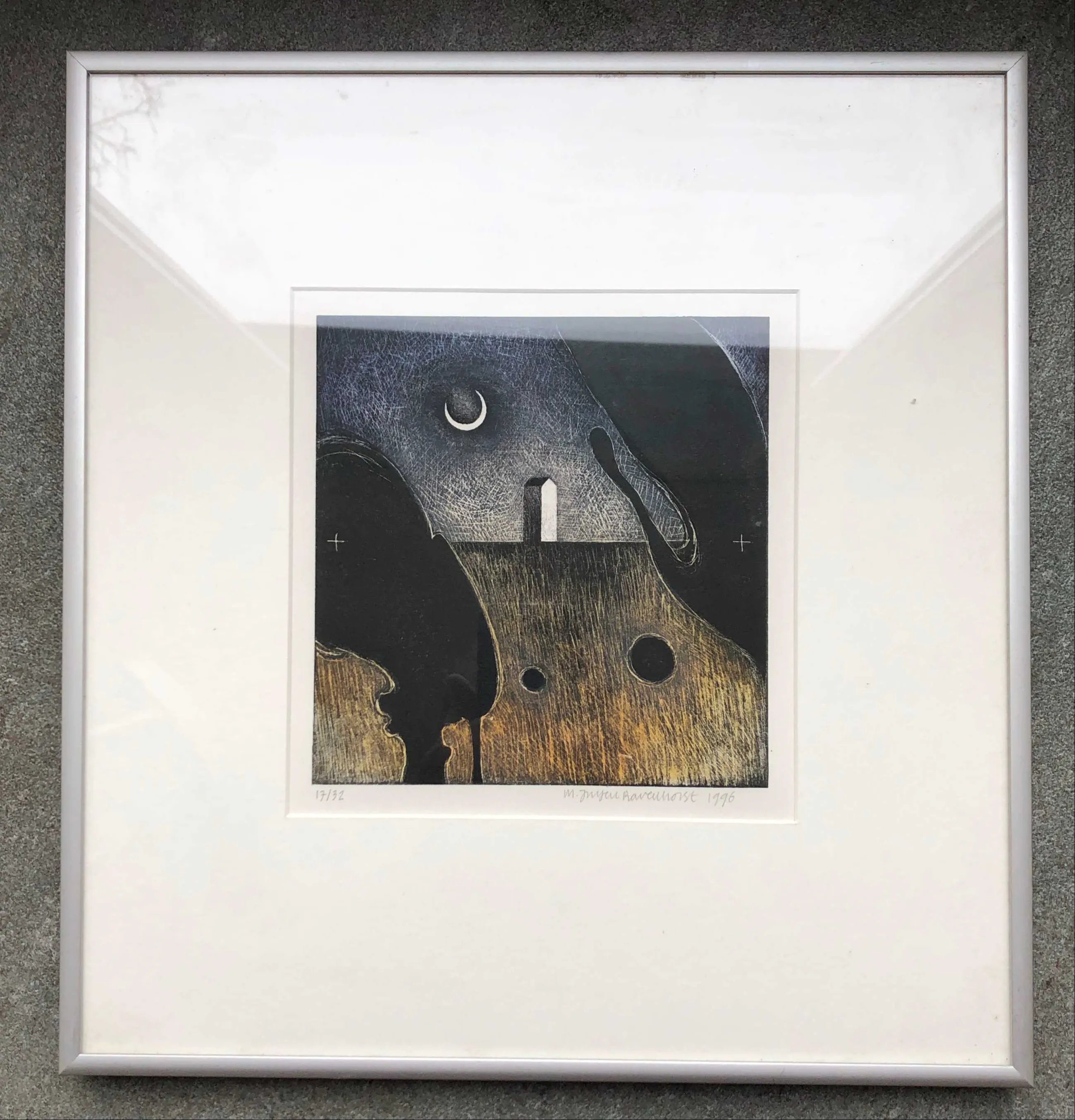 Kleurenlitho nummer 17/32 Expressionistisch landschap in de nacht. Een sikkelmaan overschijnt een huis aan de horizon. Op de voorgrond wuivende bomen en gewassen. De drager van papier is nog helder wit. Passepartout niet vergeeld. Solide matte aluminium lijst met ophangsysteem en glas. Een representatief werk van de bekende kunstenaar-lithograaf