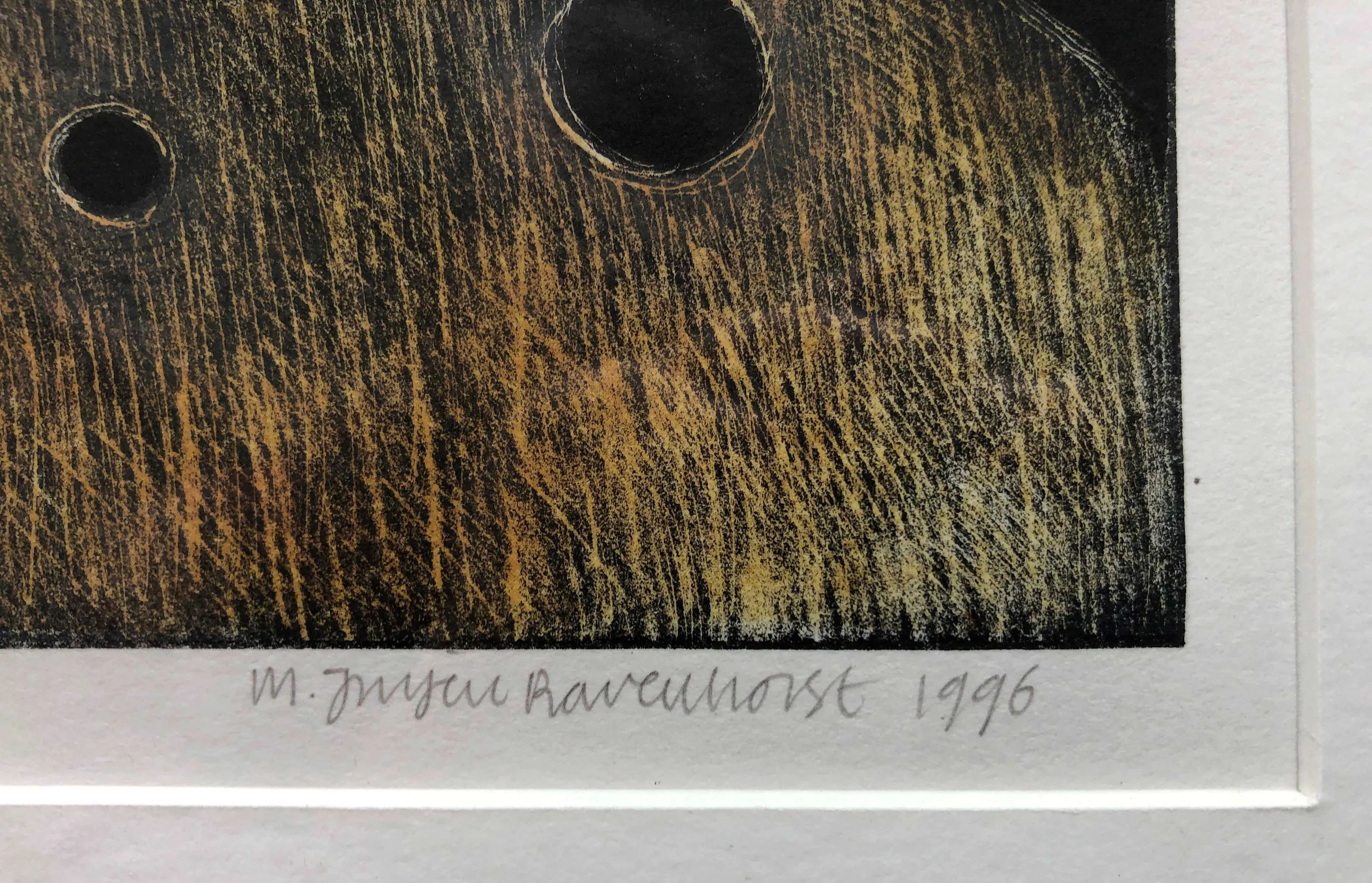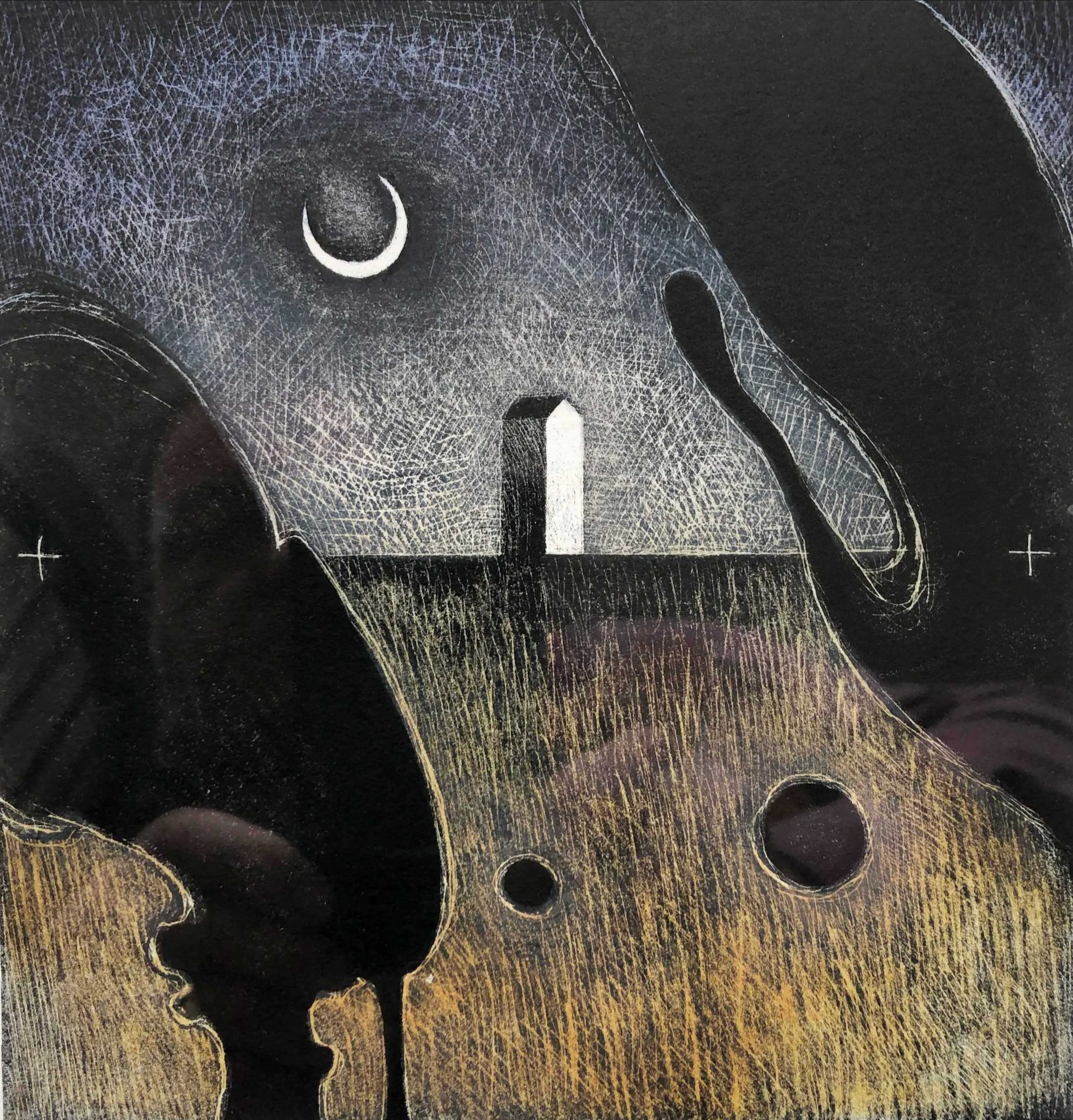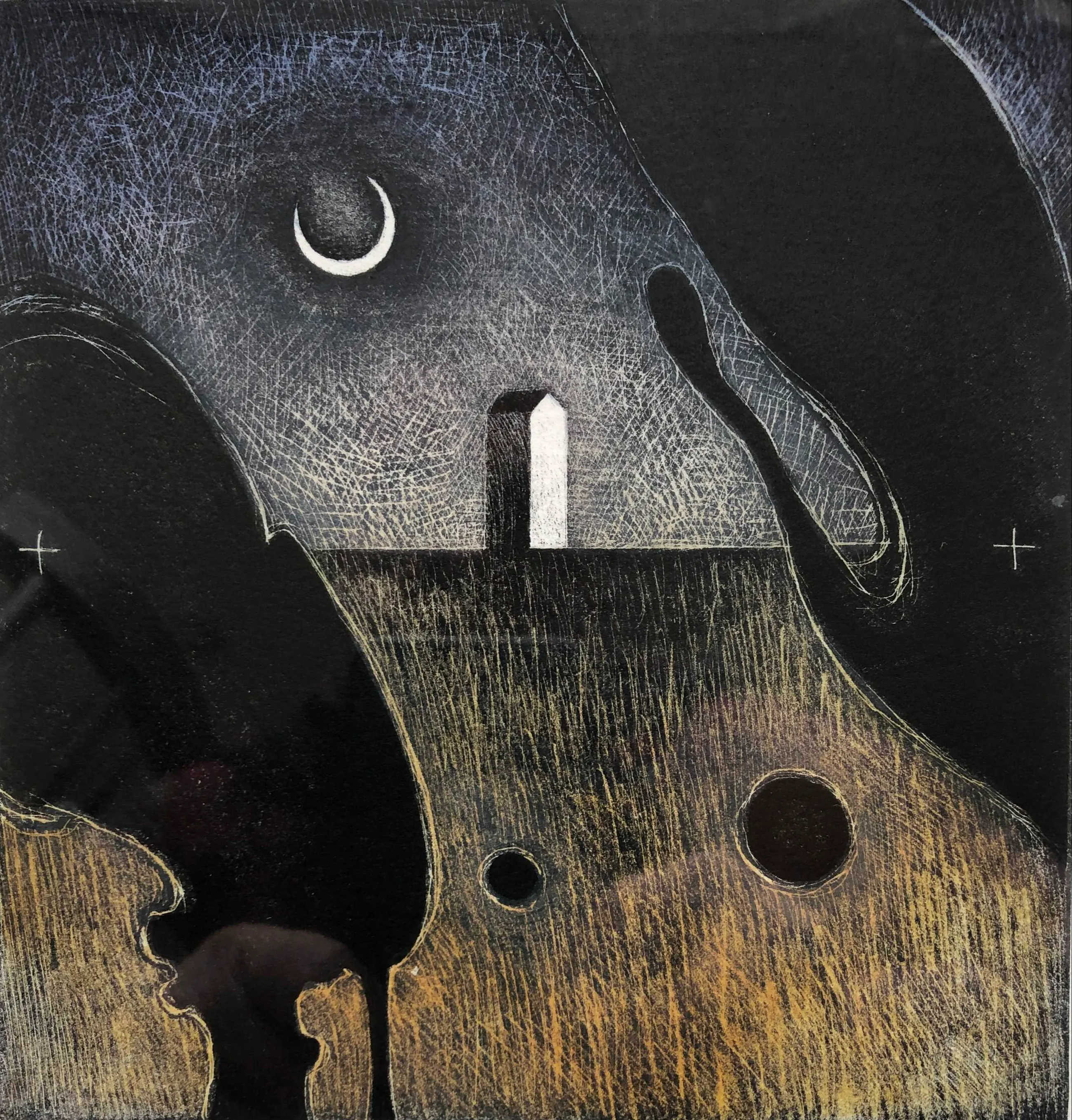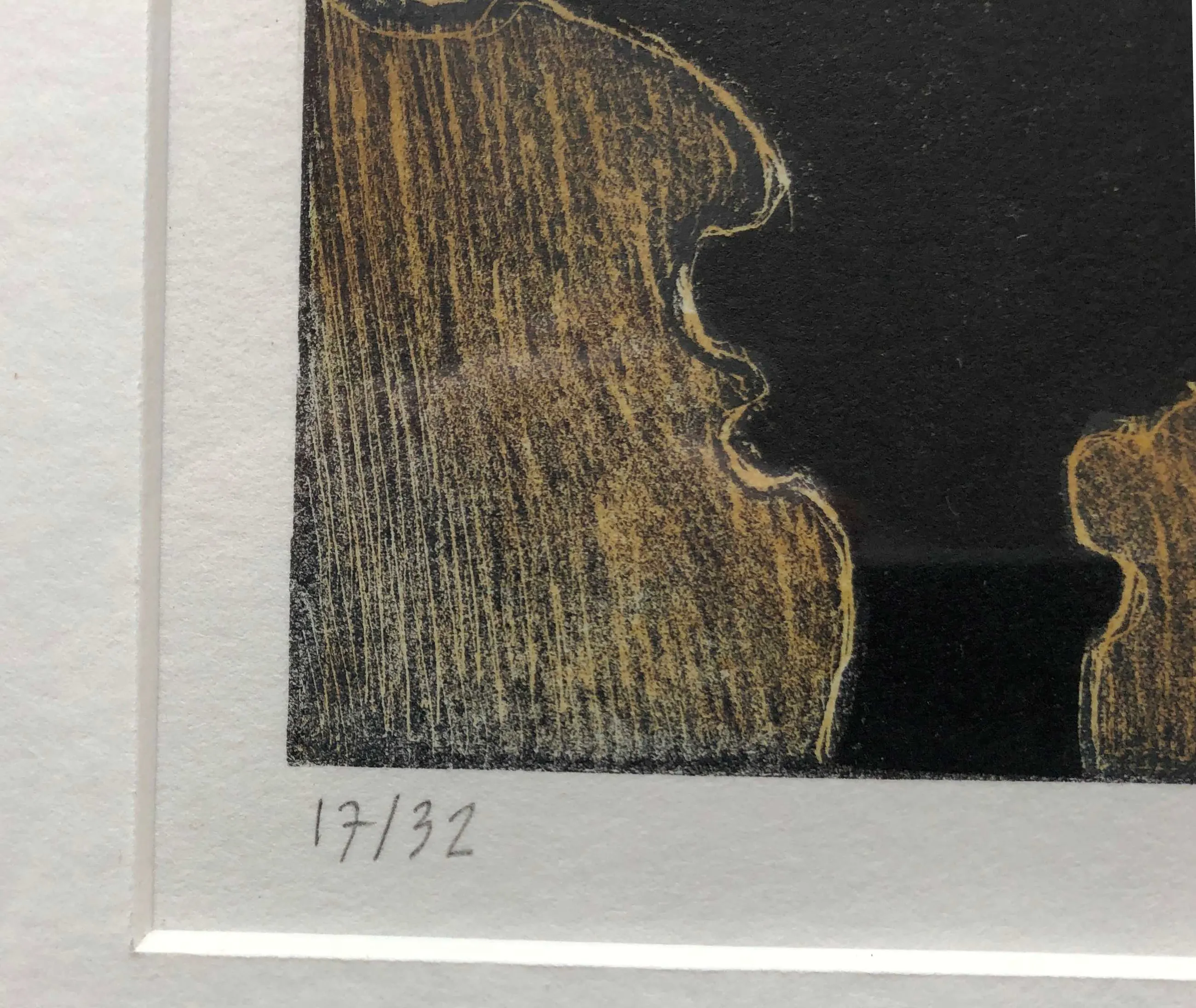 Kleurenlitho nummer 17/32 Expressionistisch landschap in de nacht. Een sikkelmaan overschijnt een huis aan de horizon. Op de voorgrond wuivende bomen en gewassen. De drager van papier is nog helder wit. Passepartout niet vergeeld. Solide matte aluminium lijst met ophangsysteem en glas. Een representatief werk van de bekende kunstenaar-lithograaf