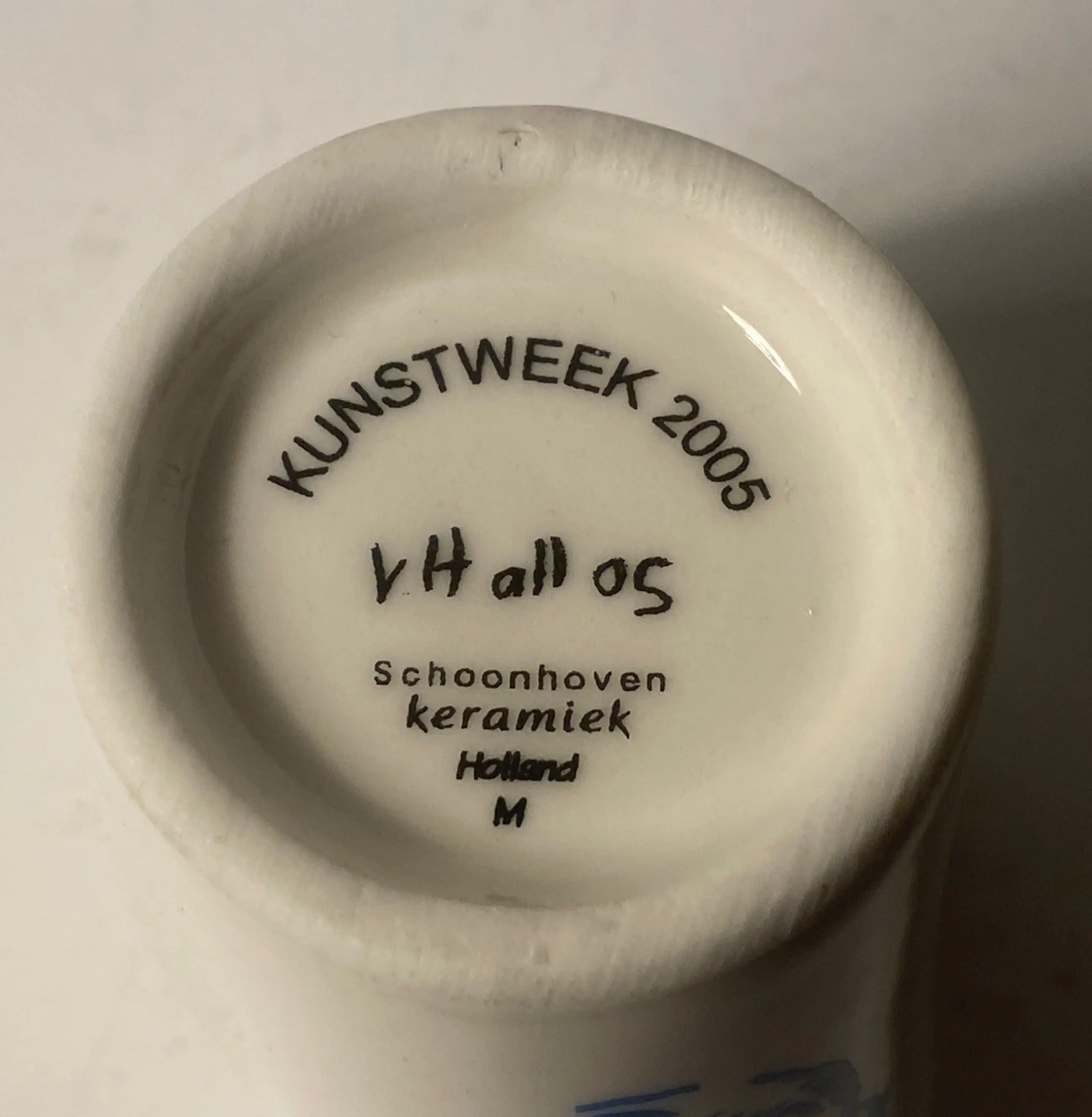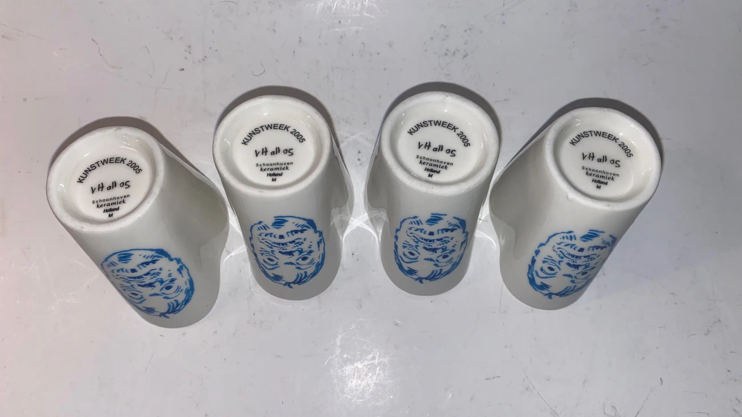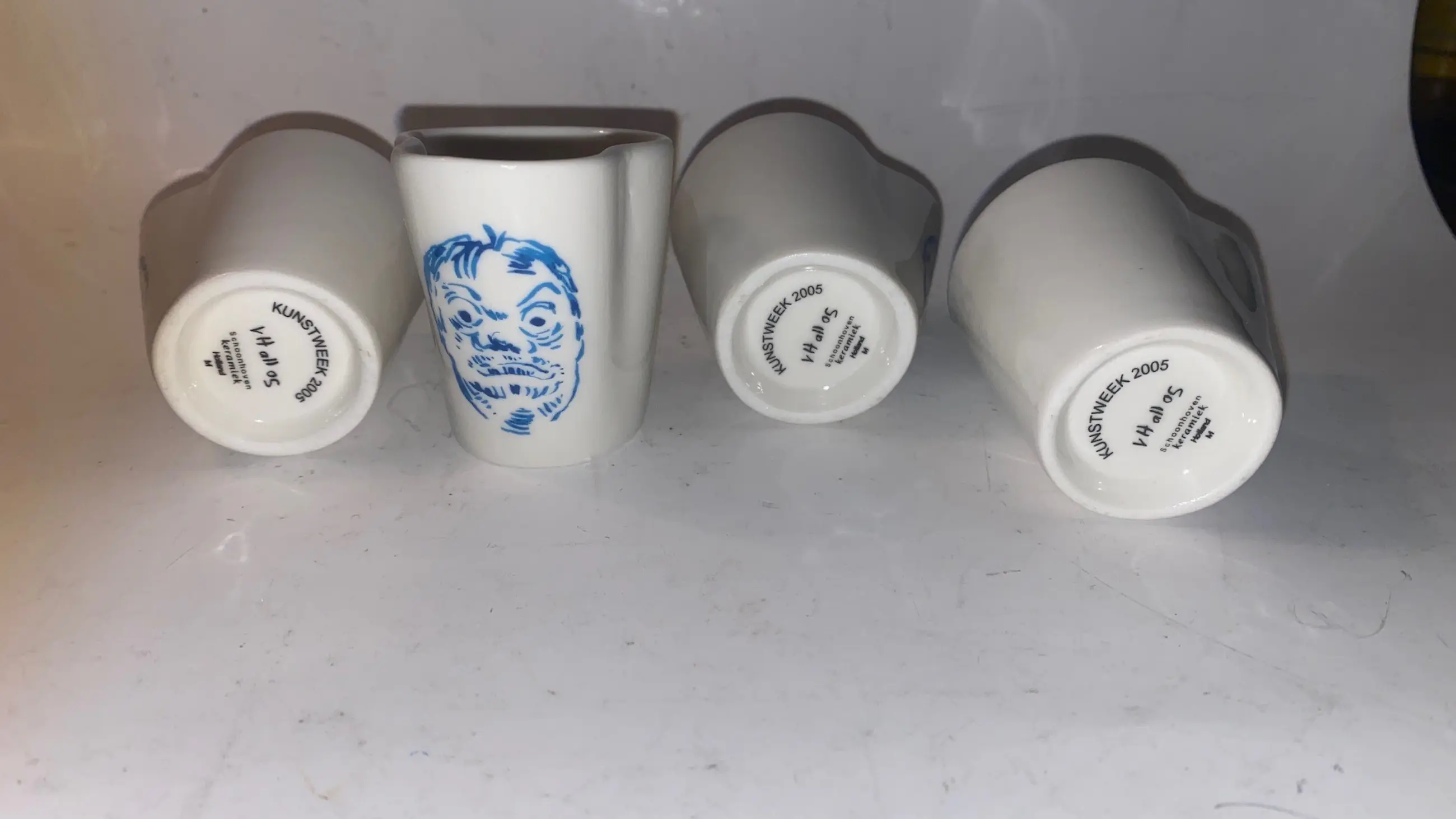 Een zeldzame set van vier keramische eierdoppen, ontworpen door Jurriaan van Hal in het kader van de Kunstweek 2005 en geproduceerd door de gerenommeerde Plateelfabriek Schoonhoven. Elk dopje toont een expressief gezicht in kobaltblauw — grotesk, humoristisch en onmiskenbaar Van Hal. De decoratie is vermoedelijk via transfertechniek aangebracht, passend bij de beperkte oplage van slechts 400 exemplaren.