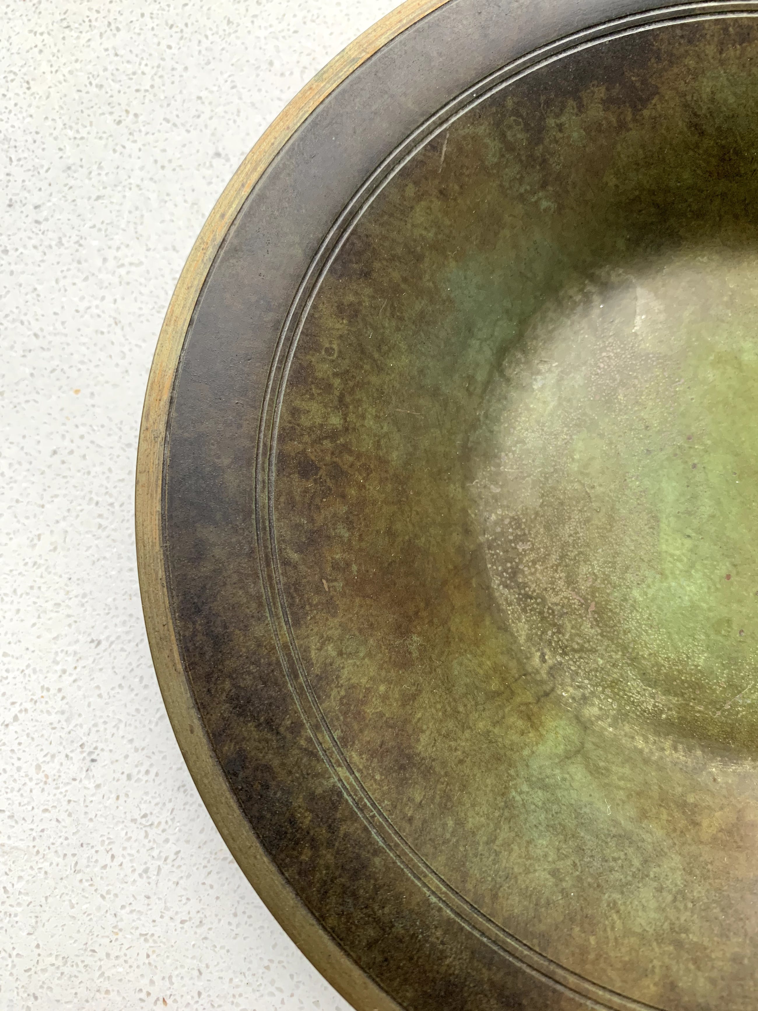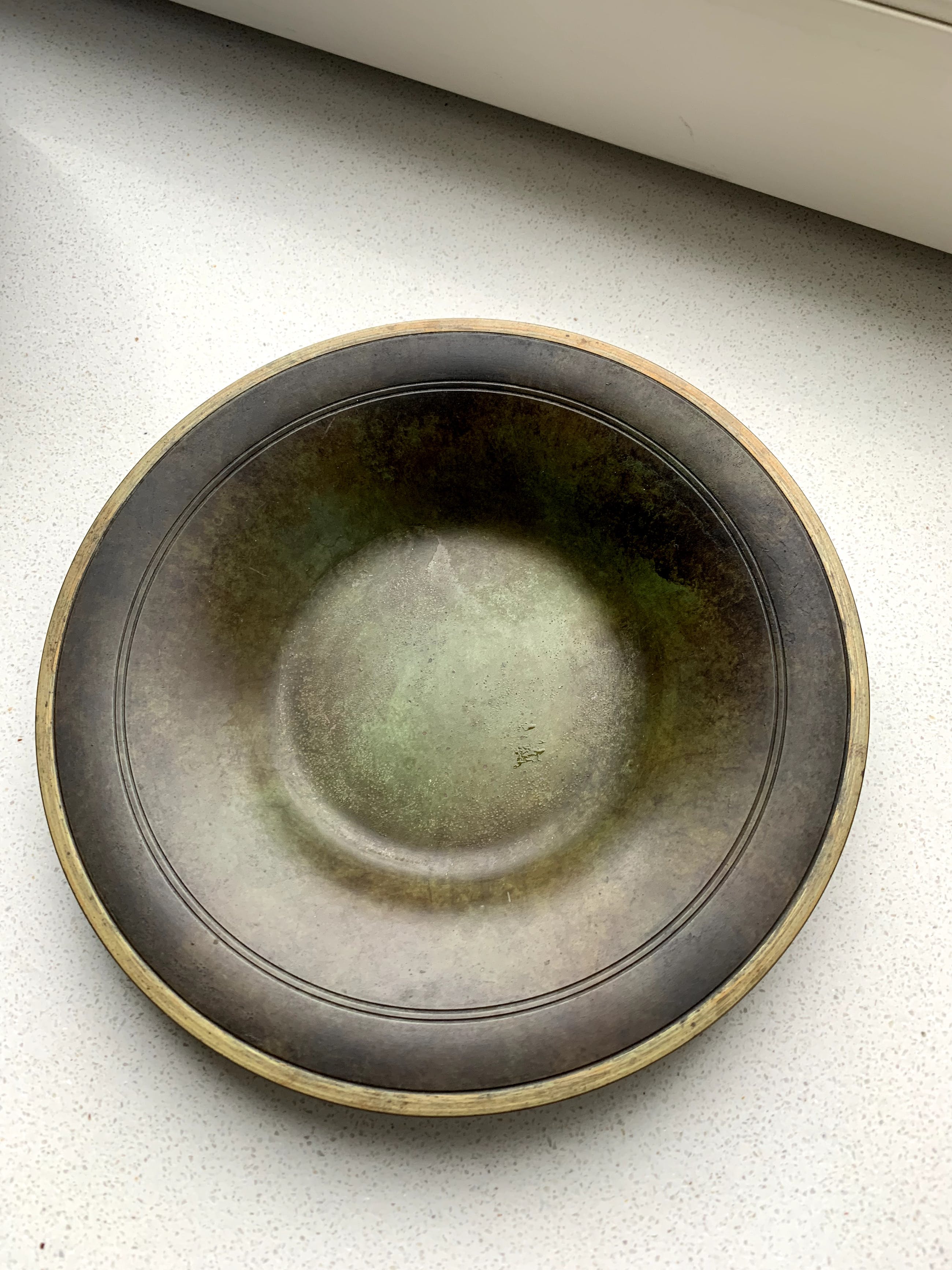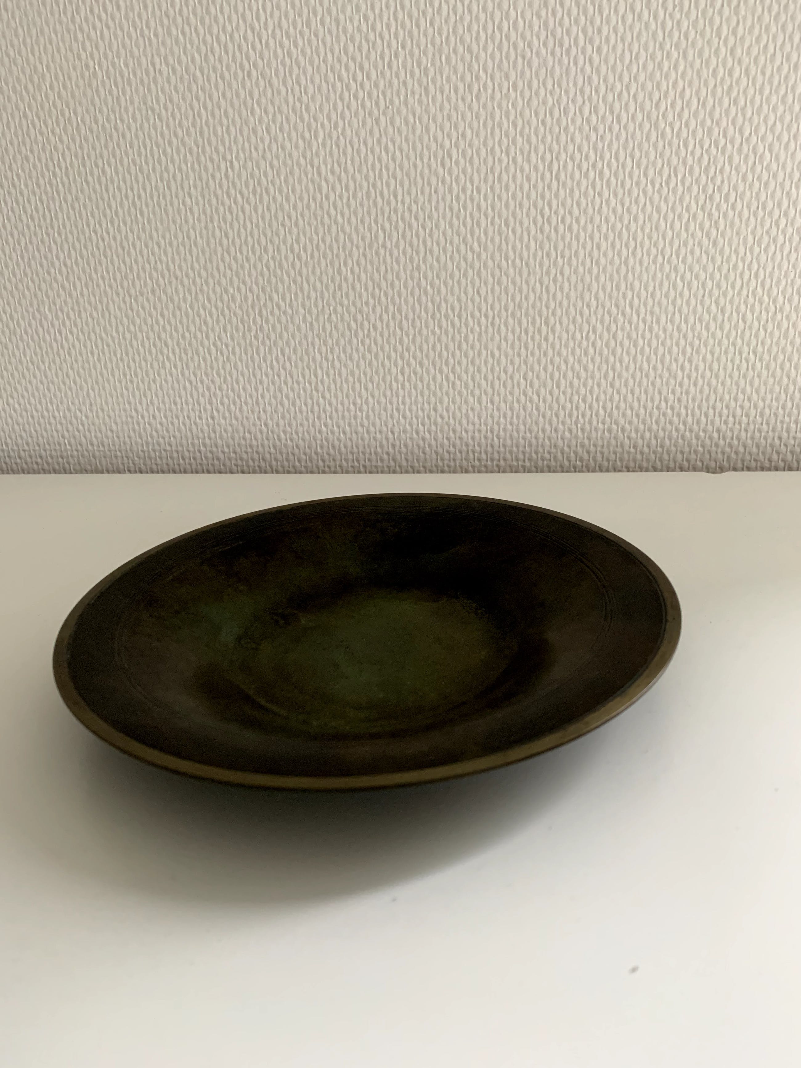 Schotel gemaakt door Just Andersen (1884 - 1943), van het door hem ontwikkelde Disko metaal. Aanvankelijk werkte hij vooral met brons, zilver en tin. Diskometaal heeft het uiterlijk van brons met een prachtig groen patina. Het werk van Just Andersen wordt over de hele wereld verzameld en is te zien in diverse musea. Tijdens zijn leven was hij zeer succesvol en had diverse showrooms in grote steden, zowel in Europa als in de VS.