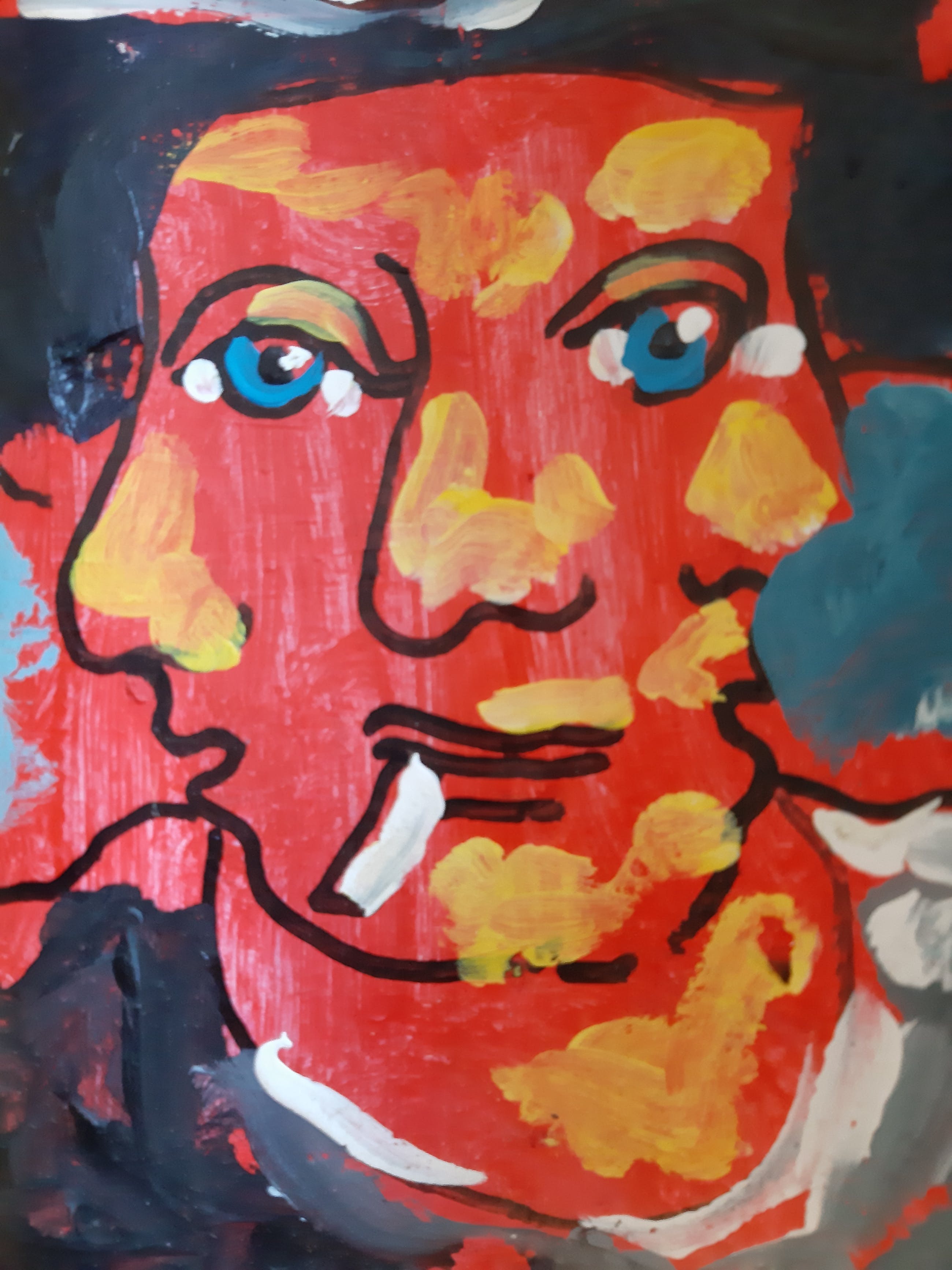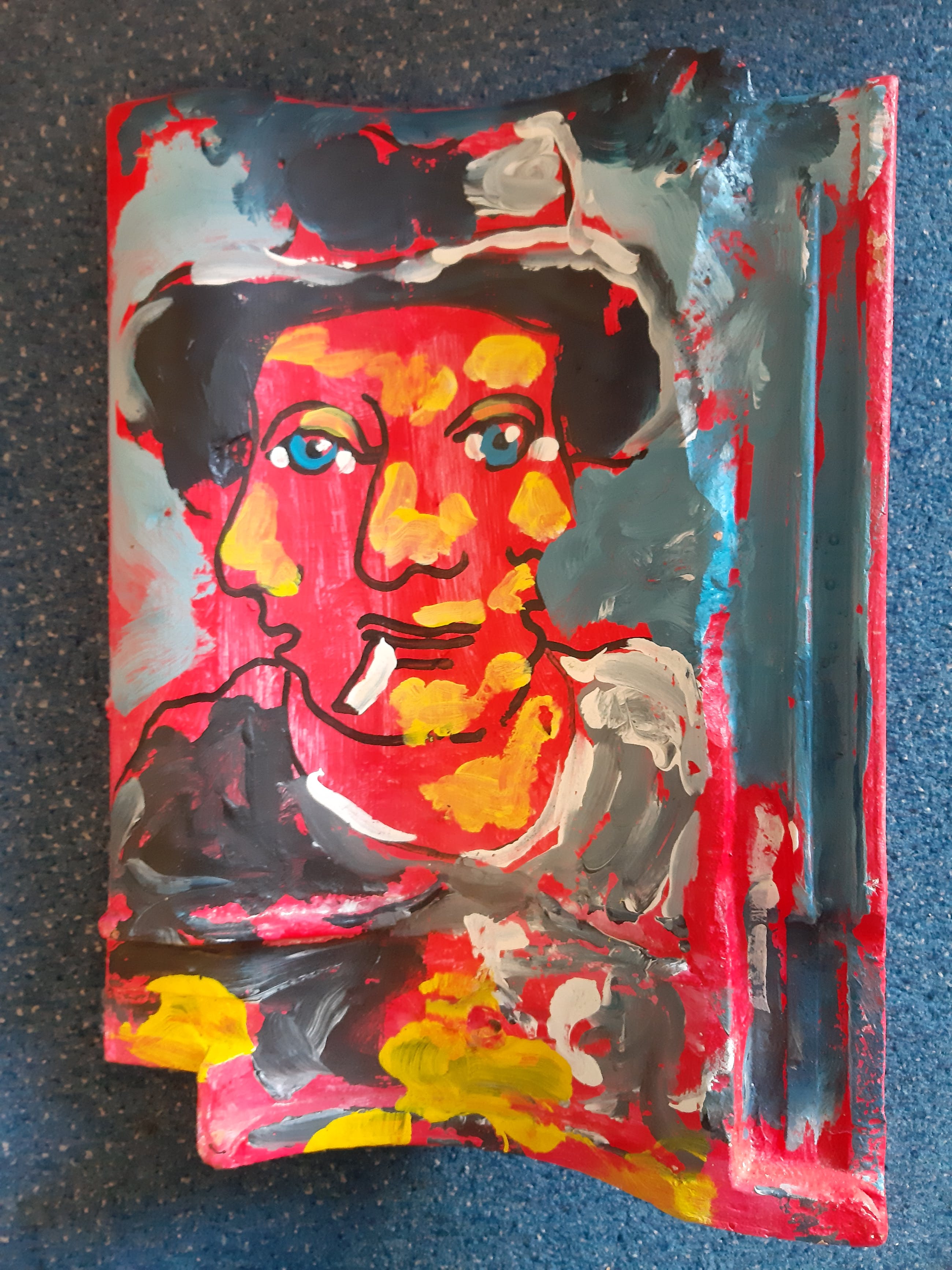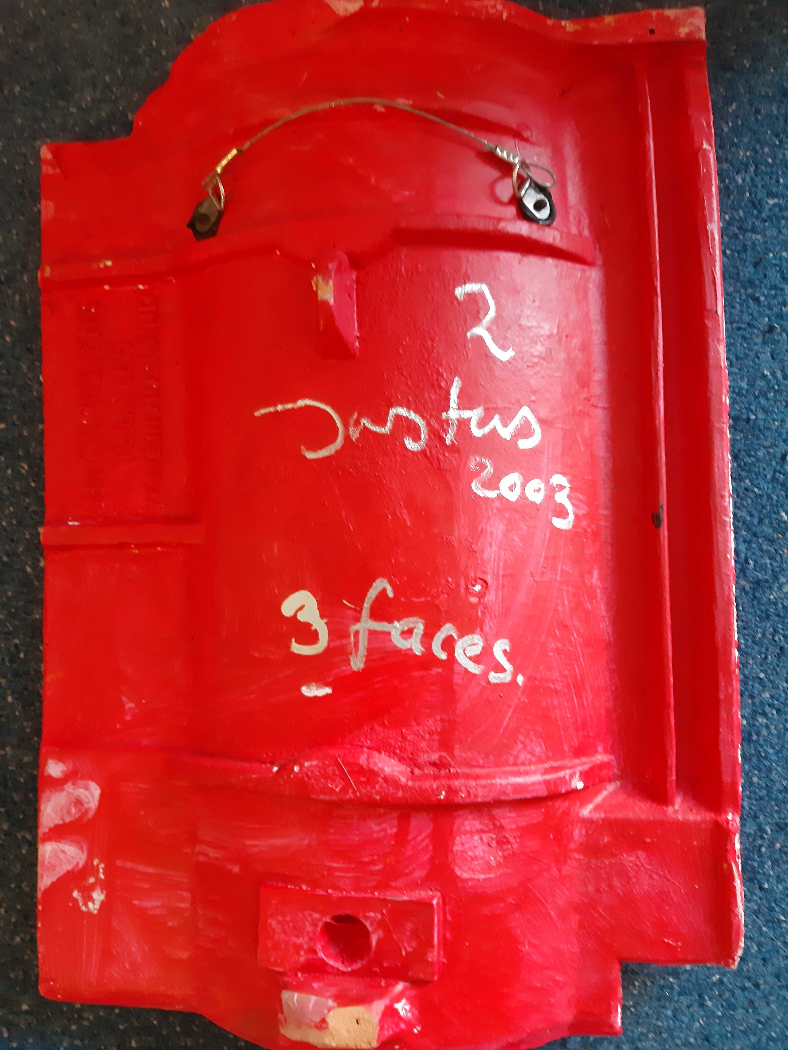 Uniek object van Justus Donker, een beschilderde dakpan; titel : 3 faces, zelfportret