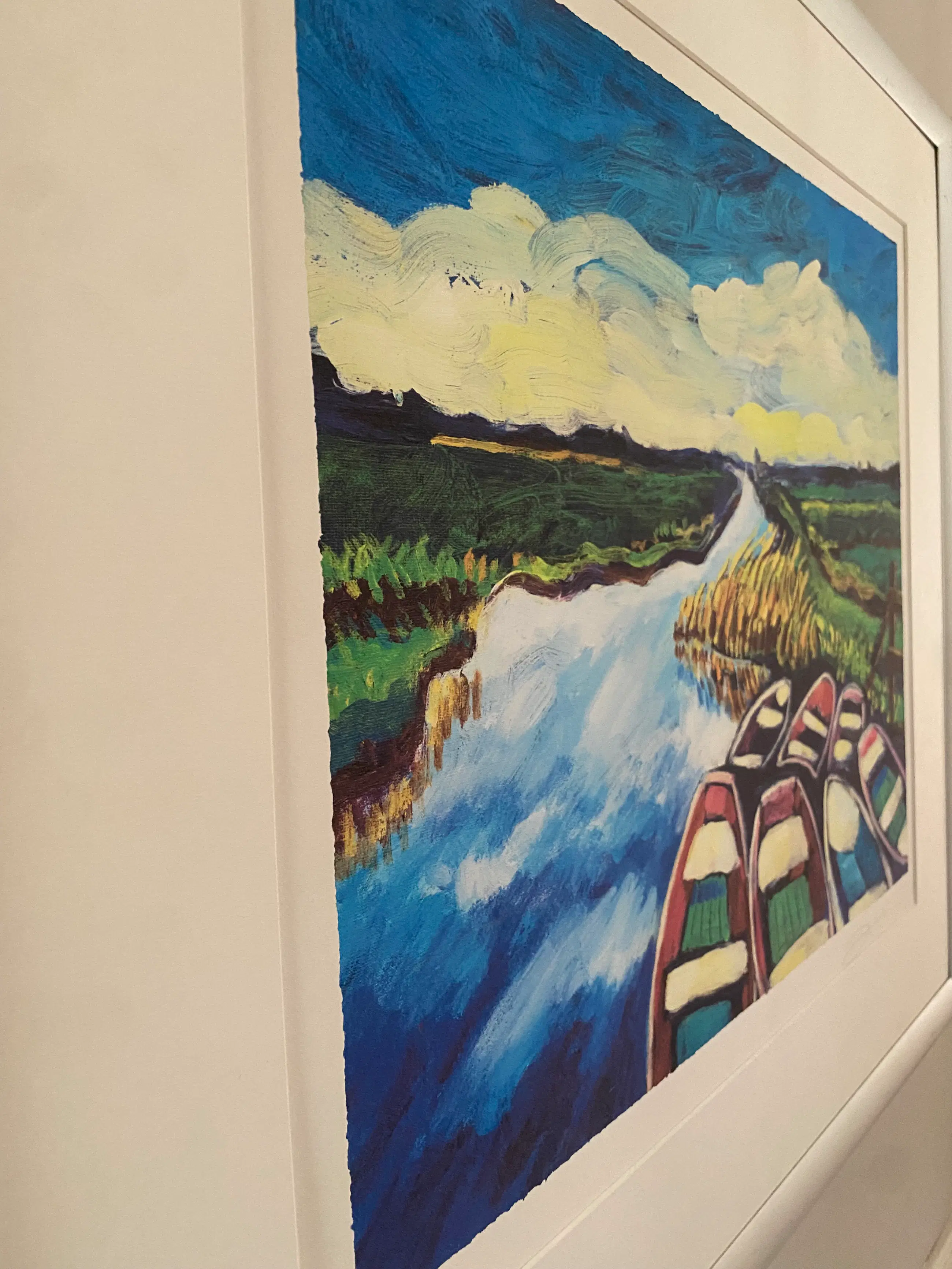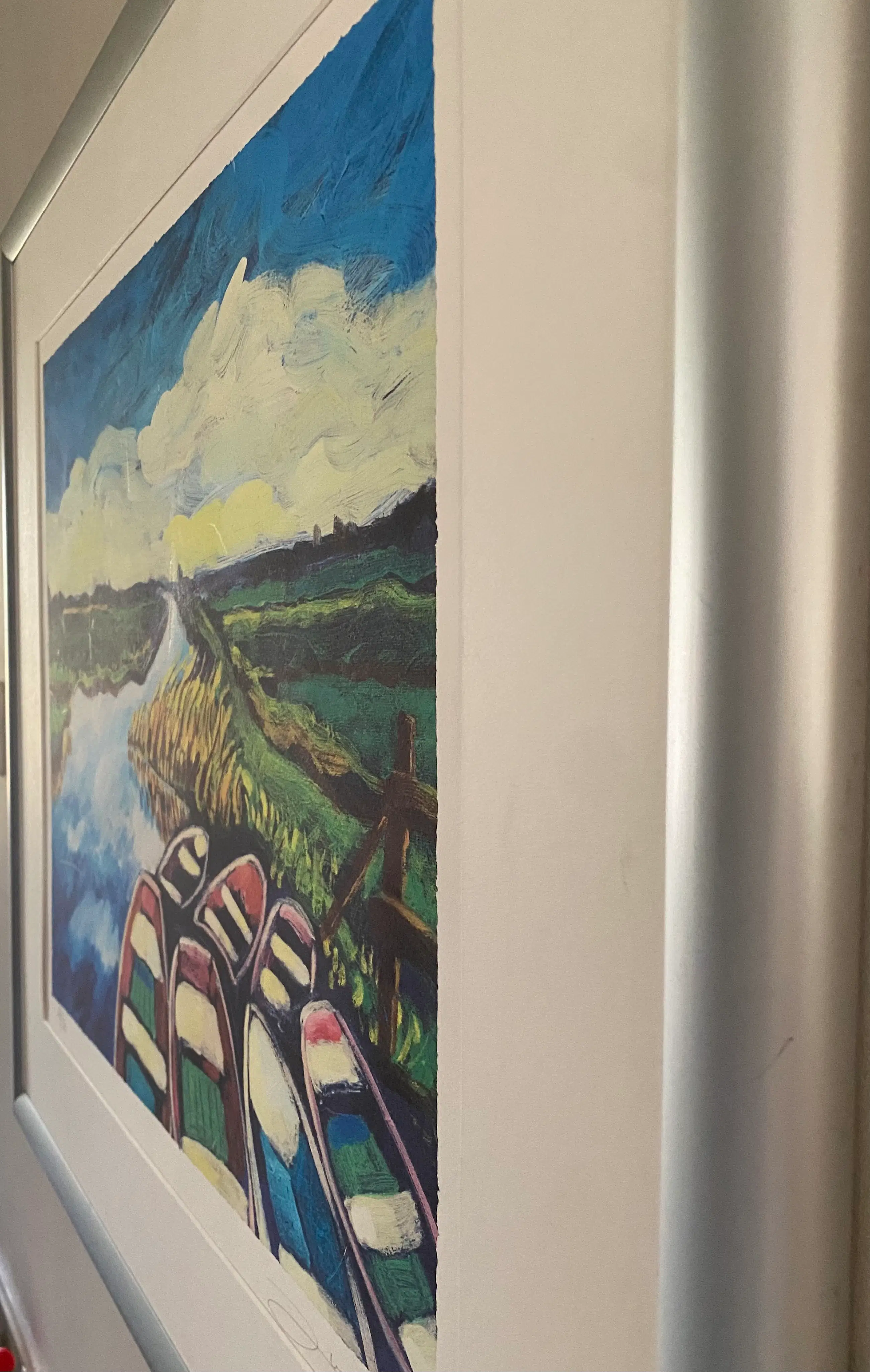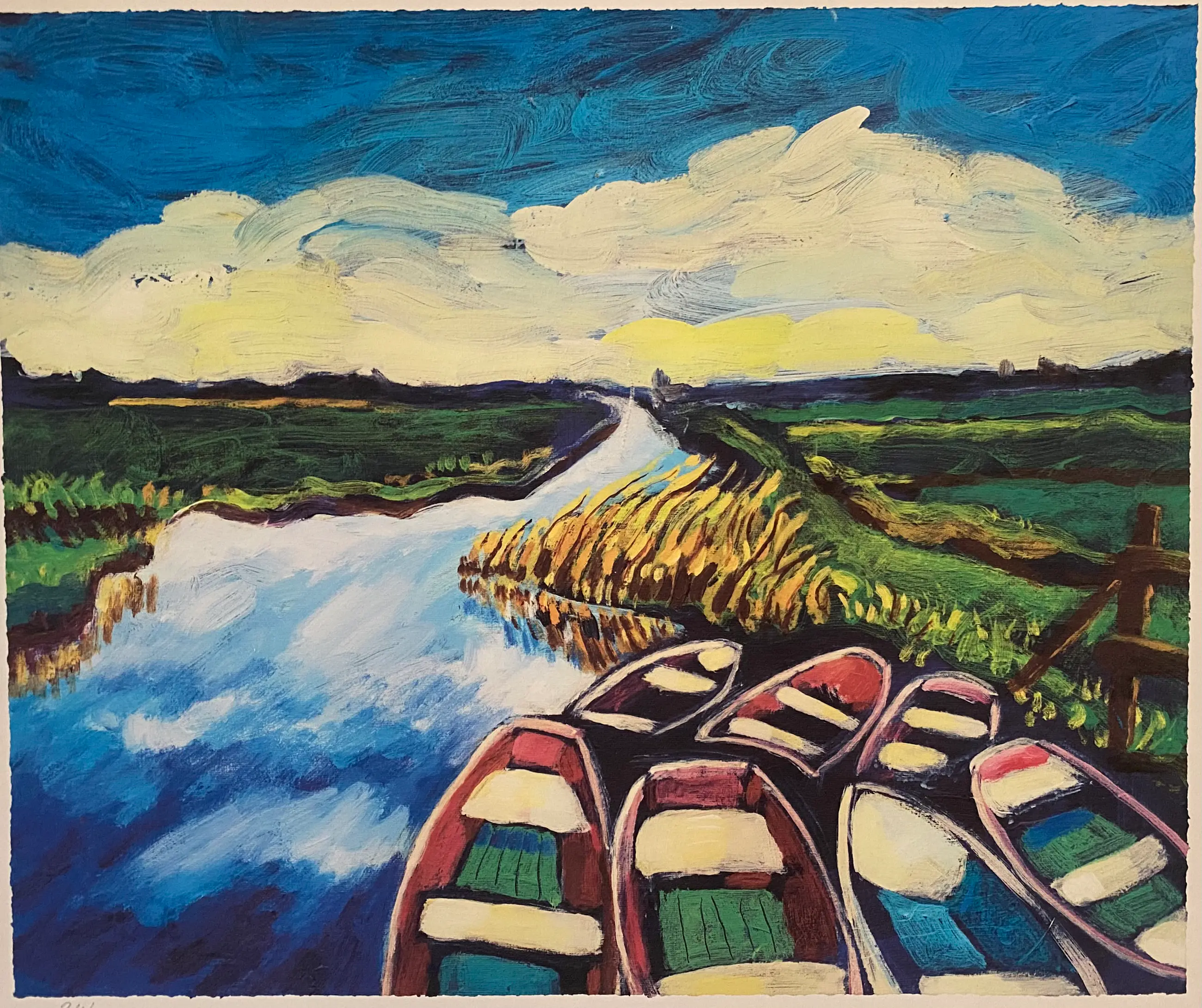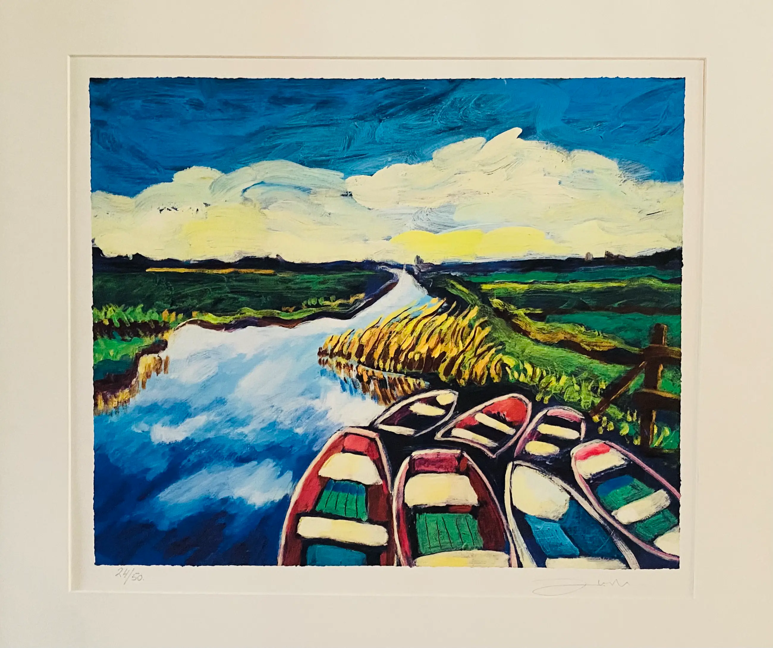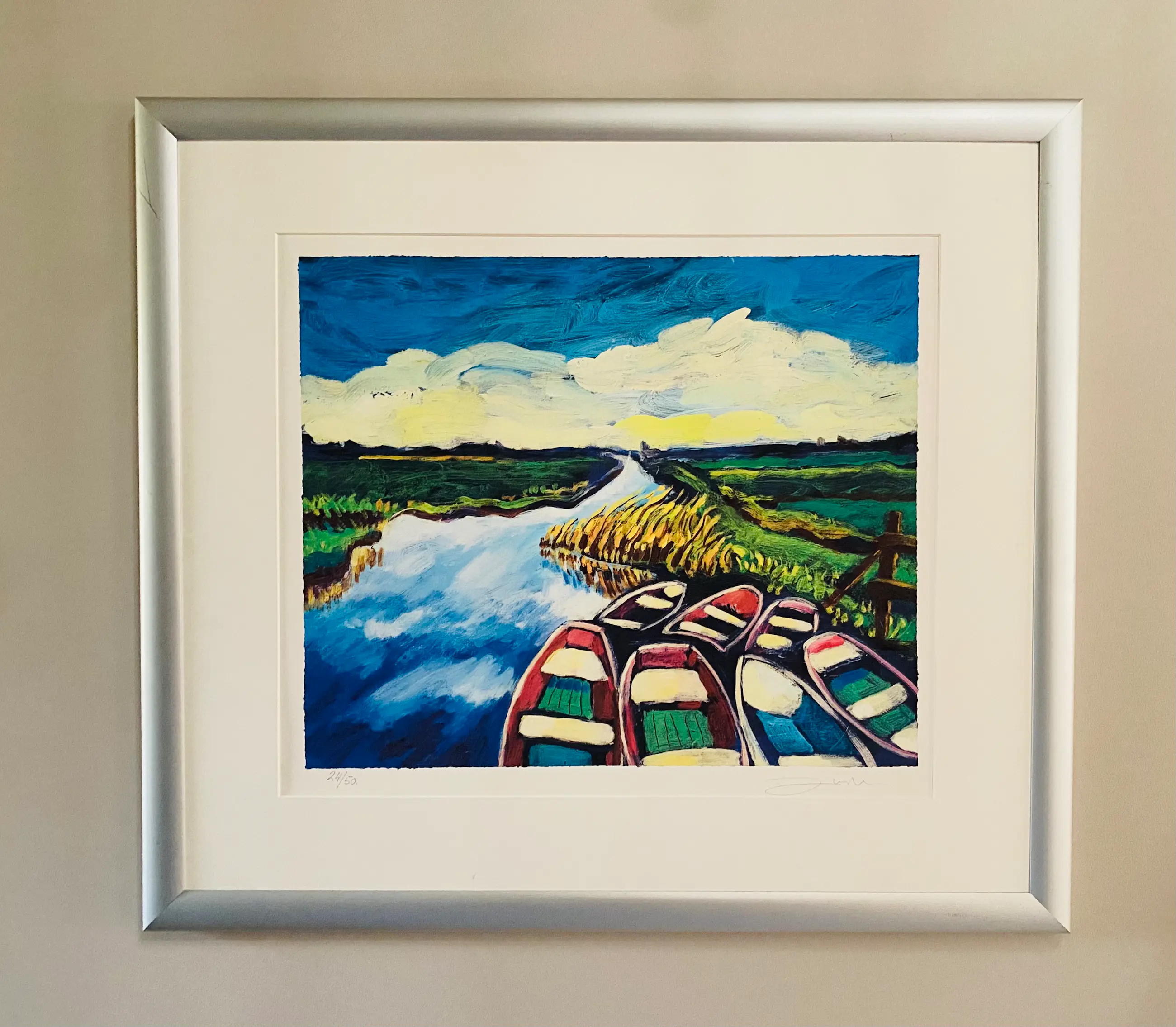 Mooie kleurrijke zeefdruk van Justus Donker genaamd “Bootjes”. De zeefdruk is ingelijst zonder glas. Lijst vertoont krasjes (zie foto’s) Licht beschadiging op het werk (zie foto).