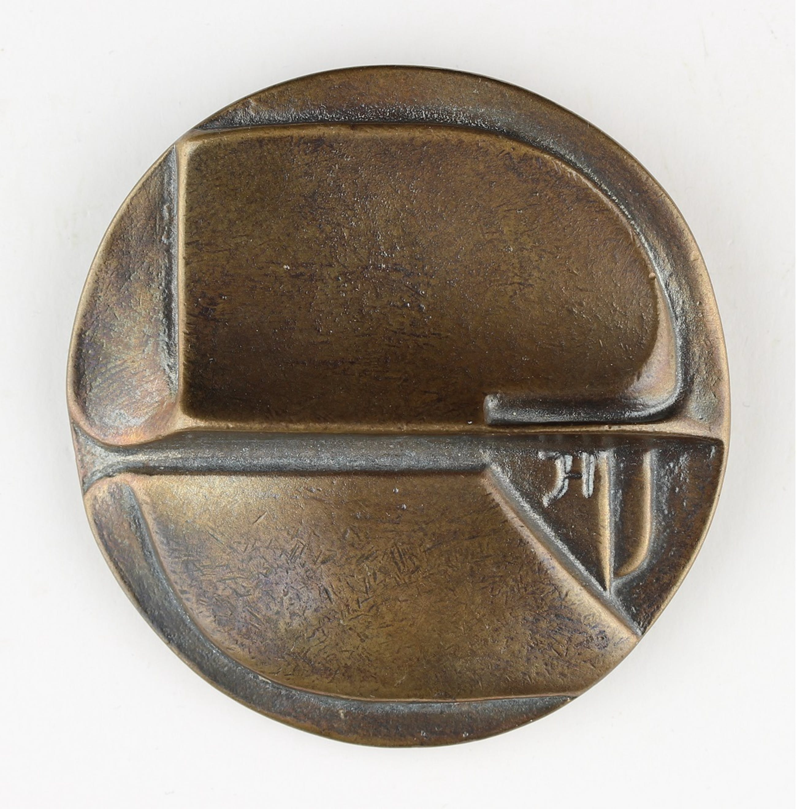 Het woord op afstand', de titel is van belang voor een goed begrip van Hollanders' vormgeving. De woorden zijn gereduceerd tot vier letters: het vignet van de vereniging dat verhoogd is aangebracht en liggend, op de horizontaal, gelezen moet worden. De signatuur van de beeldhouwer moet staand gelezen worden. Dan blijkt hoe cruciaal de horizontale inkerving is. Hij markeert de verhoging en de verdieping, vormen die op de keerzijde in hol en bol terugkeren. Het is dus niet alleen een scheiding tussen boven en onder maar ook tussen voor en achter. Dat is weer afhankelijk van welke kant men begint want er is geen hiërarchie tussen voor- en keerzijde. Steyn wijst er op hoezeer deze penning in het verlengde ligt van Hollanders' monumentale werk. Zijn beelden kenmerken zich door een in elkaar schuiven van vaak ronde vormen. Een beeld is gebonden aan zijn stand in de ruimte, een penning aan zijn vormgeving in de cirkel. Hollanders' beelden tonen vaak een verdichting van de vorm; hier bij zijn penning zien wij een uiteenschuiven binnen de gegeven cirkel. Een foto maakt niet goed duidelijk hoe sterk de tactile wisselwerking tussen beide zijden is. Steyn stelt: 'Het is een penning die in de hand gehouden moet worden om te ervaren hoe de abstracte beeldtaal vanuit de hand ontstaan is. Overal voelen we de de maat van een vinger, de druk van een duim, kneepjes van de hand. De penning heeft in het veld van de kunsten een sterk haiku-achtig karakter en is niet los te denken van natuurassociaties. Belangrijk is het geringe patina: als een vettige pasgevallen kastanje, glans'. #Louk Tilanus, Handzame Sculptuur