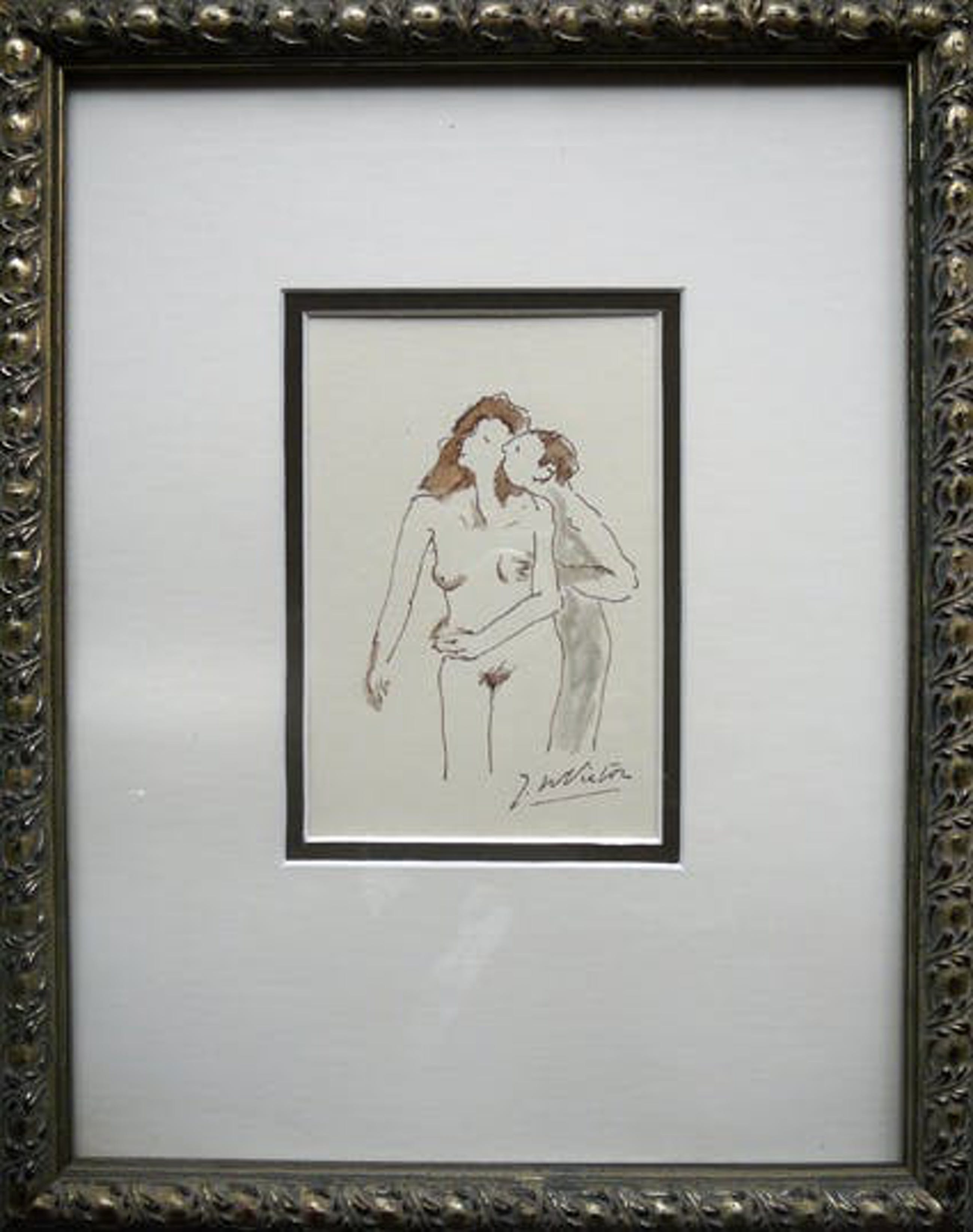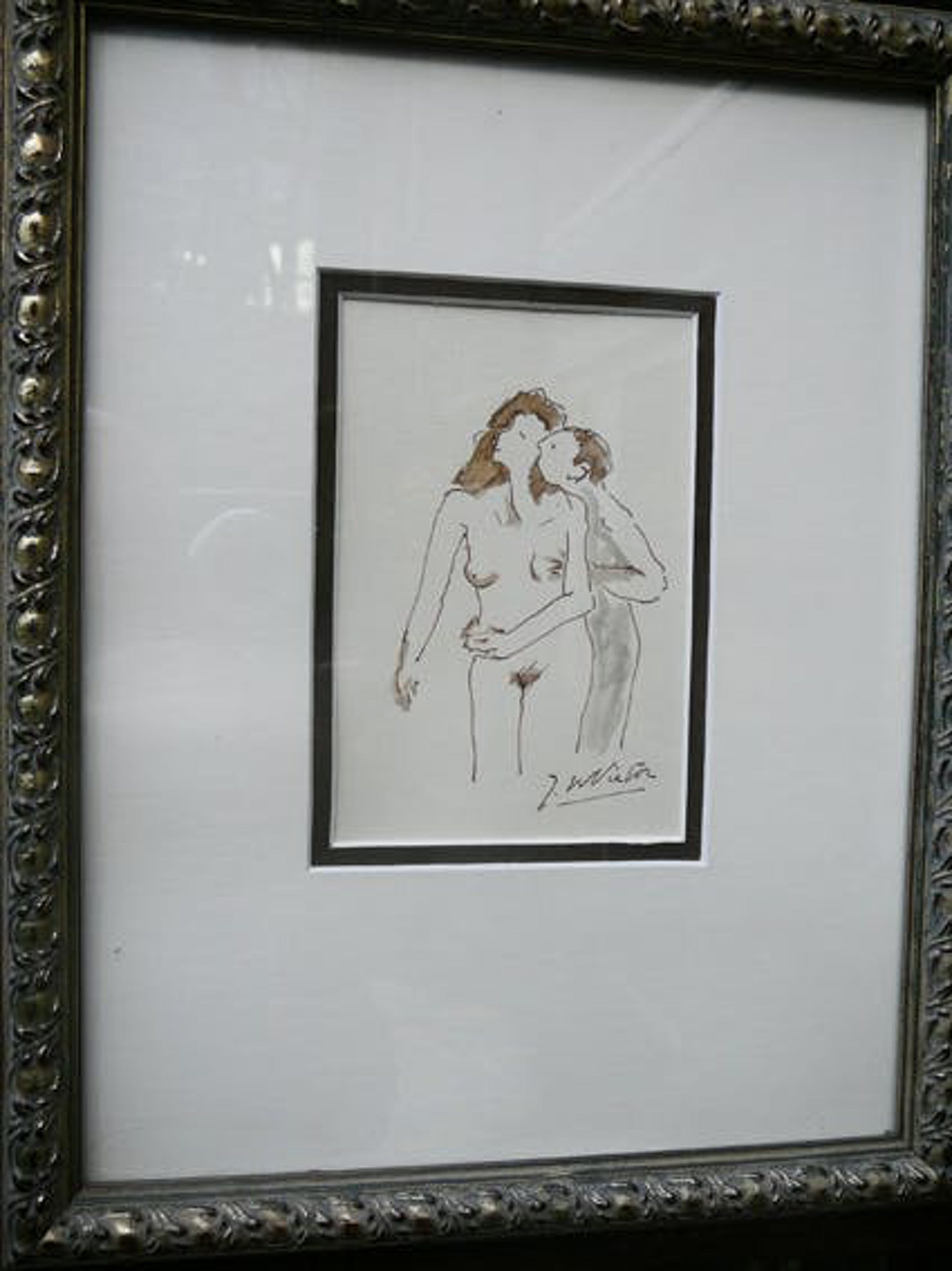 Subtiele pentekening van de Utrechtse kunstenaar J.W. Victor Hollanders. Achter dubbel passepartout en fraaie lijst. Wat reflectie op de foto's door het glas.