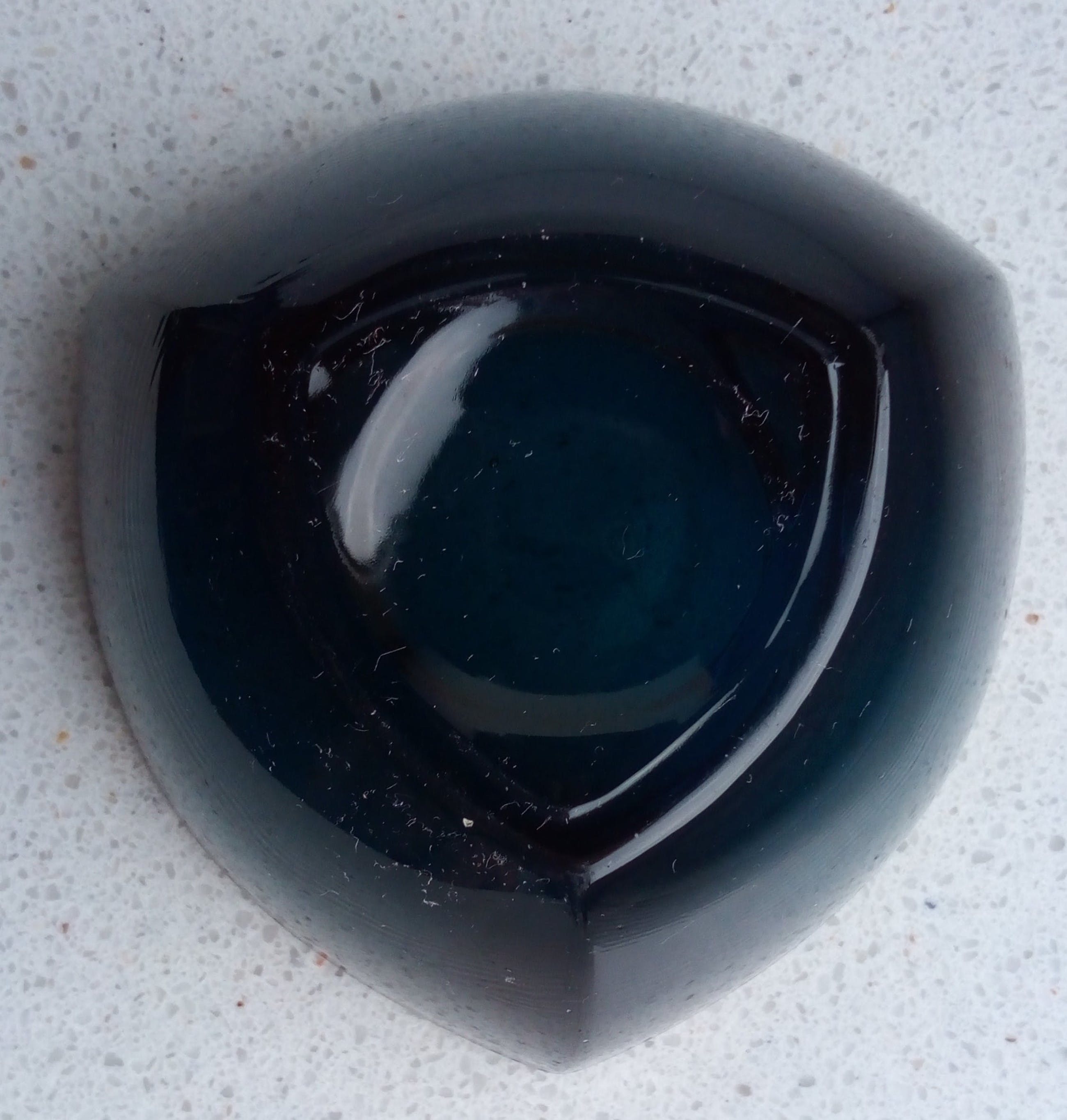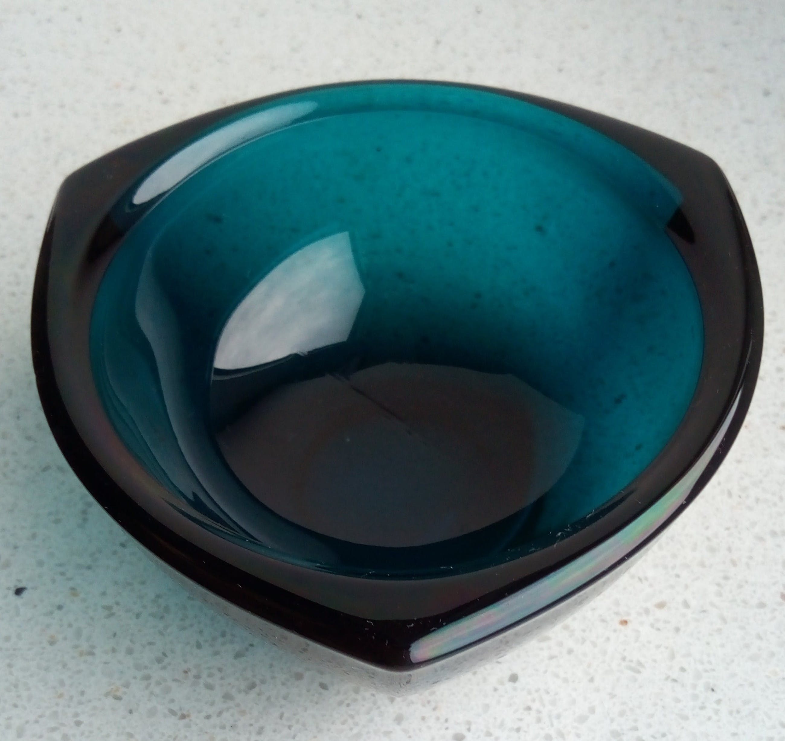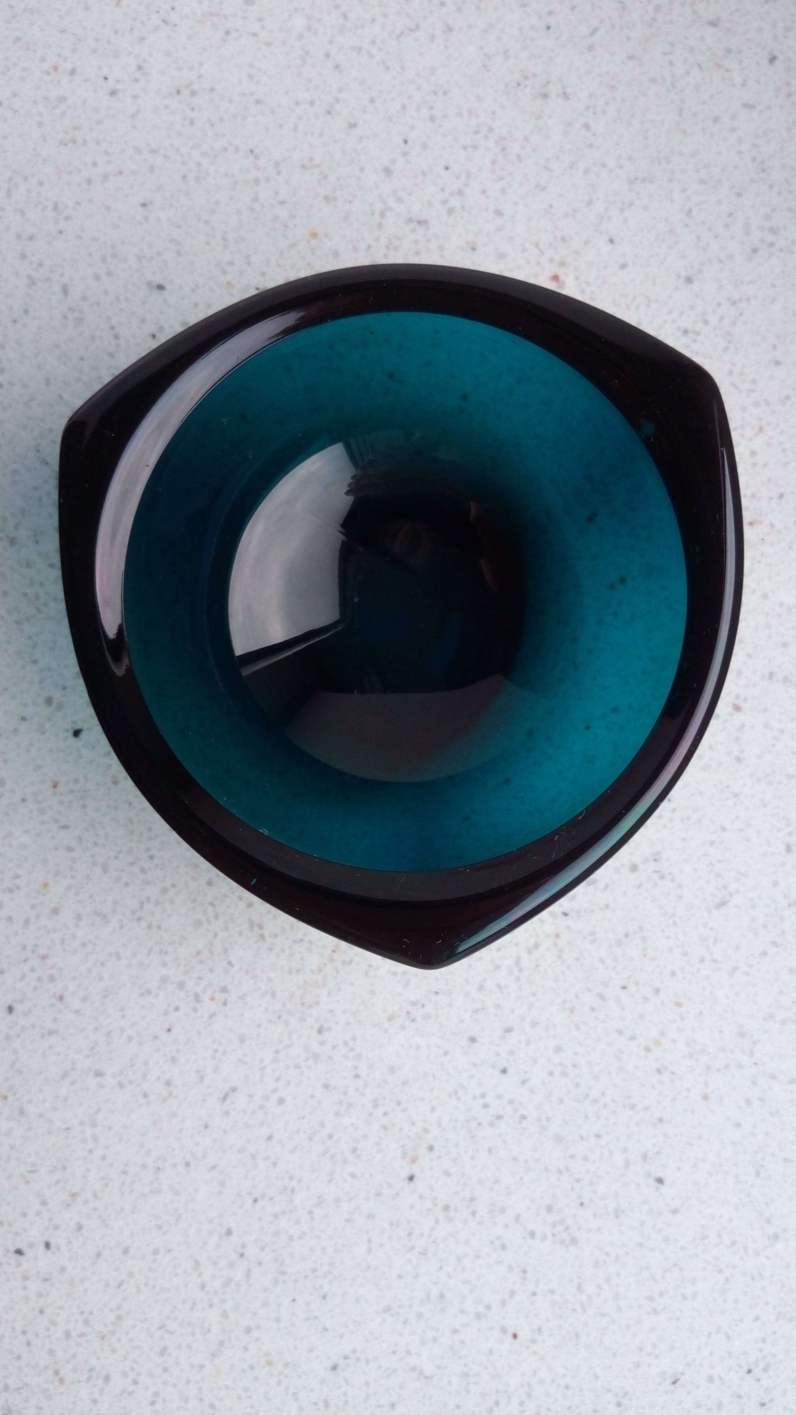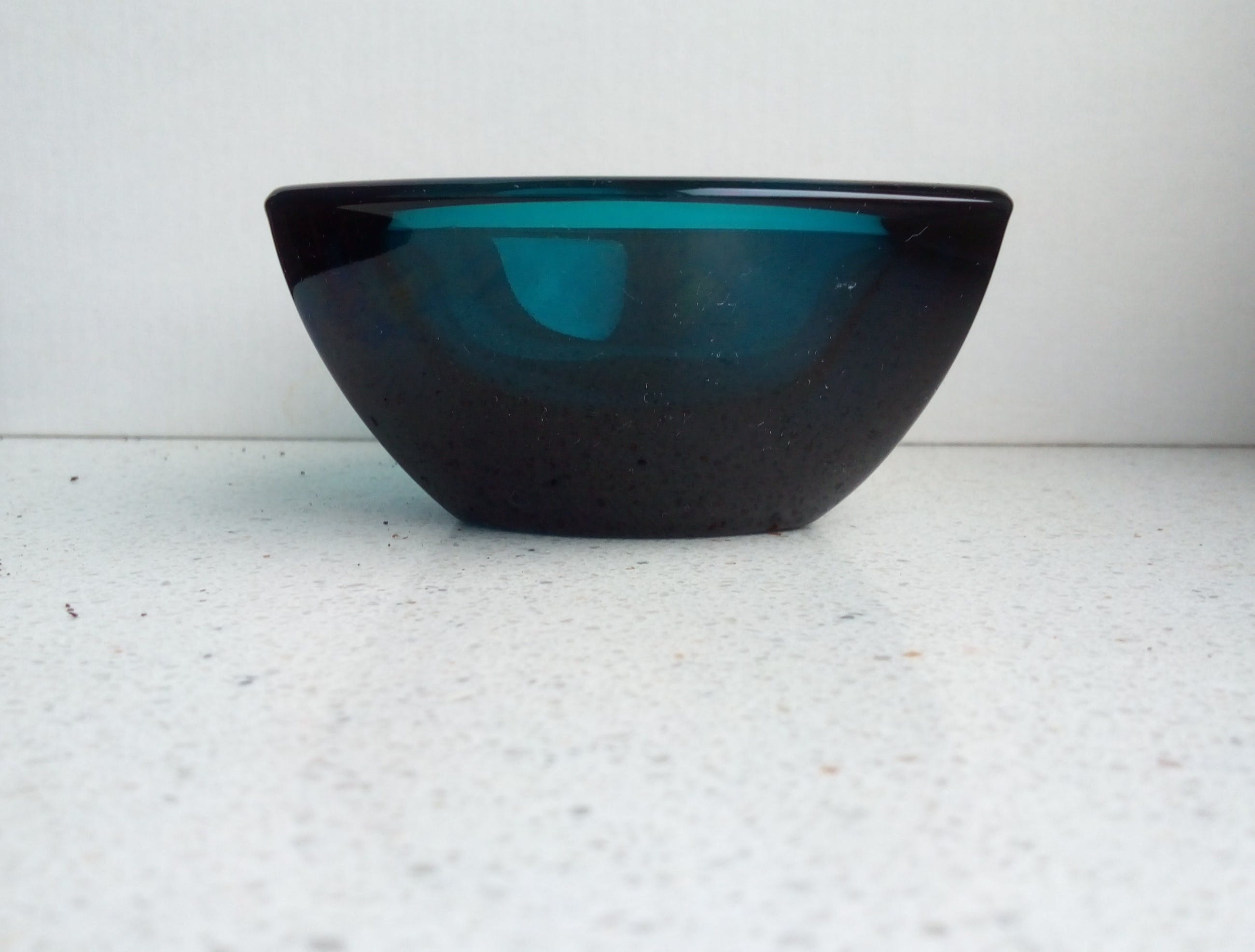 Het blauwe schaaltje is niet gekrast of gechipt. De foto laat stofdeeltjes zien